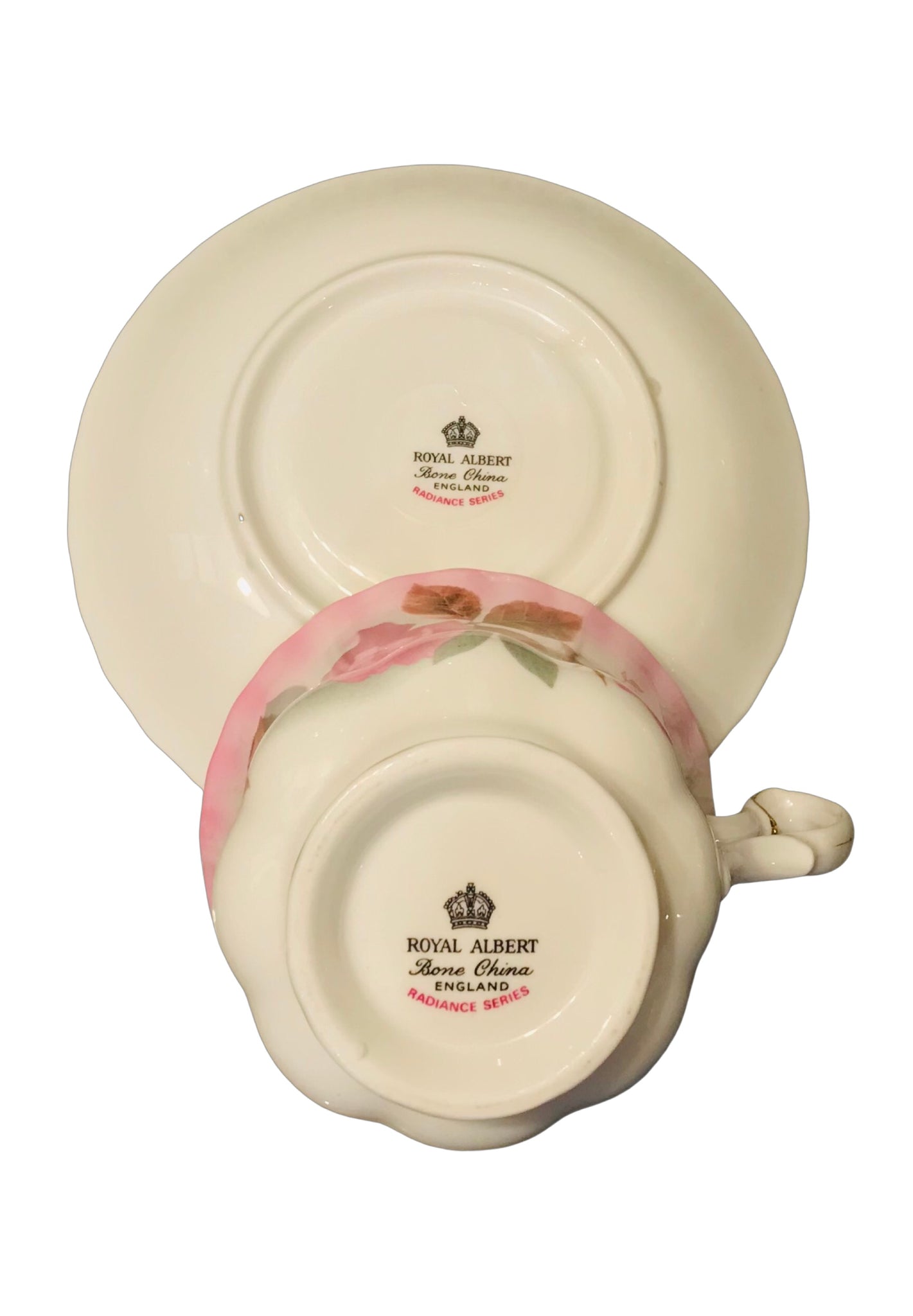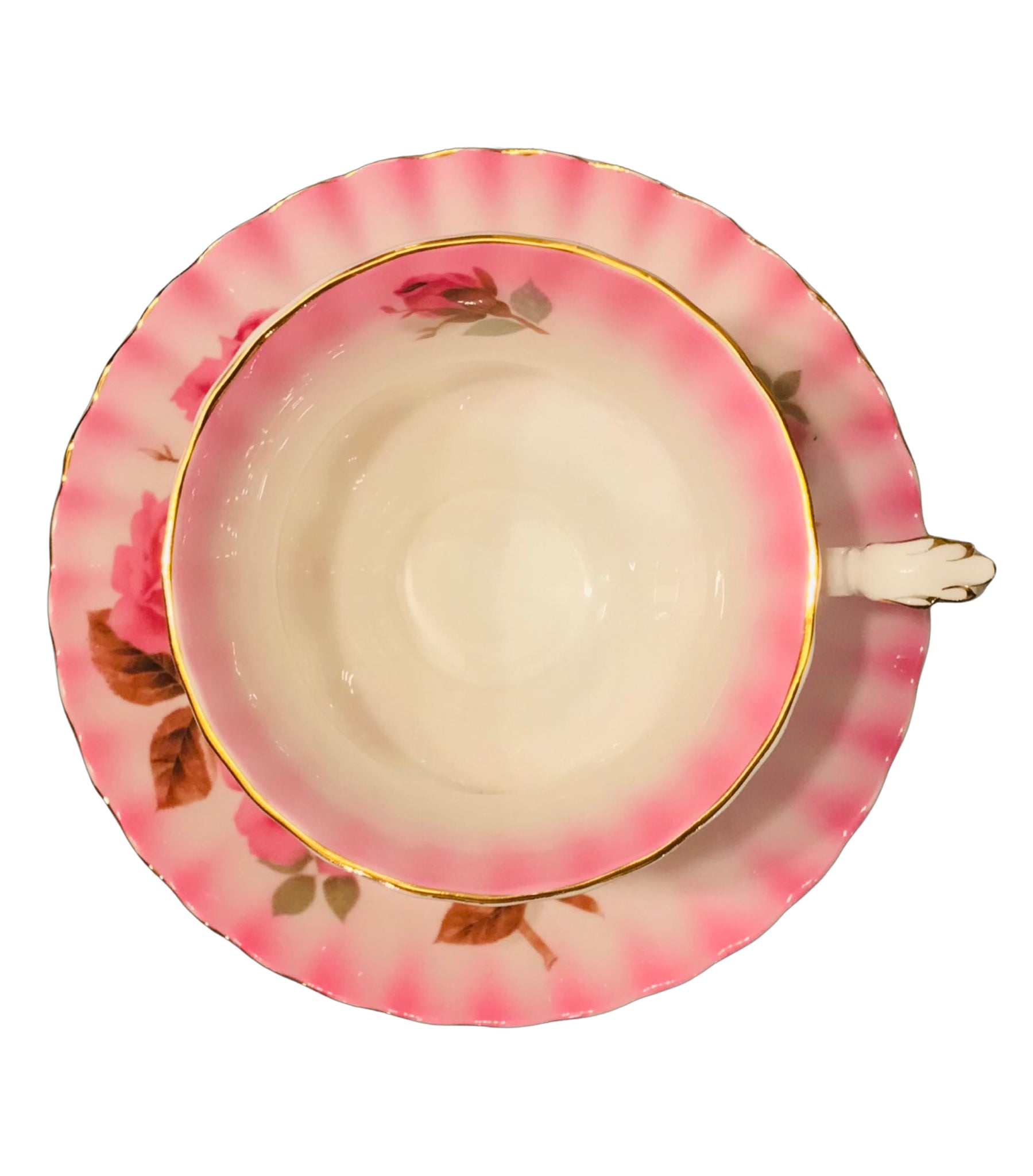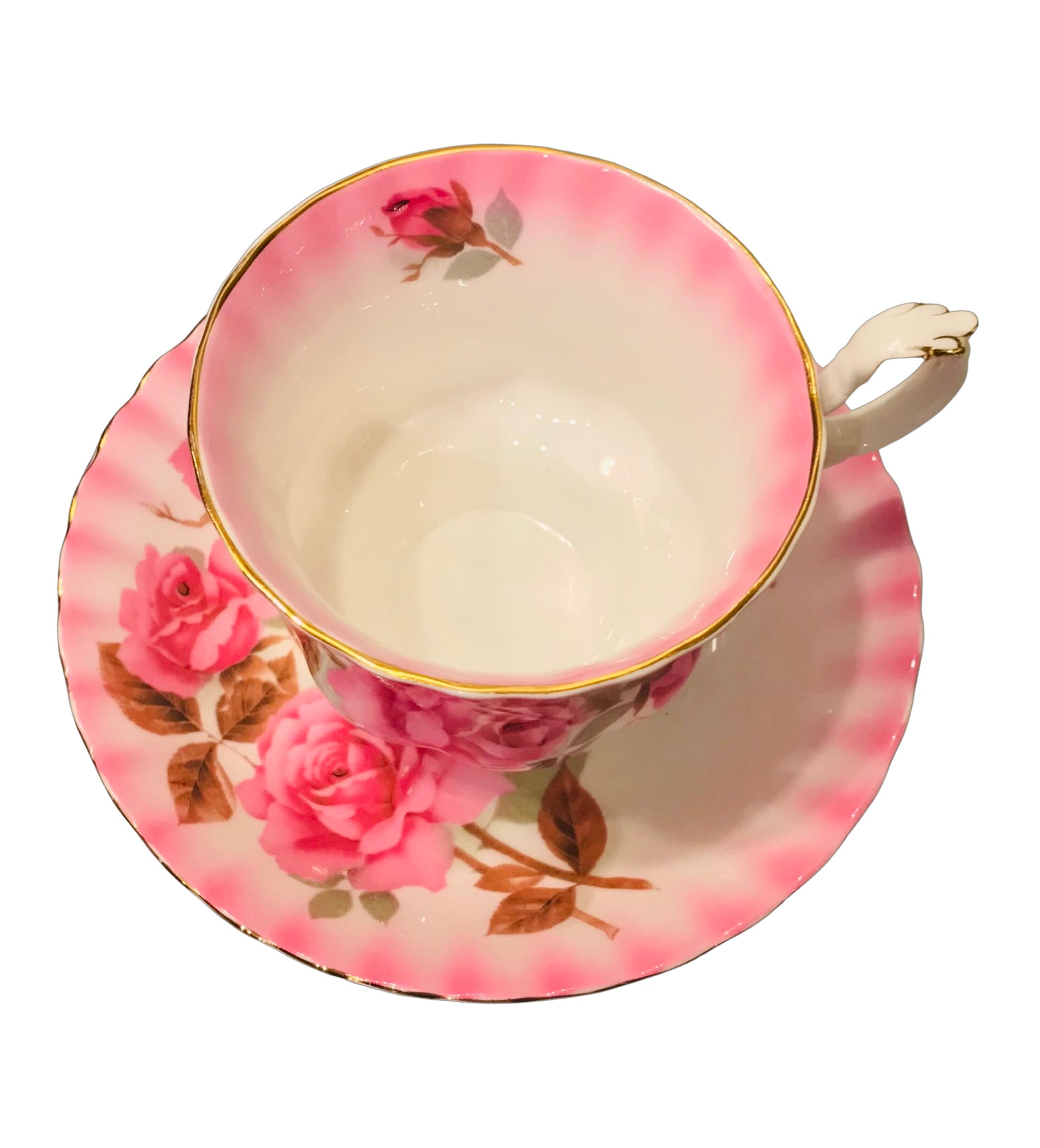 A gorgeous Royal Albert teacup and saucer from the Radiance Series. Pink ombré with large pink roses. Gold detailing and trim. Made in England.