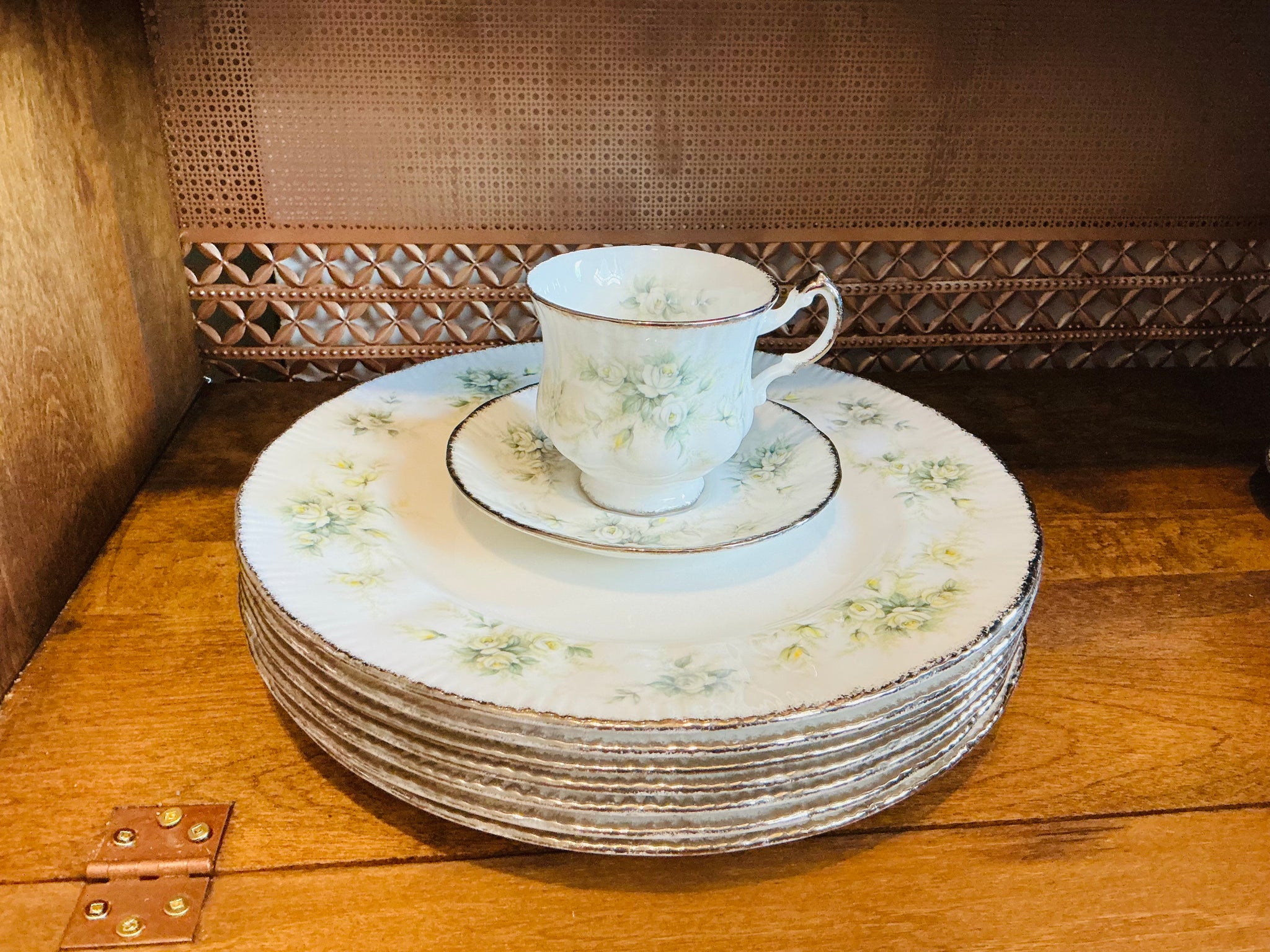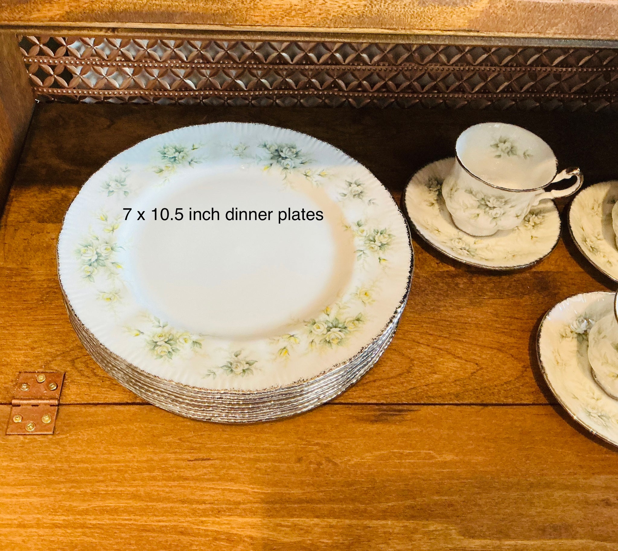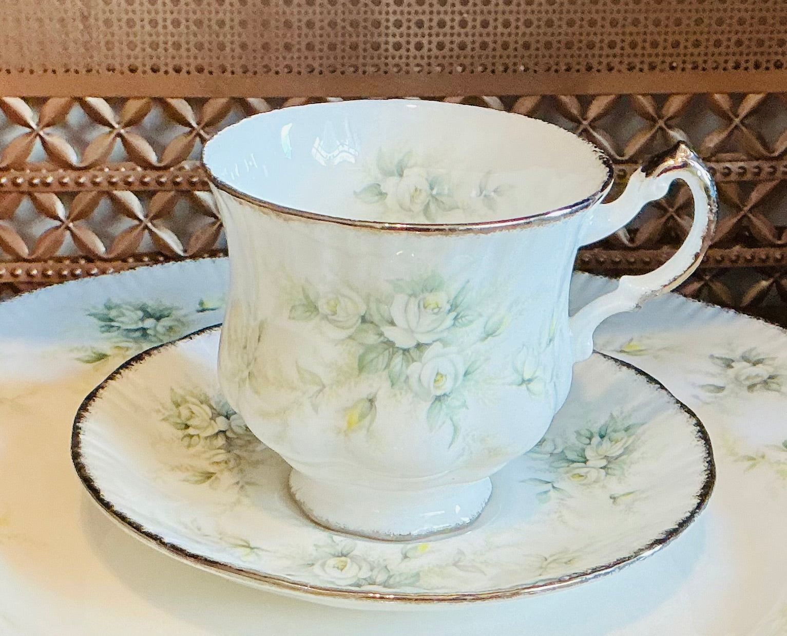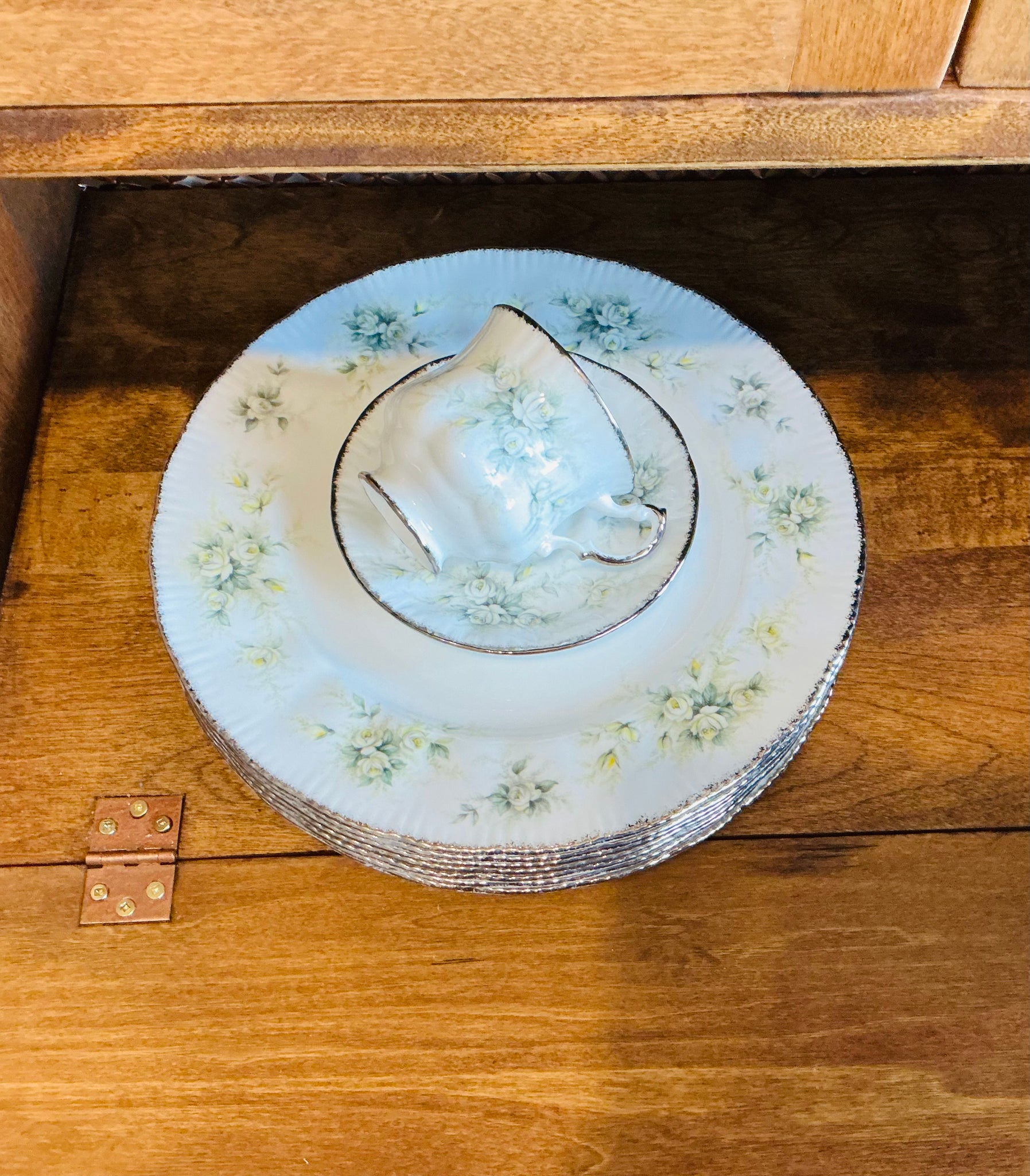 This is an absolutely romantic Paragon pattern. A perfect engagement, wedding shower, wedding or silver anniversary gift! The pattern is “First Love”. The pedestal teacup and saucer and dinner plates have a crisp white background with sweet white, grey and yellow roses. Silver trim. Multiple sets available-priced individually.