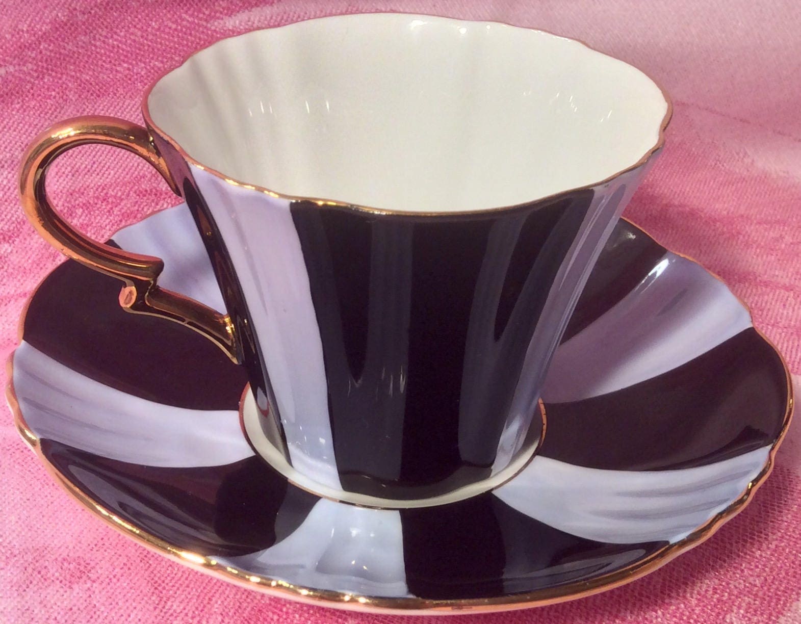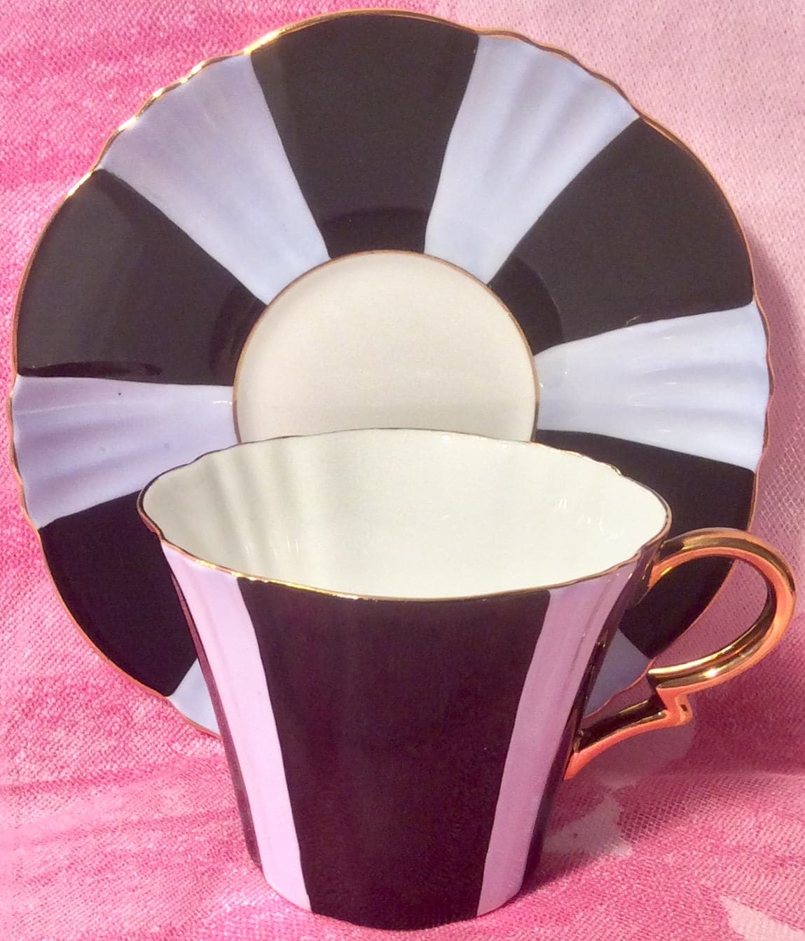 Very unusual ribbed Royal Standard harlequin teacup and saucer. Mauve and black panels. Gold handle and trim. Numbered 1228.
