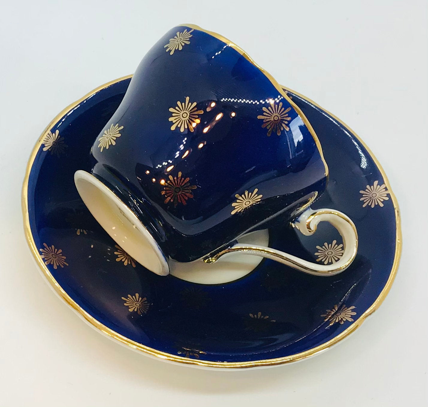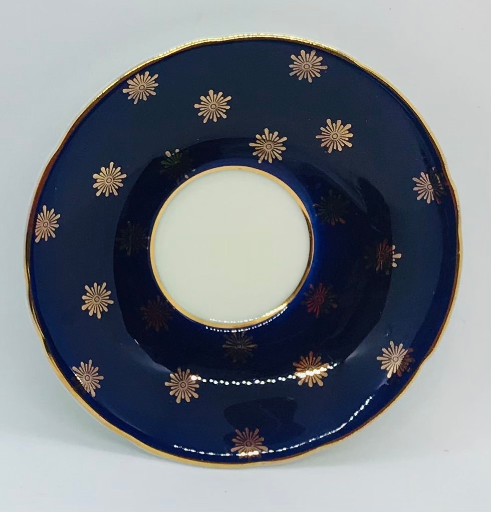Beautiful vintage Aynsley demitasse (not full sized teacup) cup and saucer. Cobalt blue with gold detailing and trim. A lovely addition for Aynsley collectors.