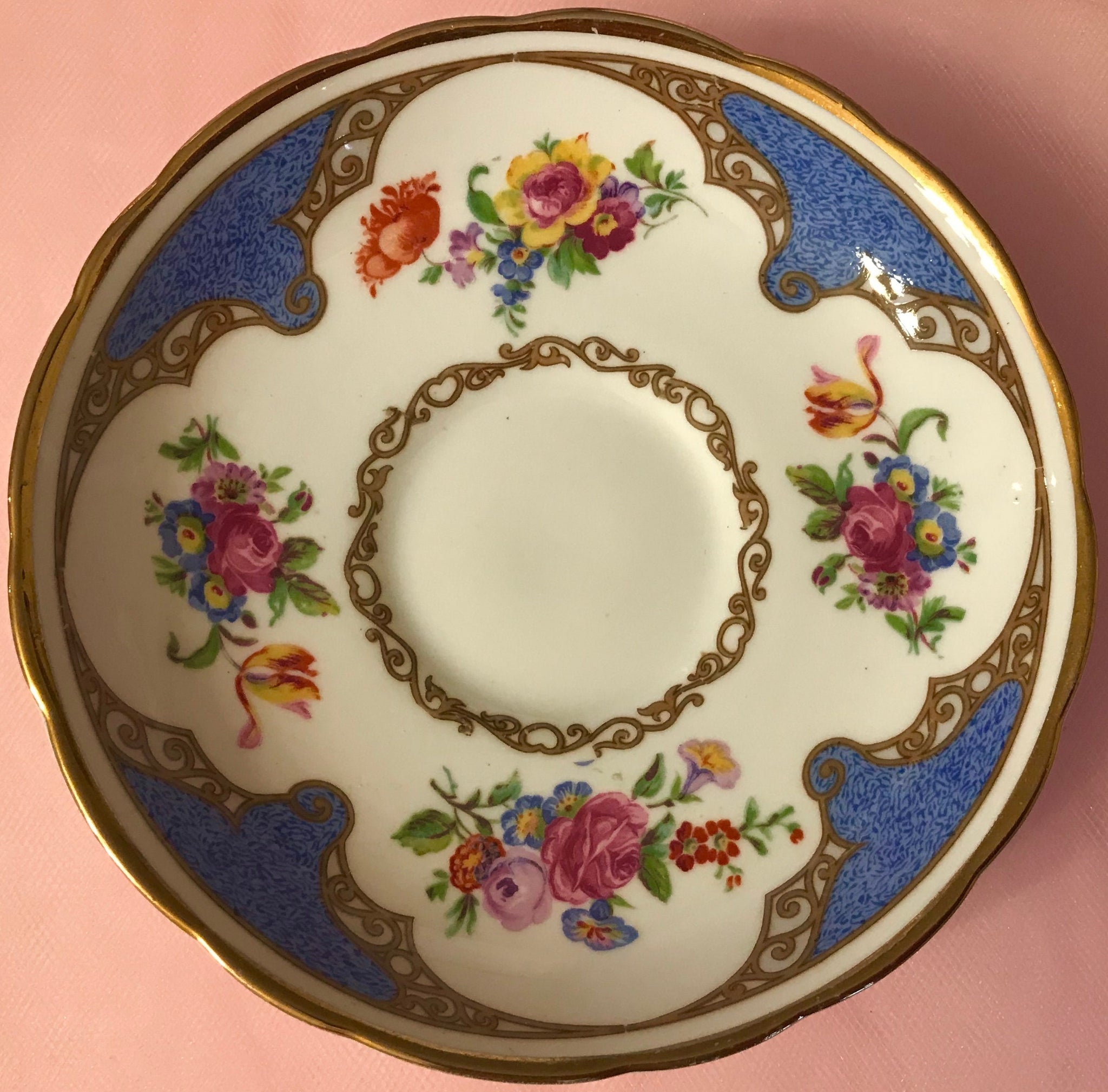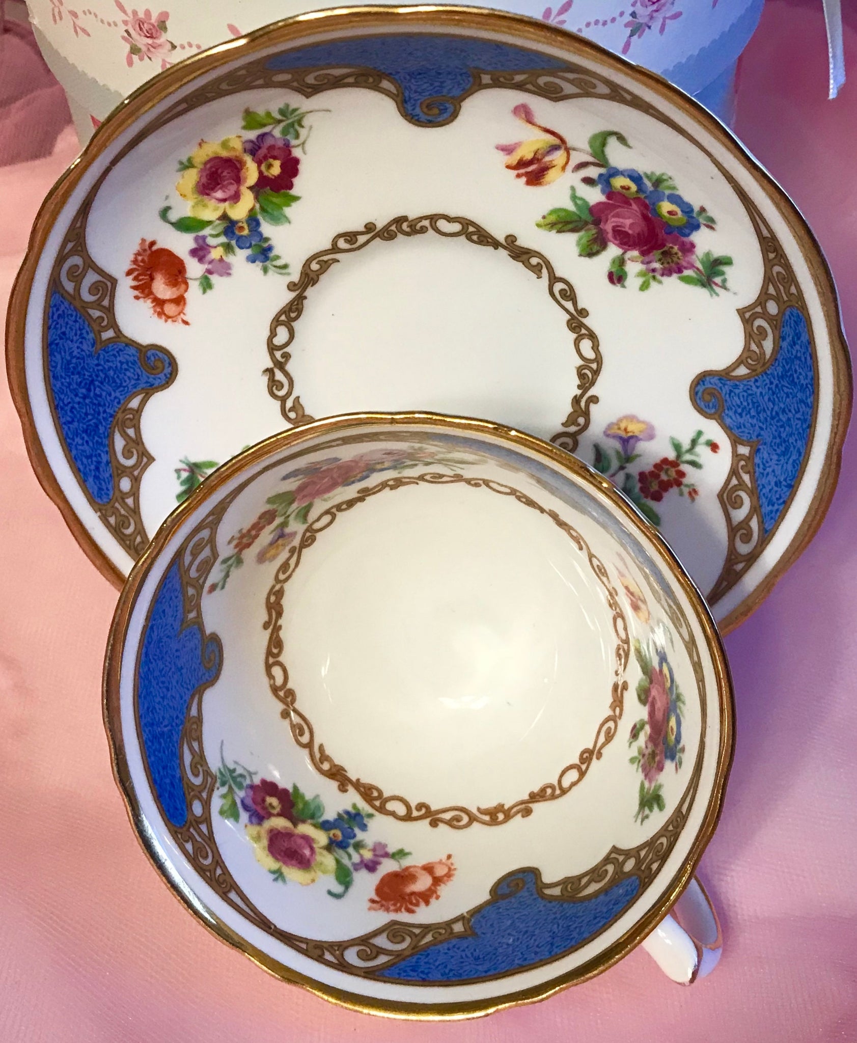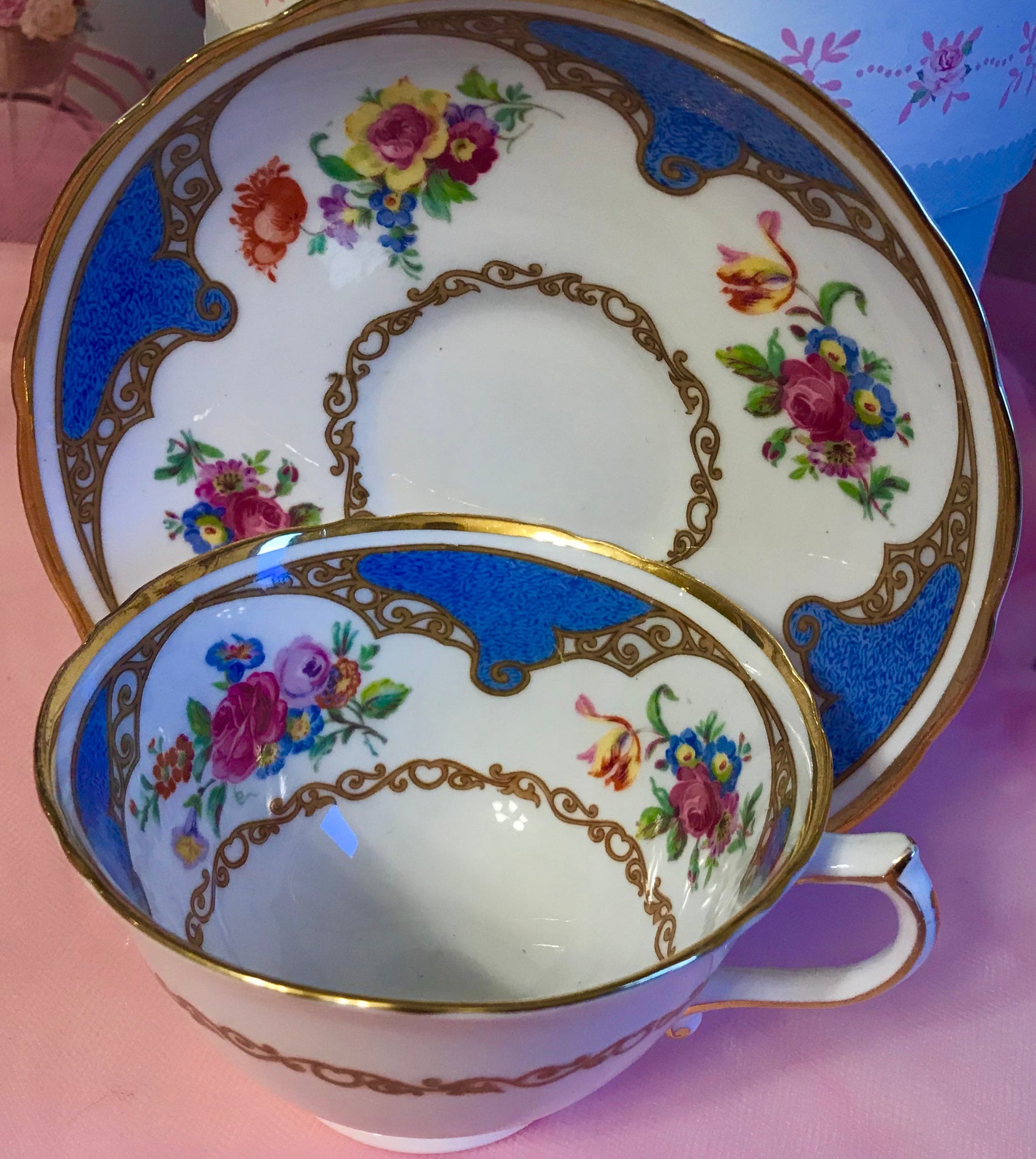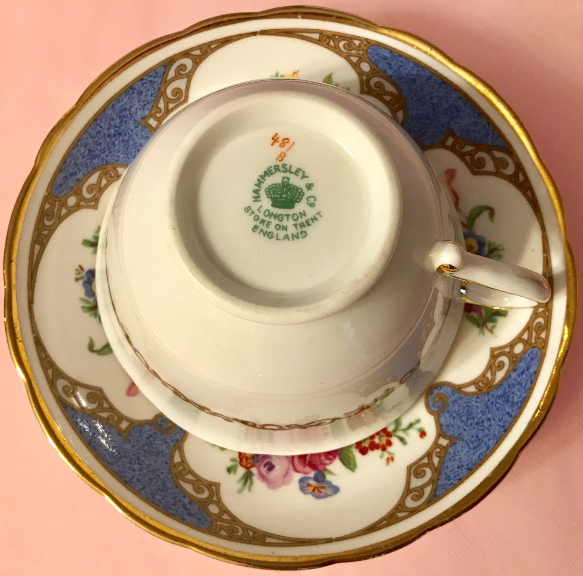 So stellar! Hammersley teacup and saucer. Beautiful blue edging on white, accented with romantic little floral bouquets. Numbered 481 B. Longton Stoke On Trent England. Trimmed in stunning gold!