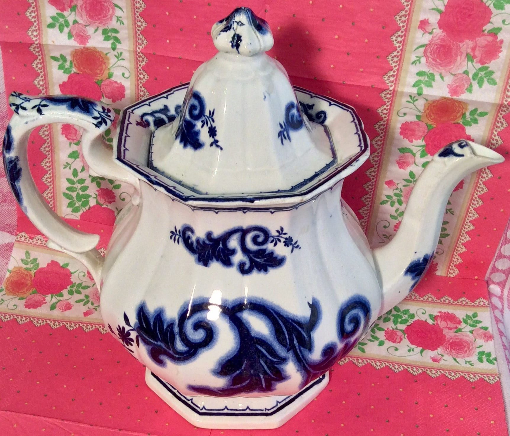 Flow Blue china collectors! This is a stunning teapot from 1845 in excellent condition! 172 years old! Staffordshire teapot in a scroll pattern by Francis Morley. It doesn't get much better than this!