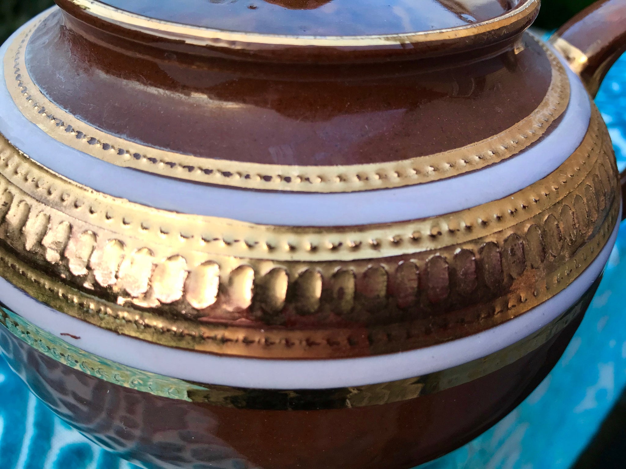 Yes, this teapot has flaws-it has a chip on the ring around the lid. Because it is brown, I didn’t even notice it-but yes, there is a chip. However, I love this teapot, and you will too! This teapot is dark brown with a gold raised relief band adjacent to thinner pink bands.