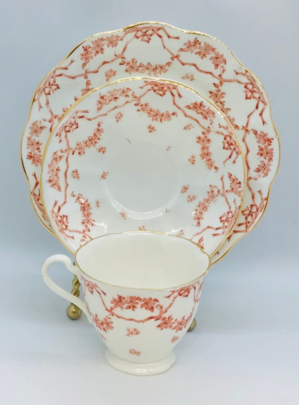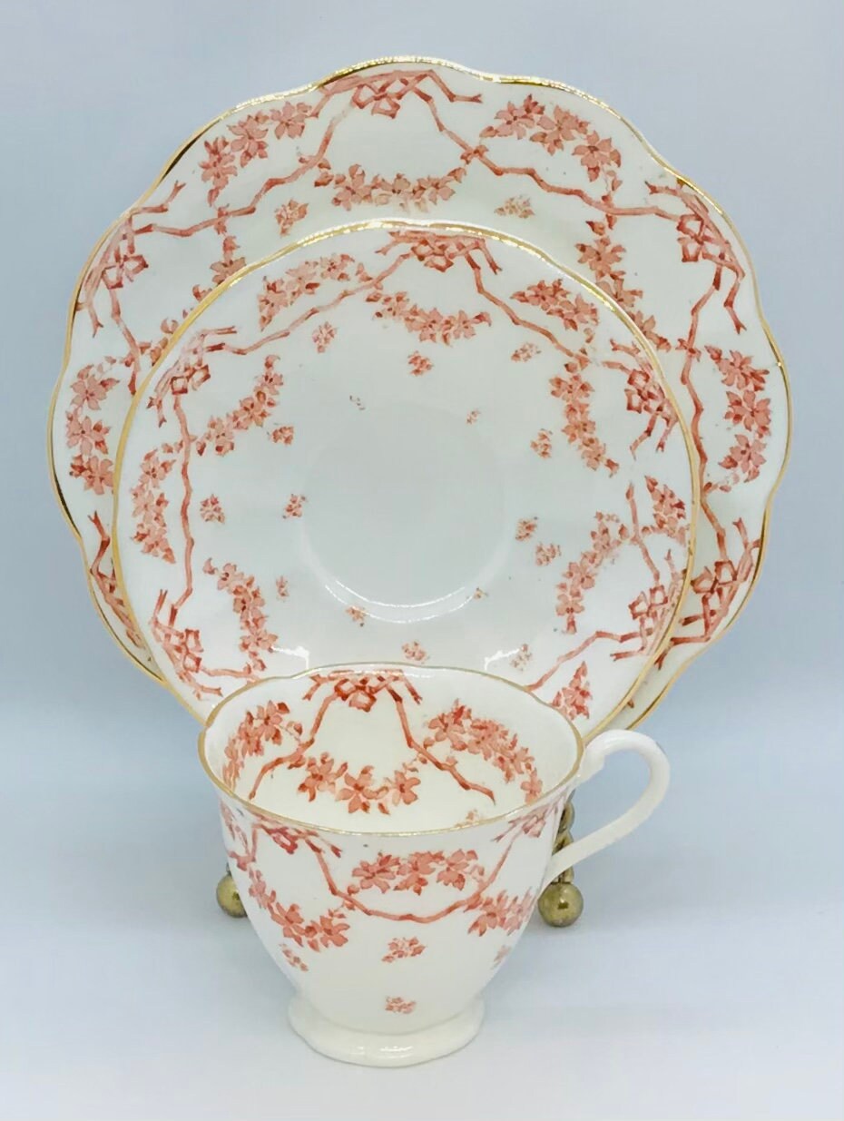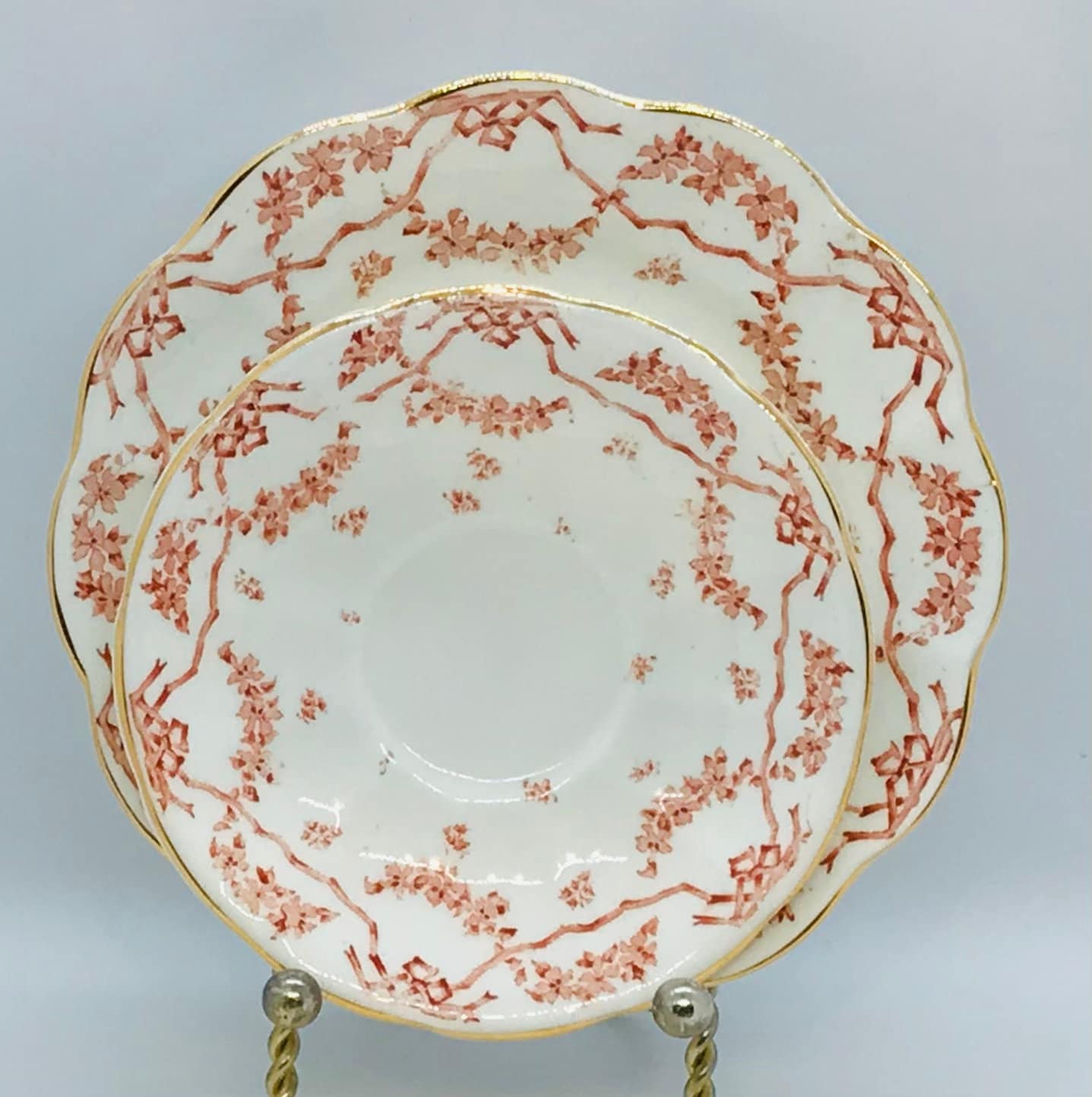 Circa 1890-1912-well over 100 years old! From Allertons China, made in England-a lovely trio-teacup, saucer and luncheon plate. The pattern is “Dora”-a white background with a rust coloured floral pattern with ribbon and bow swags. Trimmed in gold. So special to find china of this age in such fantastic shape! Multiple sets available-priced individually.