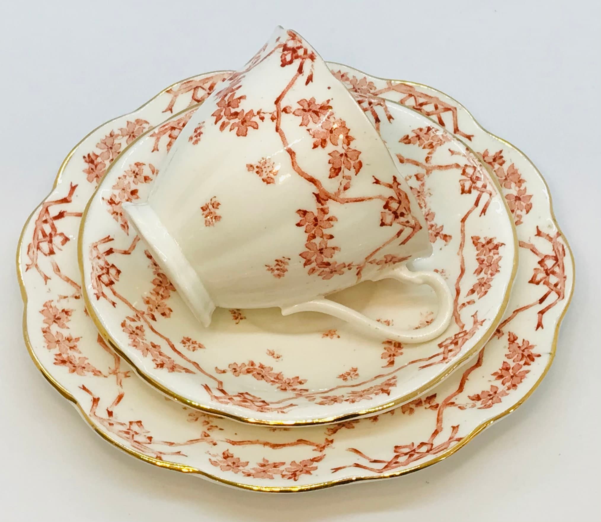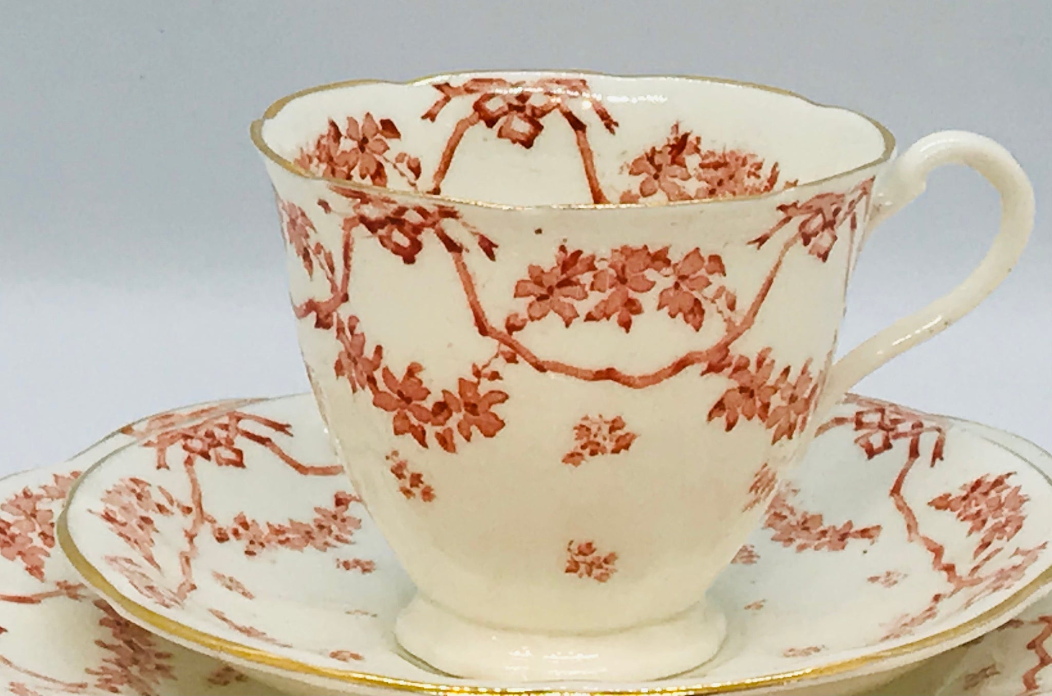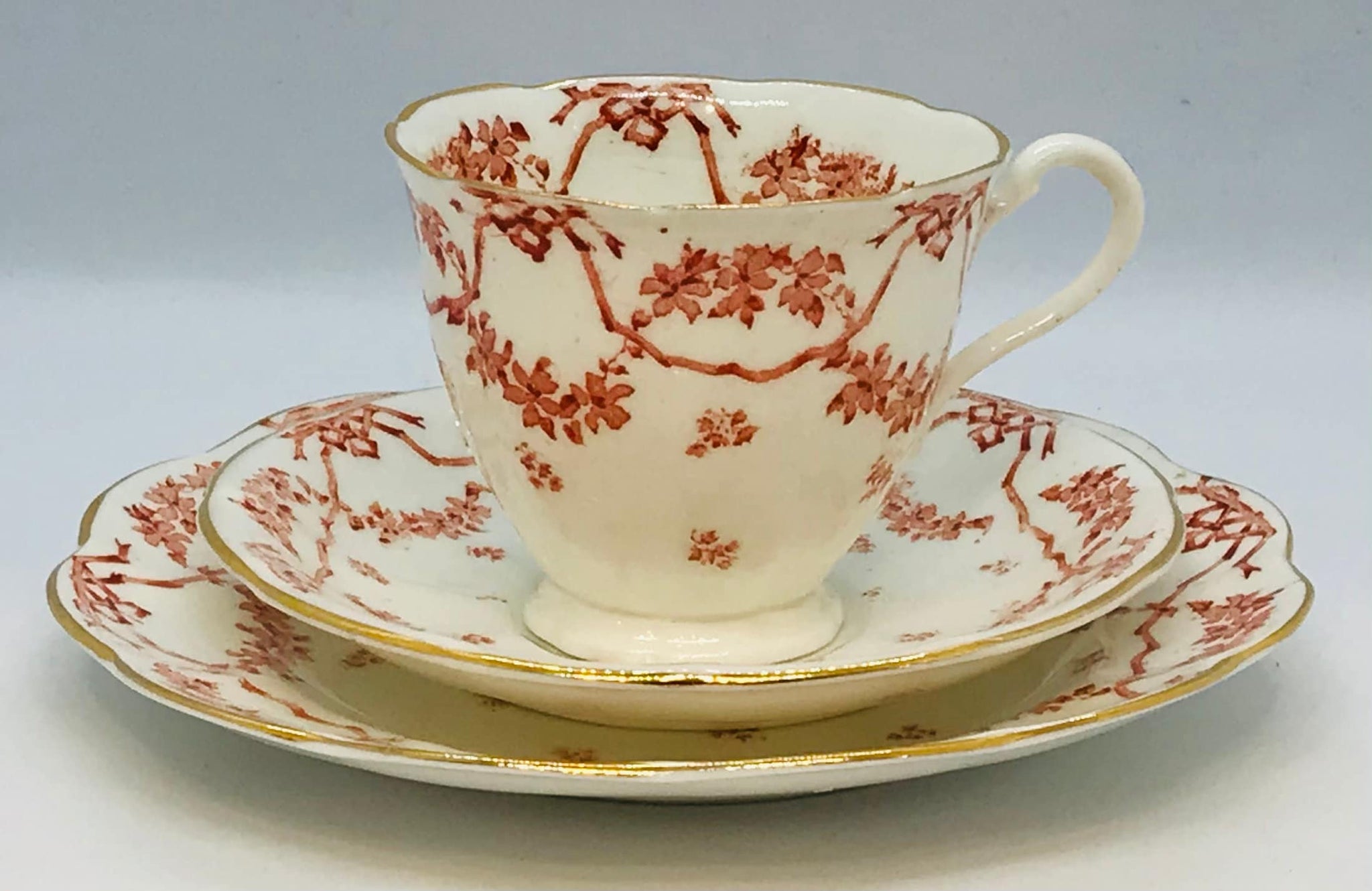 Circa 1890-1912-well over 100 years old! From Allertons China, made in England-a lovely trio-teacup, saucer and luncheon plate. The pattern is “Dora”-a white background with a rust coloured floral pattern with ribbon and bow swags. Trimmed in gold. So special to find china of this age in such fantastic shape! Multiple sets available-priced individually.
