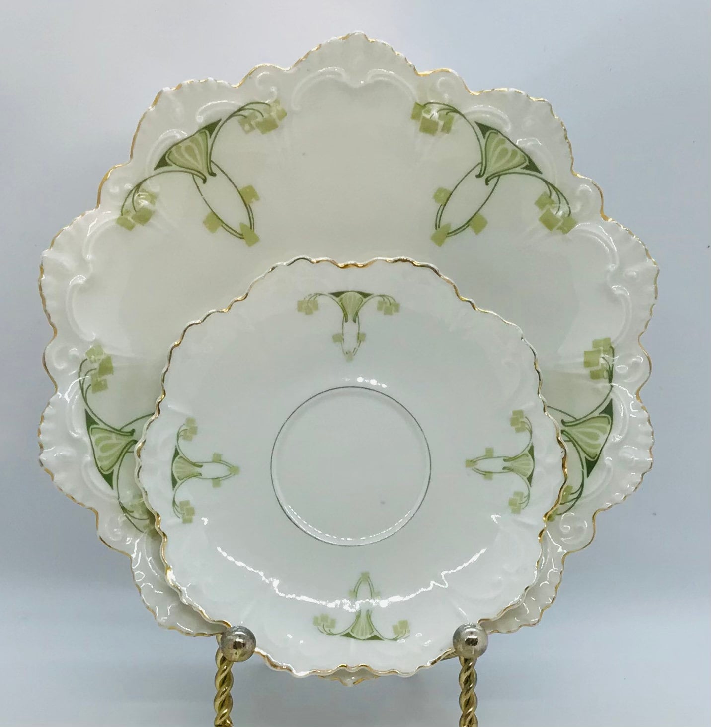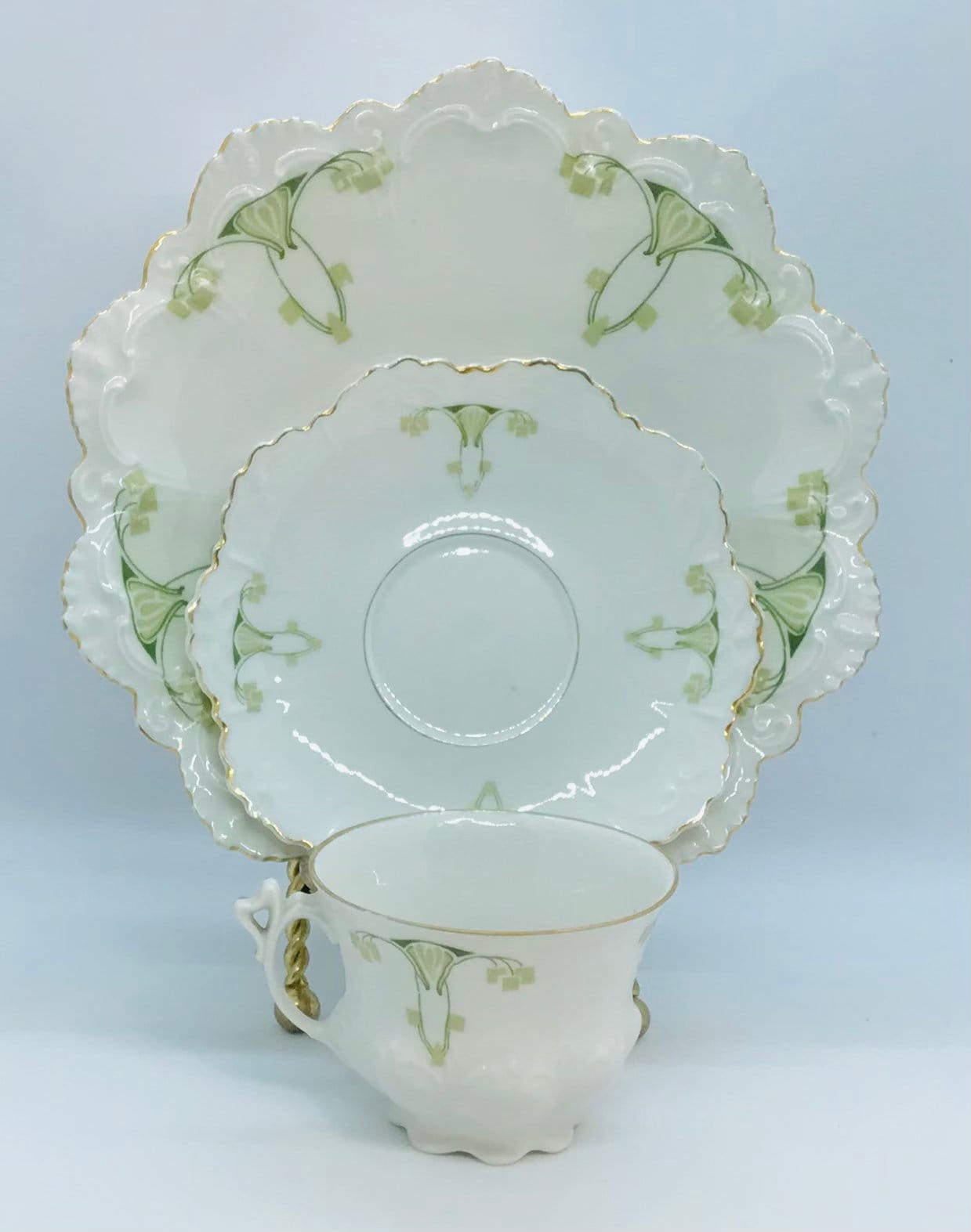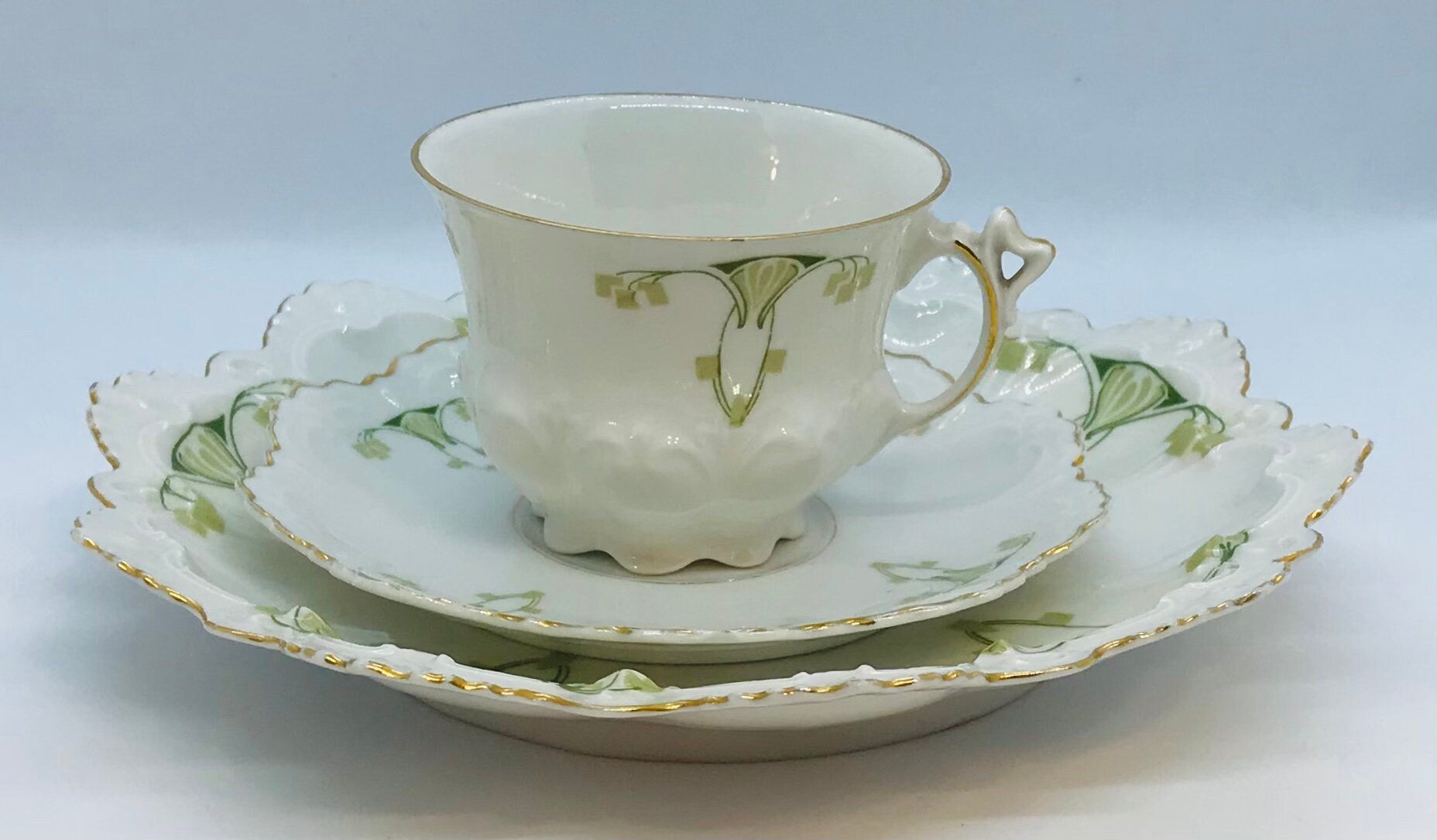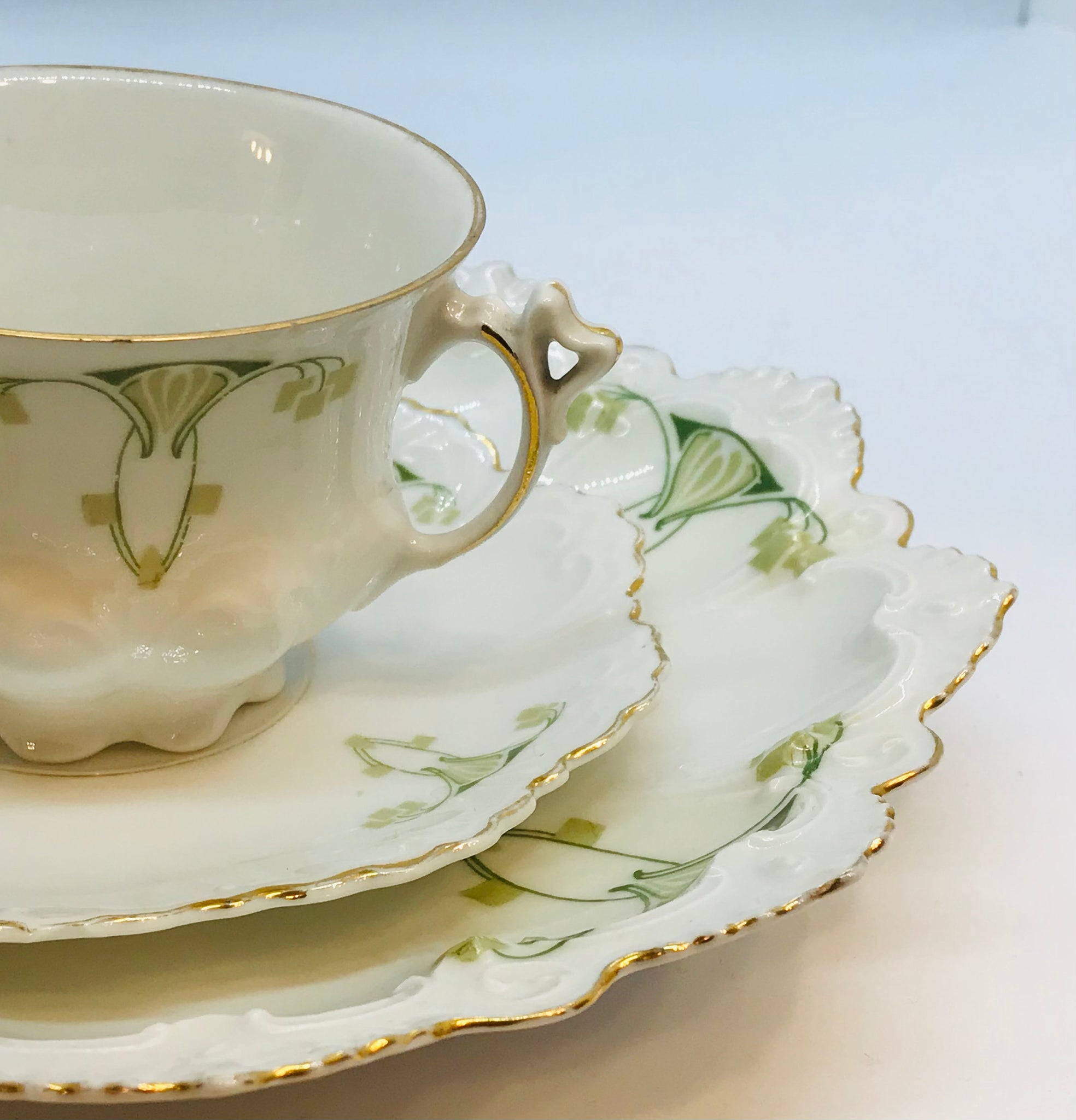 Circa 1884-1909. MZ (Moritz Zdekauer) Austria. A white background with elegant detailing in 2 shades of green. The edges are highly scalloped with raised embellishments and trimmed in gold. Teacup height: 2.5 in; width (handle to rim): 3.75 in; saucer diameter: 5.25 in; plate diameter: 7.75 in. I can’t believe this set is well over 100 years old, possibly over 130 years old!