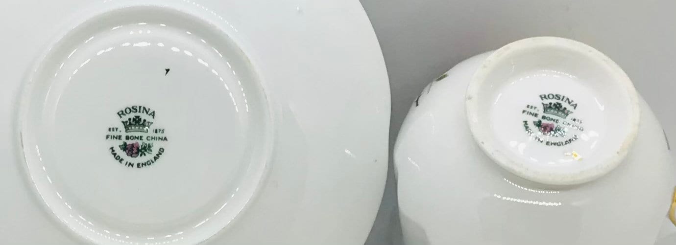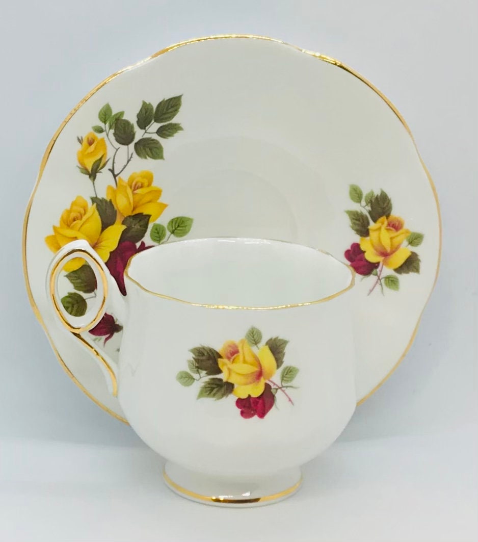 A lovely duo by Rosina China, made in England. A crisp white background with red and yellow roses and greenery. Gold trim.