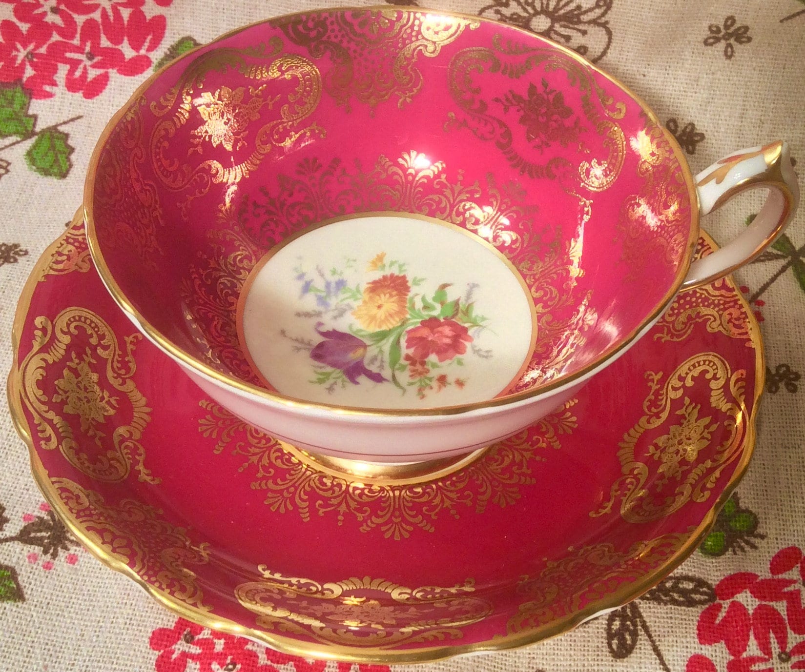 This is an absolutely stunning Paragon duo. At first I thought it was red but I think it is actually a deep pink. You will have to decide for yourself. Regardless-it is a stunner! The gold detailing is fantastic. In the centre there is a sweet floral bouquet. The saucer is decorated in the same way. Both the teacup and saucer are extra wide. It is numberedwhat looks to be A1251..
