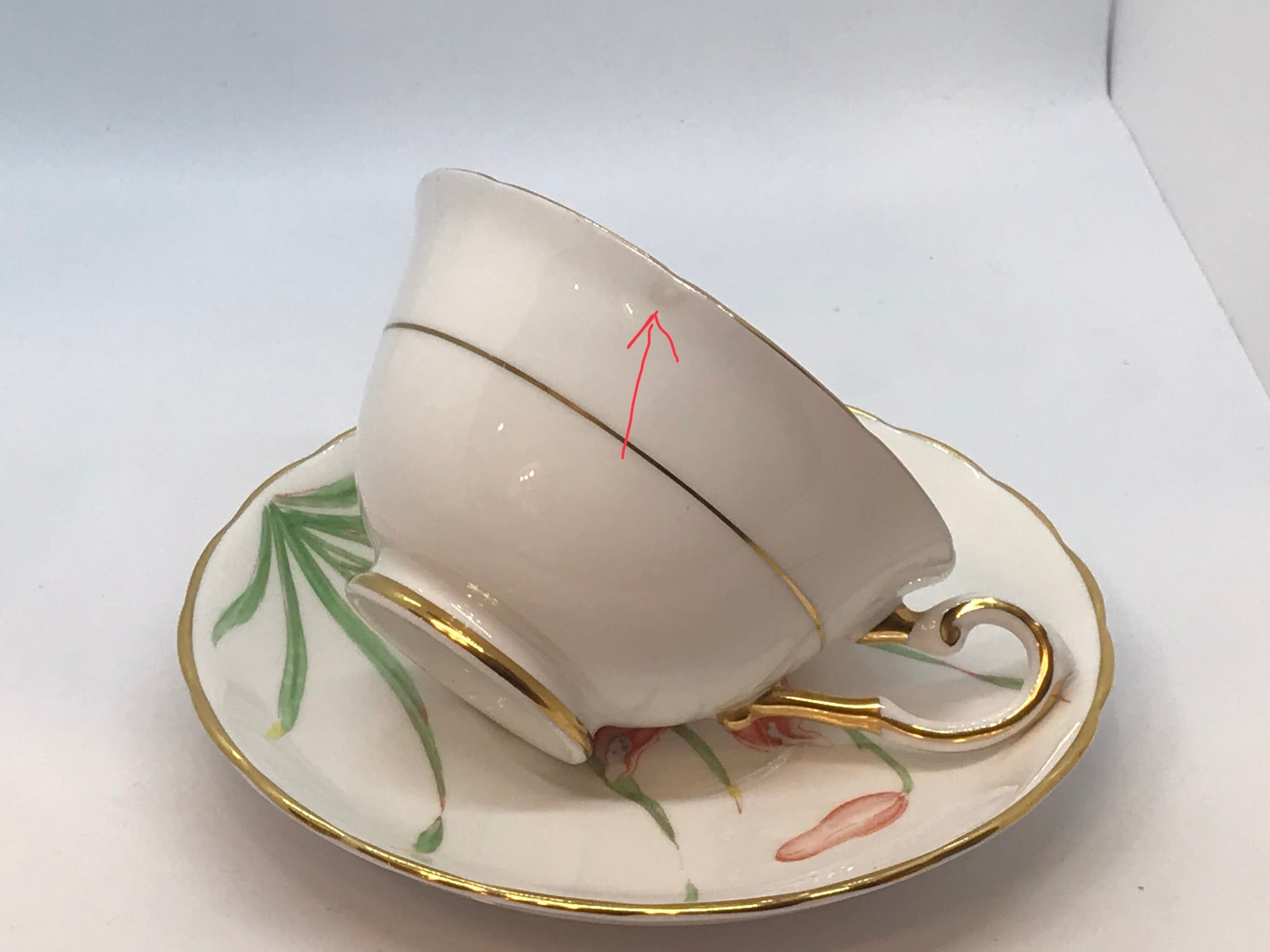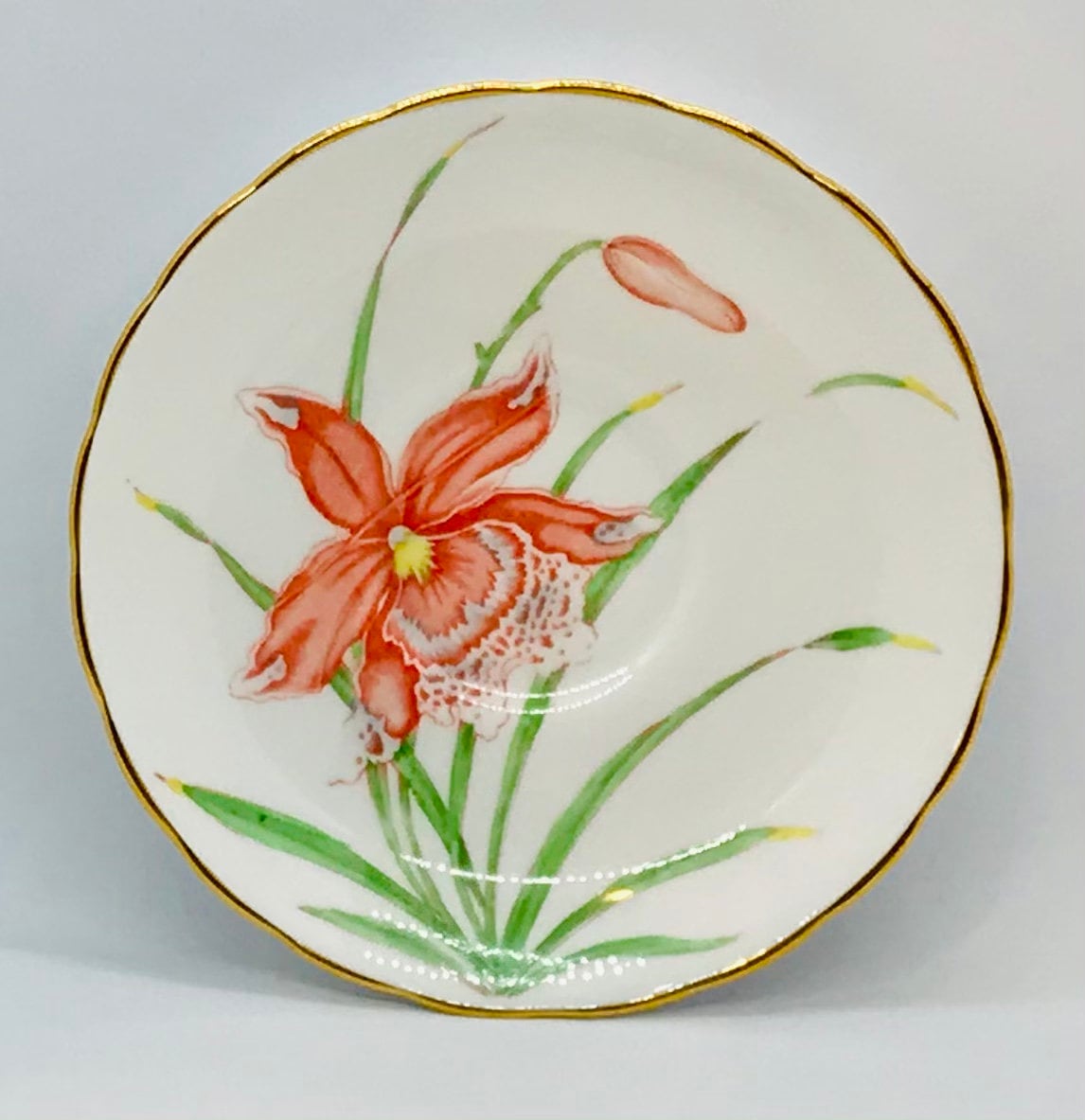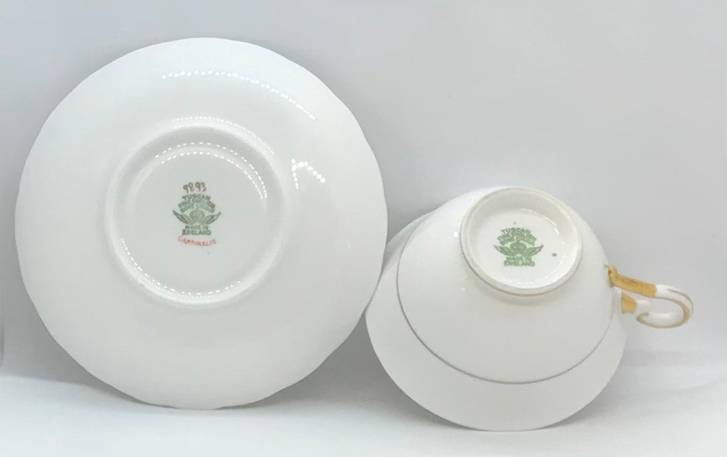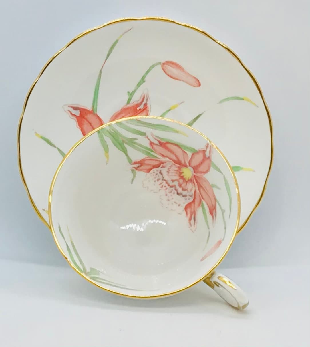 A beautiful teacup and saucer by Tuscan China, made in England. A crisp white background with peach, white and yellow orchids and elegant green stems. Gold trim. The pattern is Cardinalis. Numbered 9893.