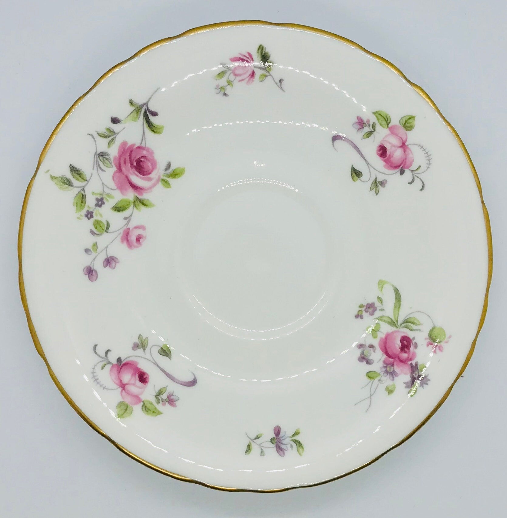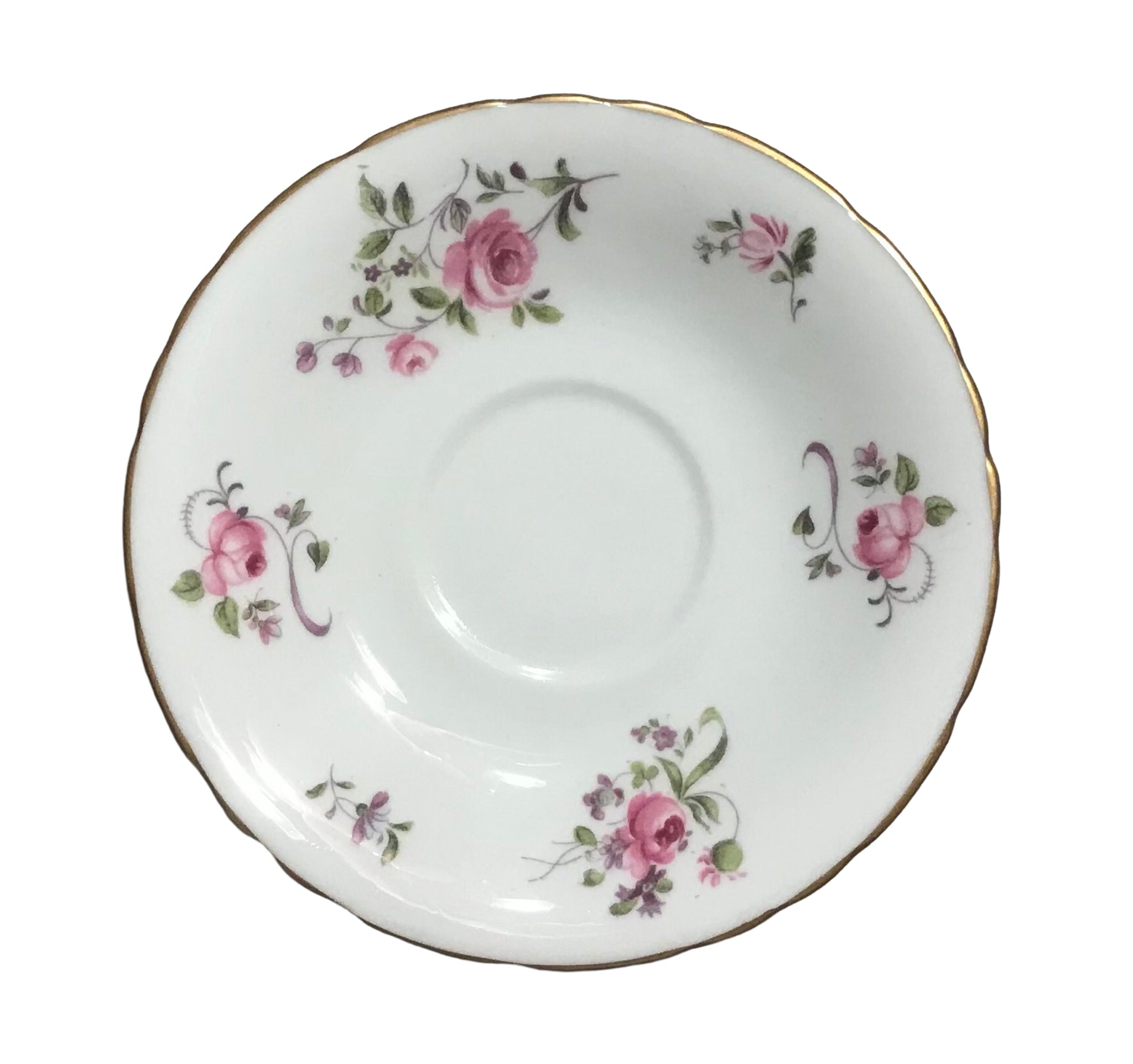 Totally enchanting: HM Sutherland teacup and saucer. Made in England. Lovely green foliage with sweet roses, and trimmed in gold. Scalloped edges. Numbered. Sweet simplicity!
