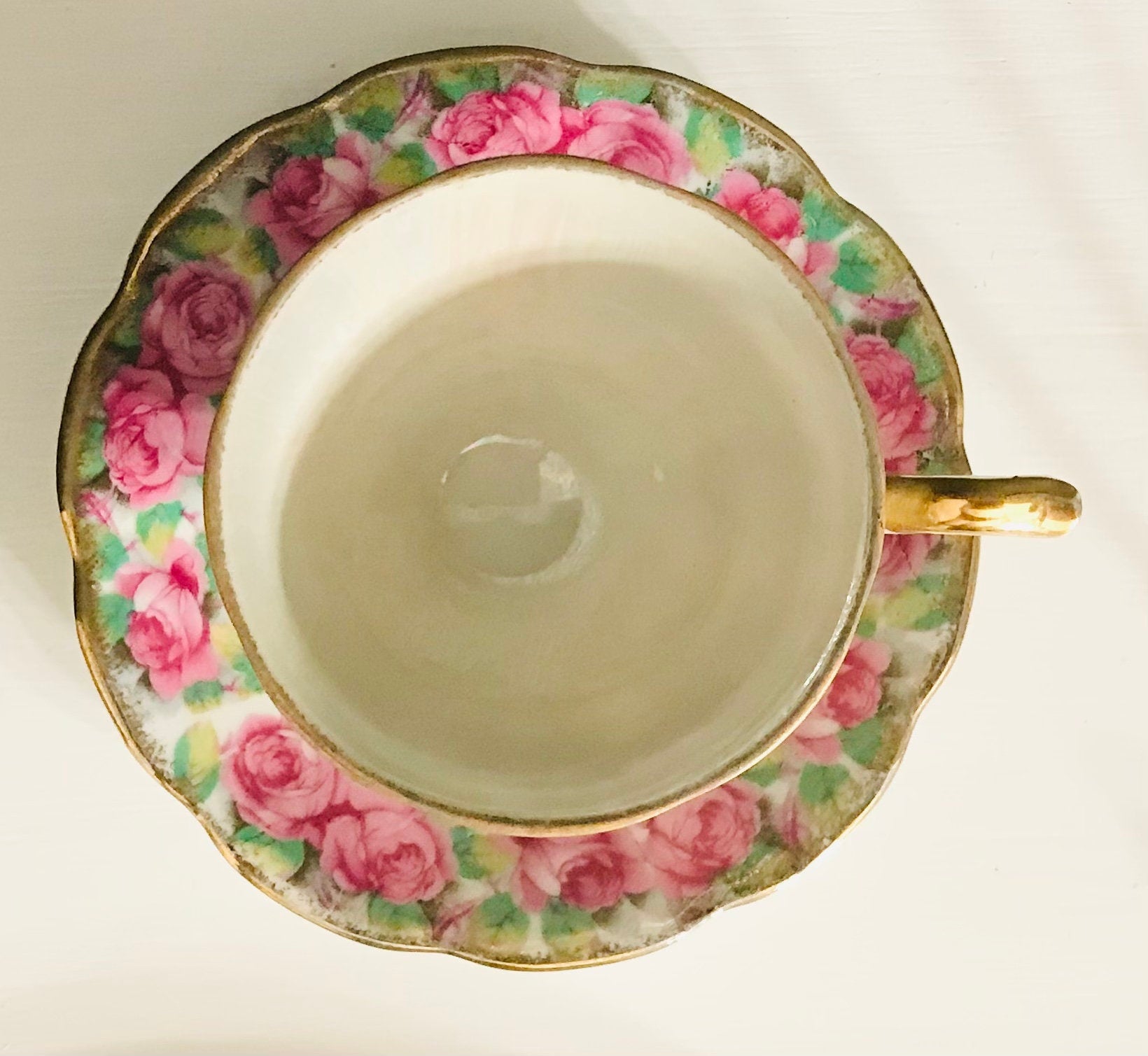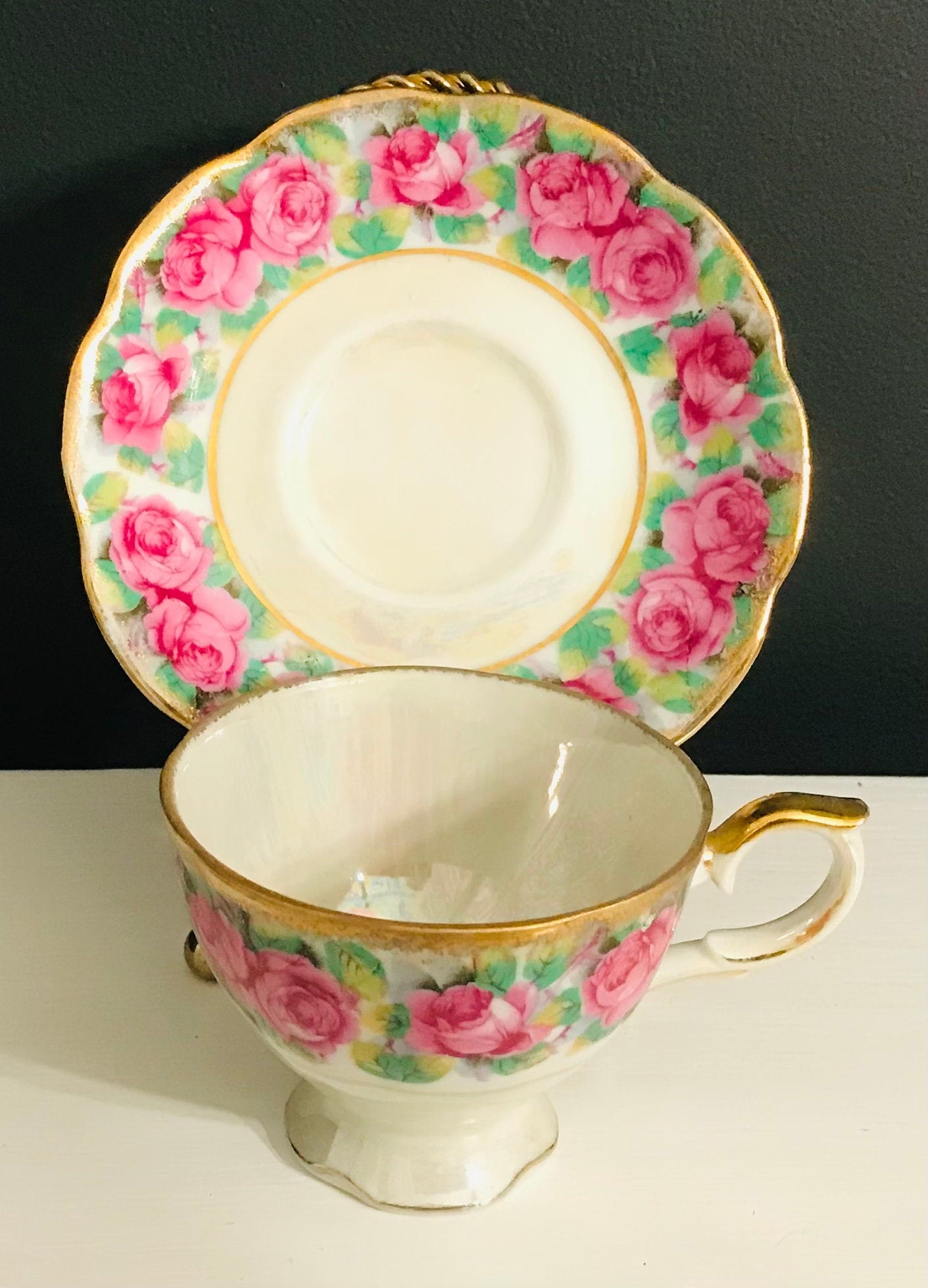 Pretty teacup and saucer-made in Japan. A lovely greyish iridescent finish inside and out. A beautiful band of pink Roses with green leaves around the edge of the saucer and upper, outer part of the teacup. Drizzled gold trim.