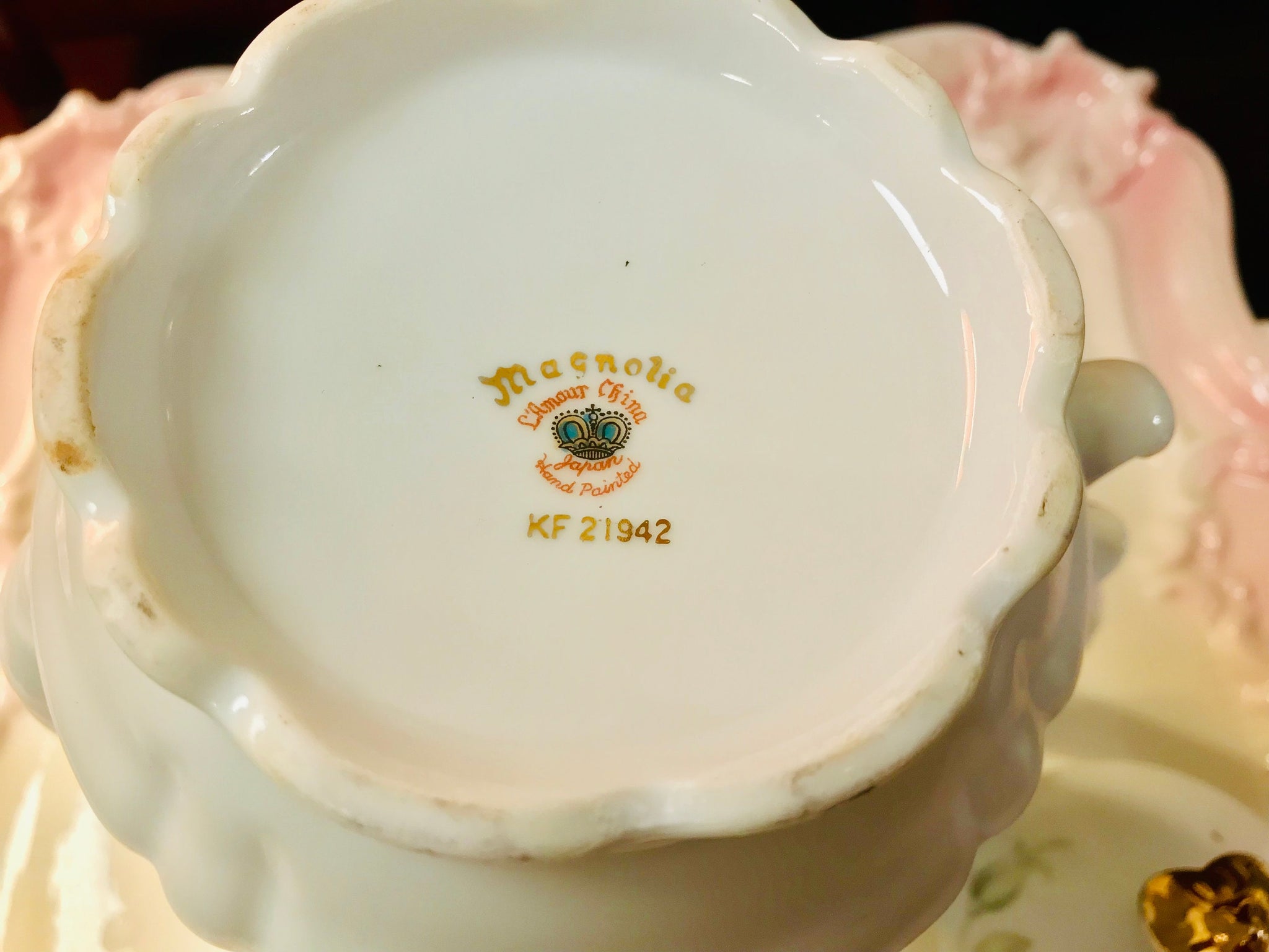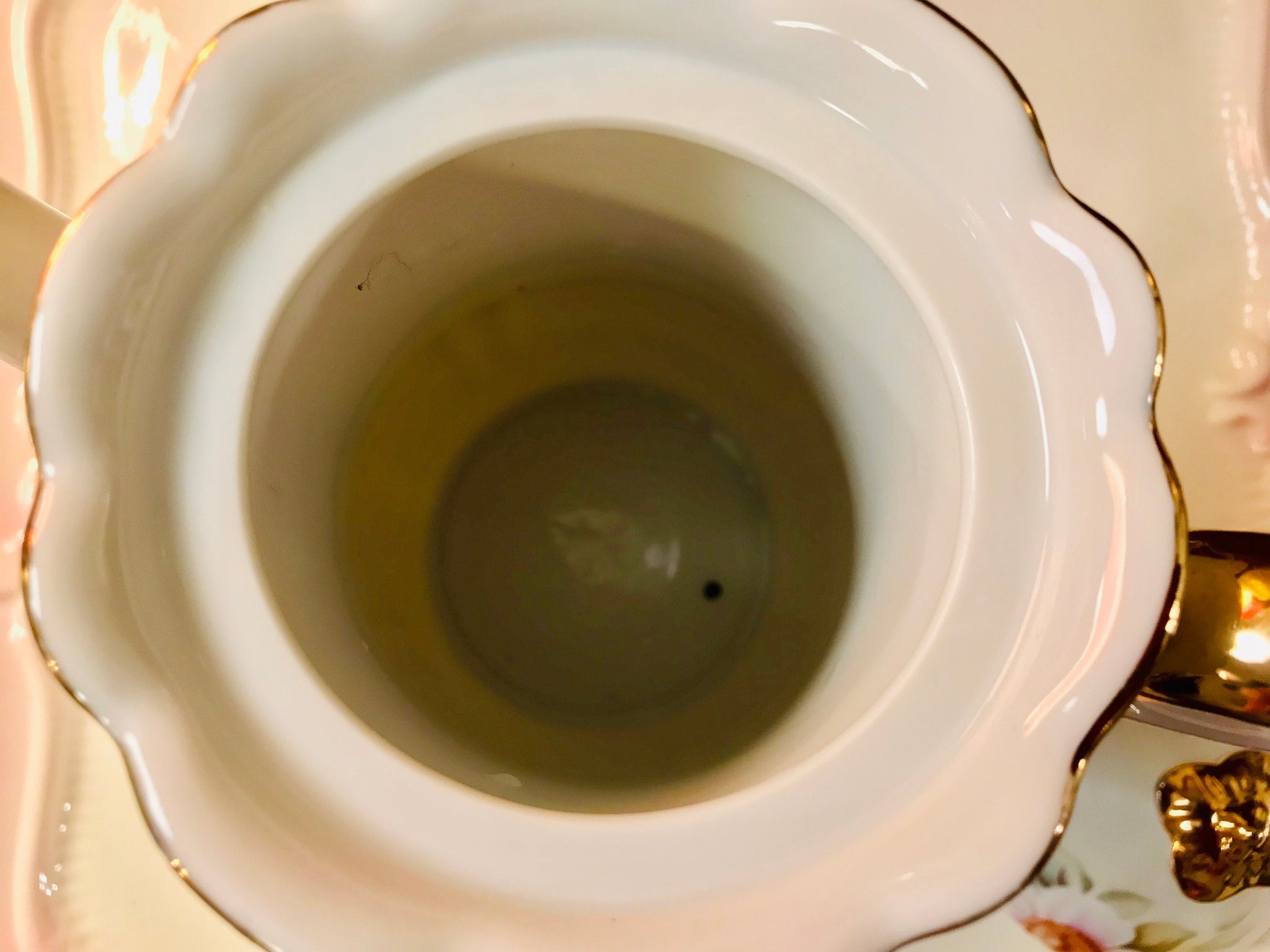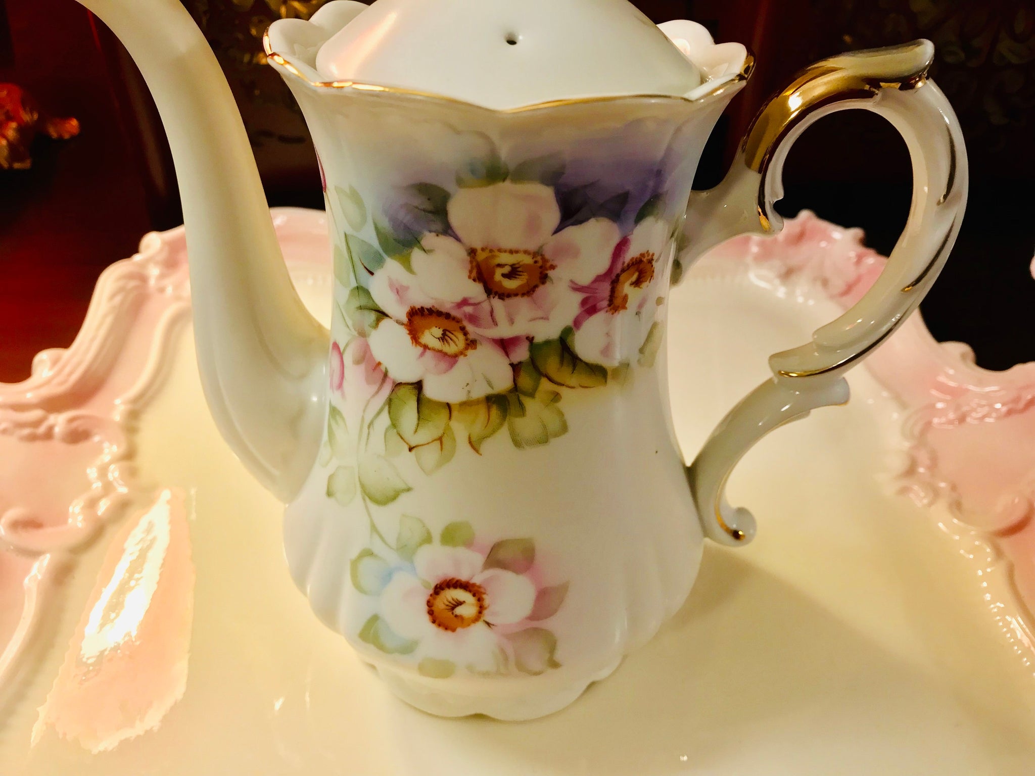 Vintage hand painted coffee pot with large central floral display front and back. Gold detailing and trim. L’Amour China, made in Japan. Numbered KF21942.