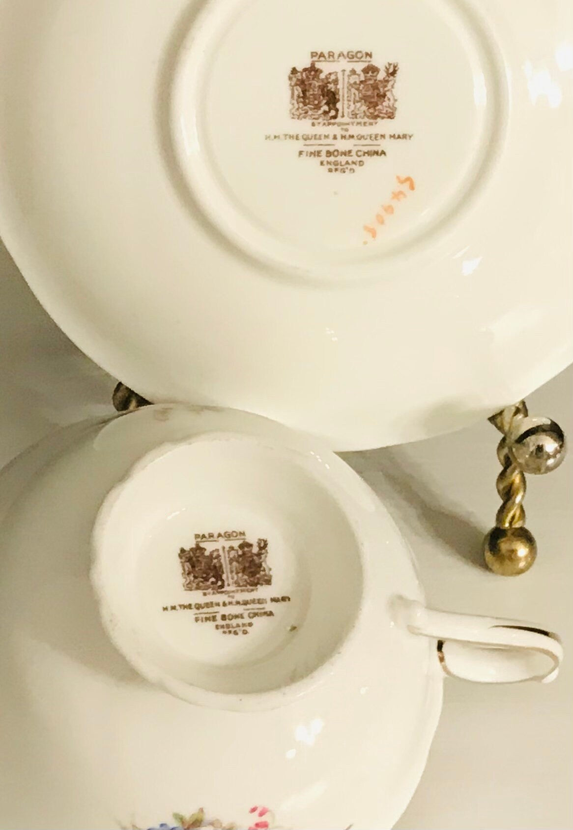 Beautiful Double Royal Warrant Paragon. For Her Majesty the Queen and Her Majesty Queen Mary. A blue border around the saucer perimeter and inside the top of the teacup. Caramel coloured scrollwork. Sweet floral bouquets on both pieces, inside and out. Gold trim with scalloped edges. Numbered what appears to S4908.