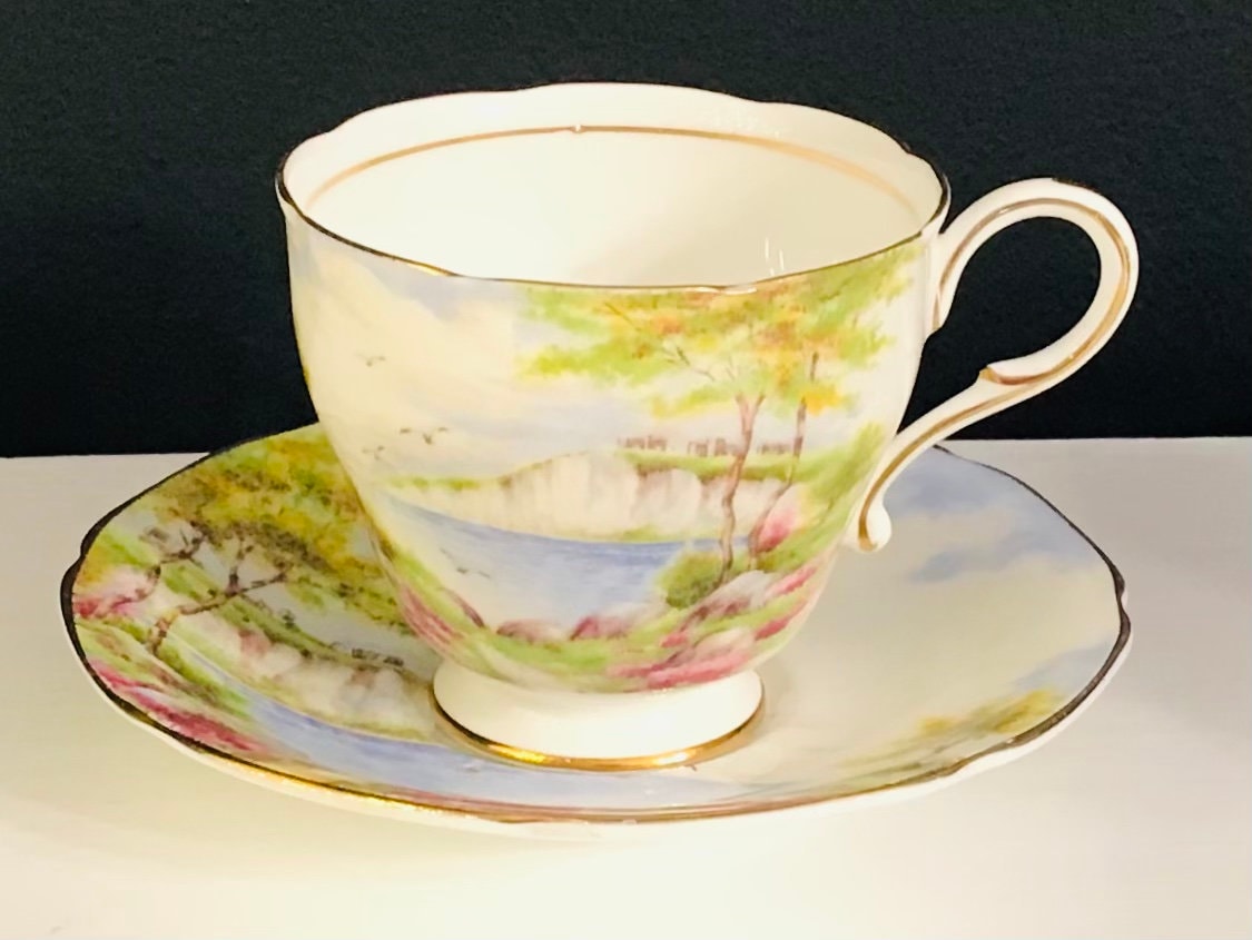 Such a lovely Paragon duo-Cliffs of Dover pattern. A dainty footed teacup and saucer with a pretty design featuring those famous cliffs! Trimmed in gold. Backstamped HM The Queen and HM Queen Mary. Reg number 839221 and also numbered what appears to be 56434 XX
