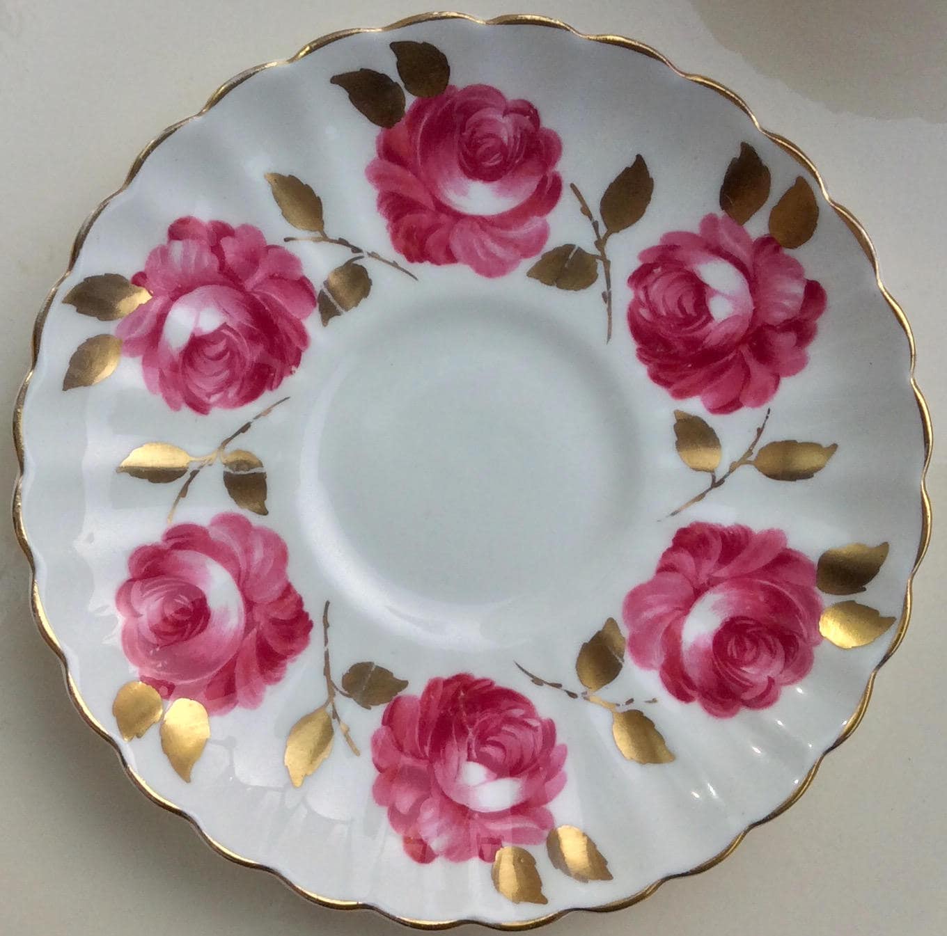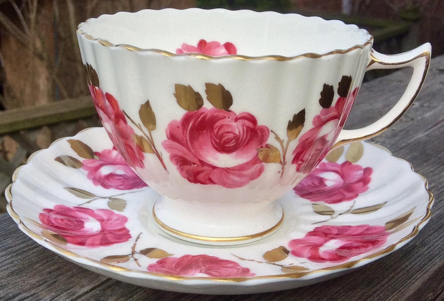 Stunning and romantic-Radfords Fenton bone china teacup and saucer made in Stoke-on-Trent, England. Crisp white background. Lovely highly scalloped edges and trimmed in gold with gold leaves. Numbered what appears to be 2040/A.