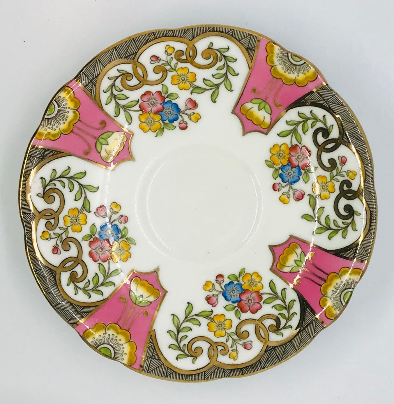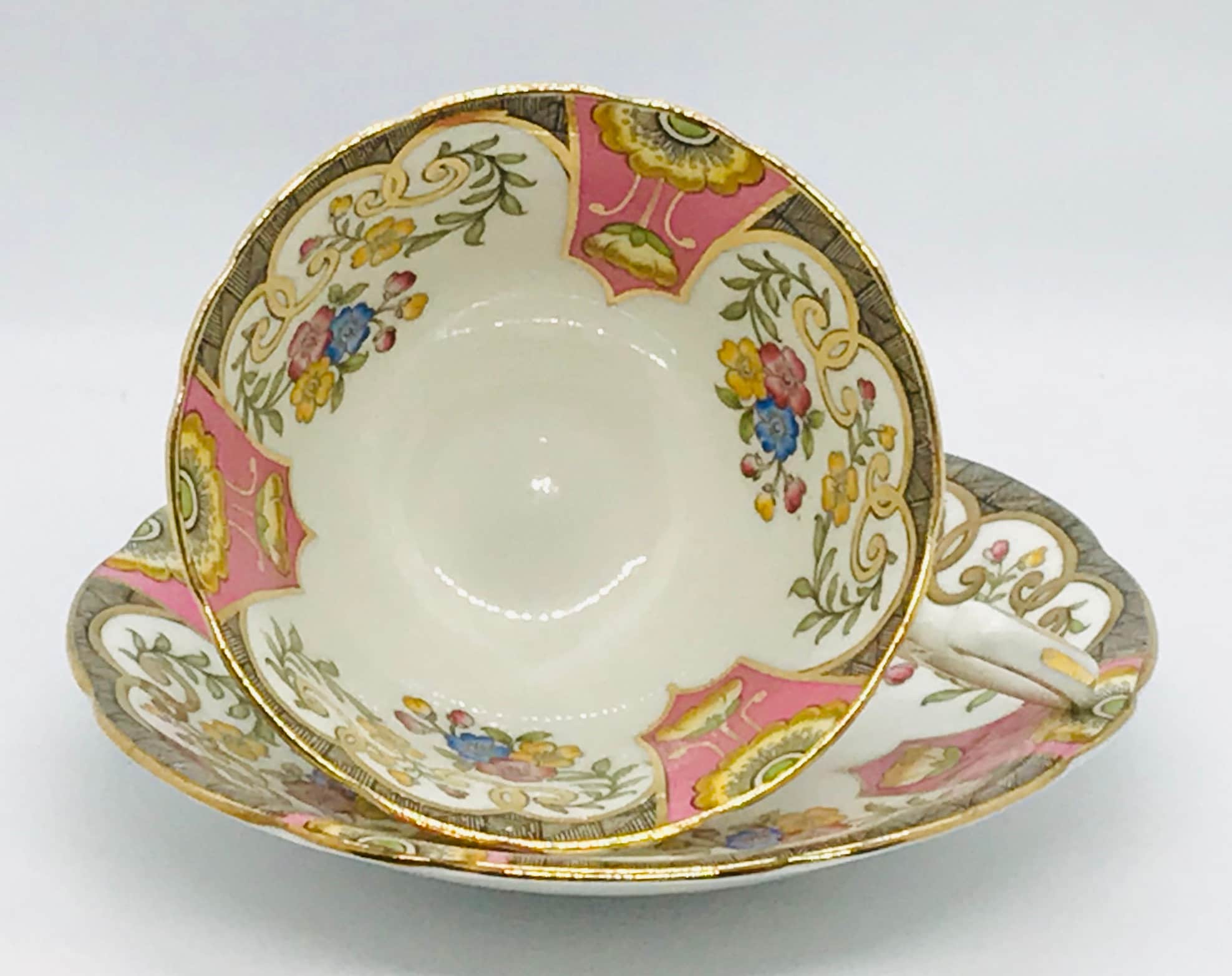Beautiful and rare Aynsley teacup and saucer circa 1925-1934. A crisp white background with gorgeous multi coloured floral detailing. Deep pink cutouts, scalloped edges and gold trim. Numbered what appears to be B1025. Definitely one for the collector.