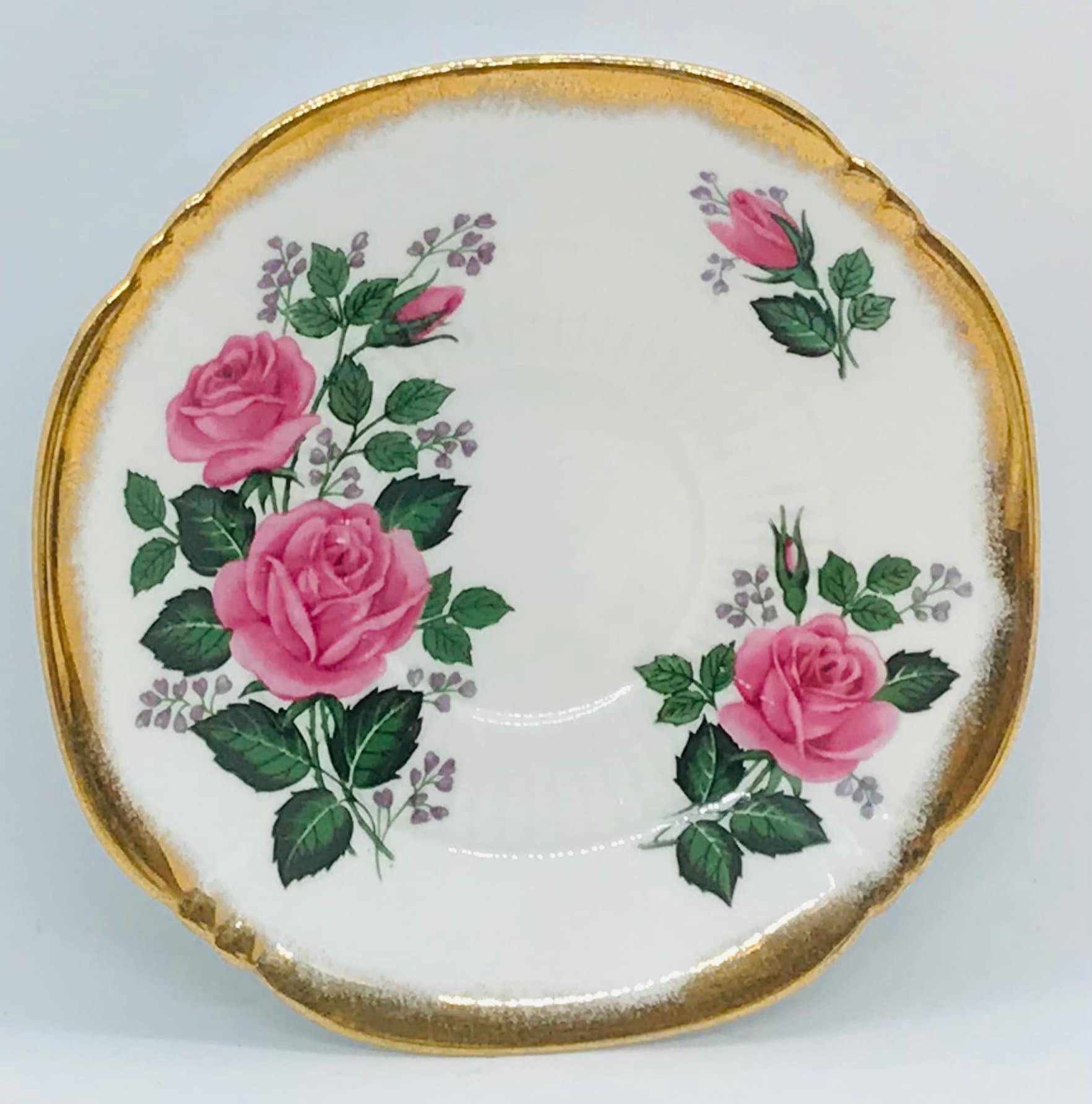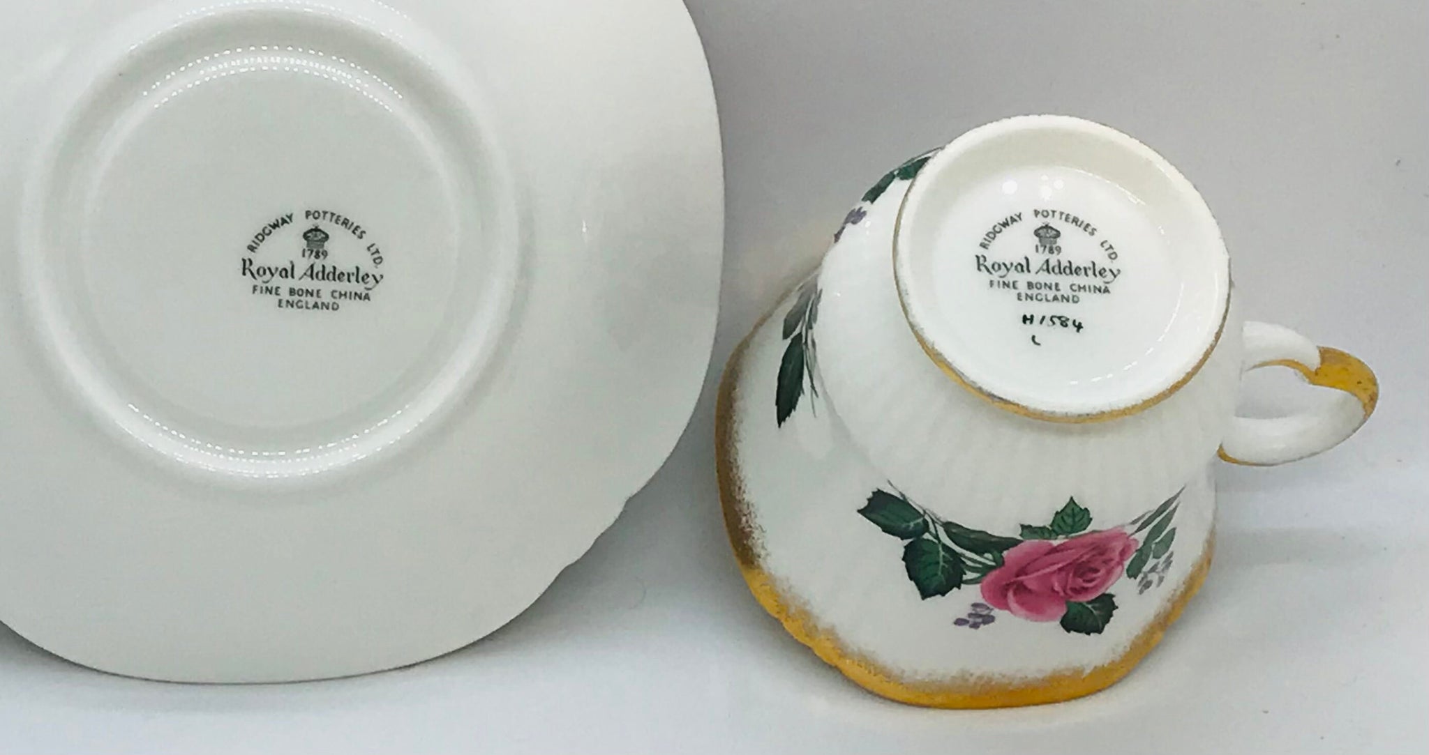 Beautiful Ridgway Potteries Ltd Royal Adderley duo. A crisp white background with deep pink roses and dark green leaves. Lovely ribbed and scalloped design trimmed with drizzled gold. Numbered H1584.