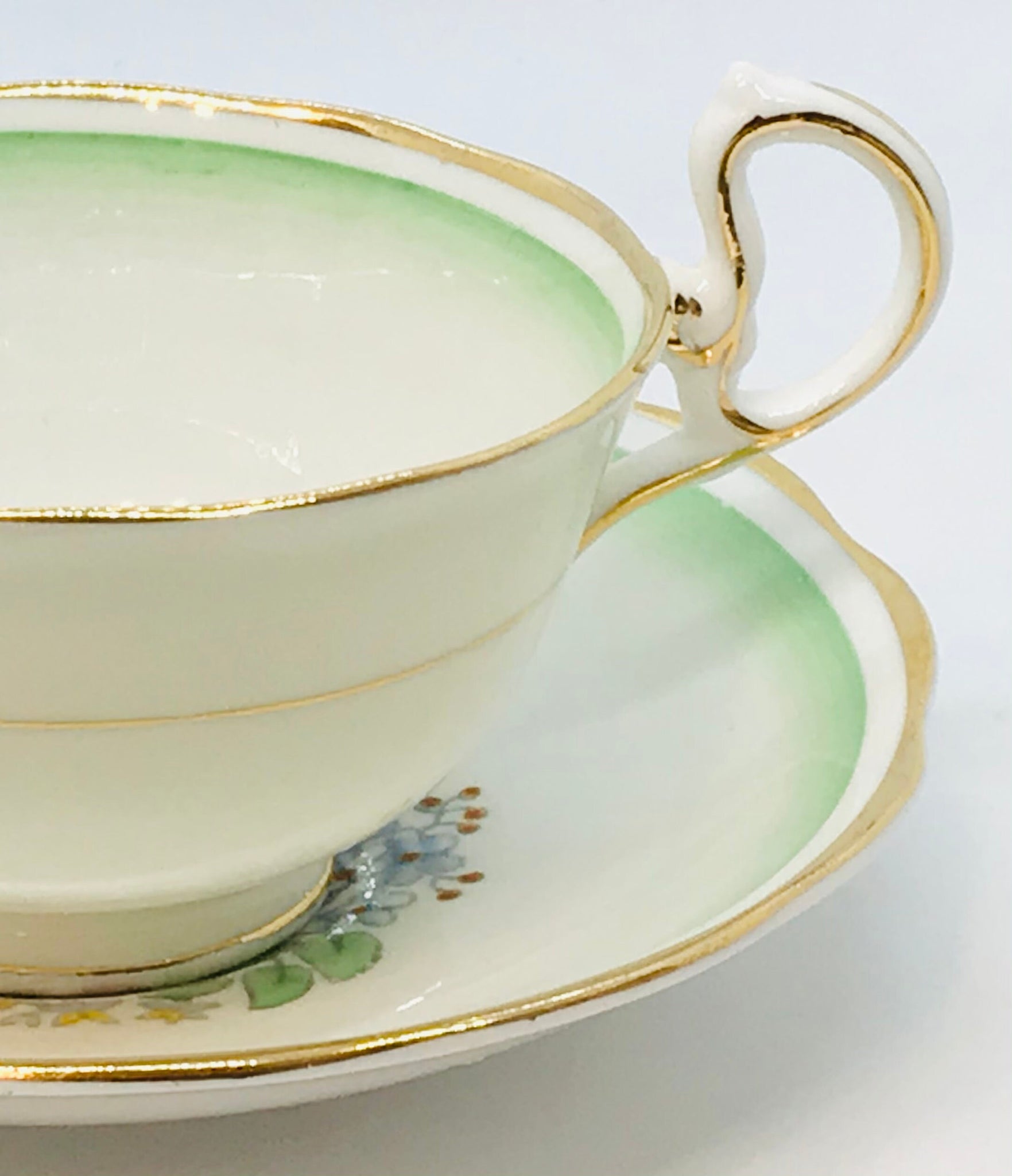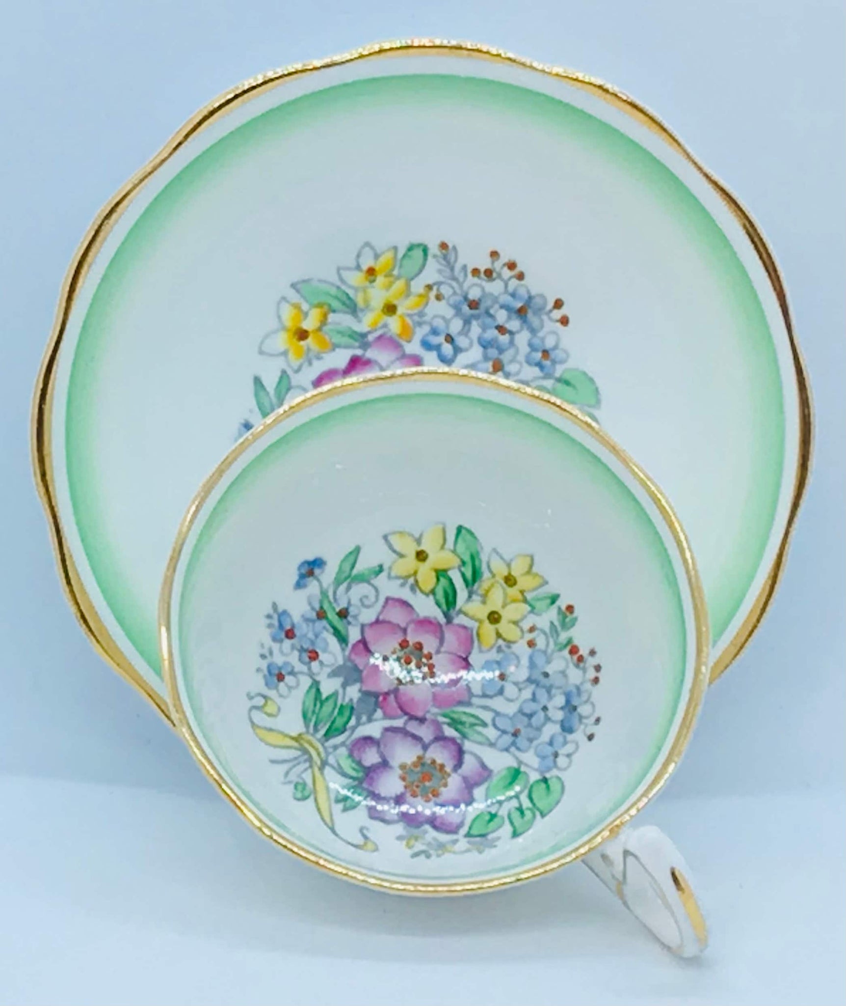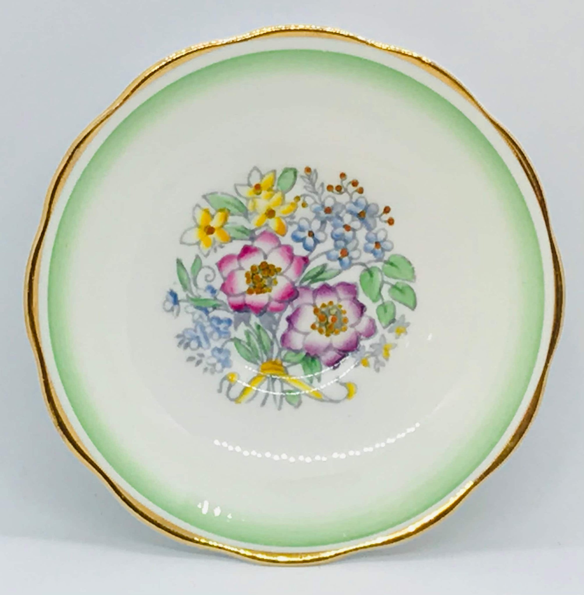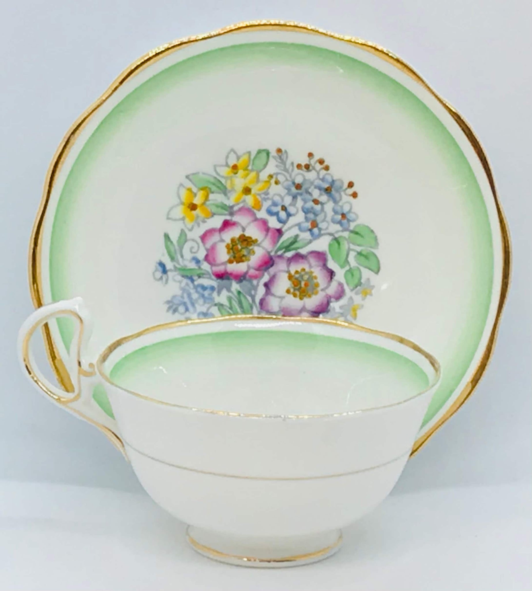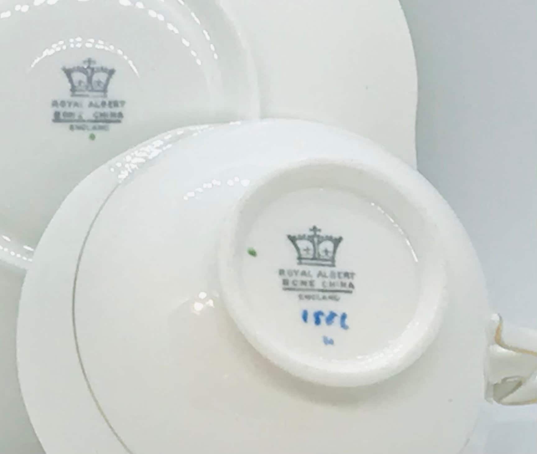 A lovely Royal Albert teacup and saucer. A white background with a sweet hand painted floral bouquet in the bottom of the teacup and saucer centre. The bouquets are tied with a lovely yellow ribbon. Gold trim. Circa 1934-1945. Numbered what appears to be 1586.