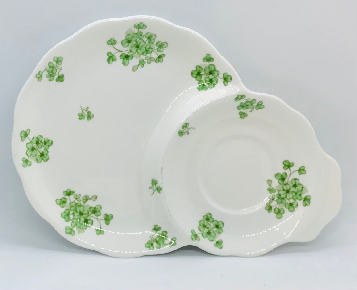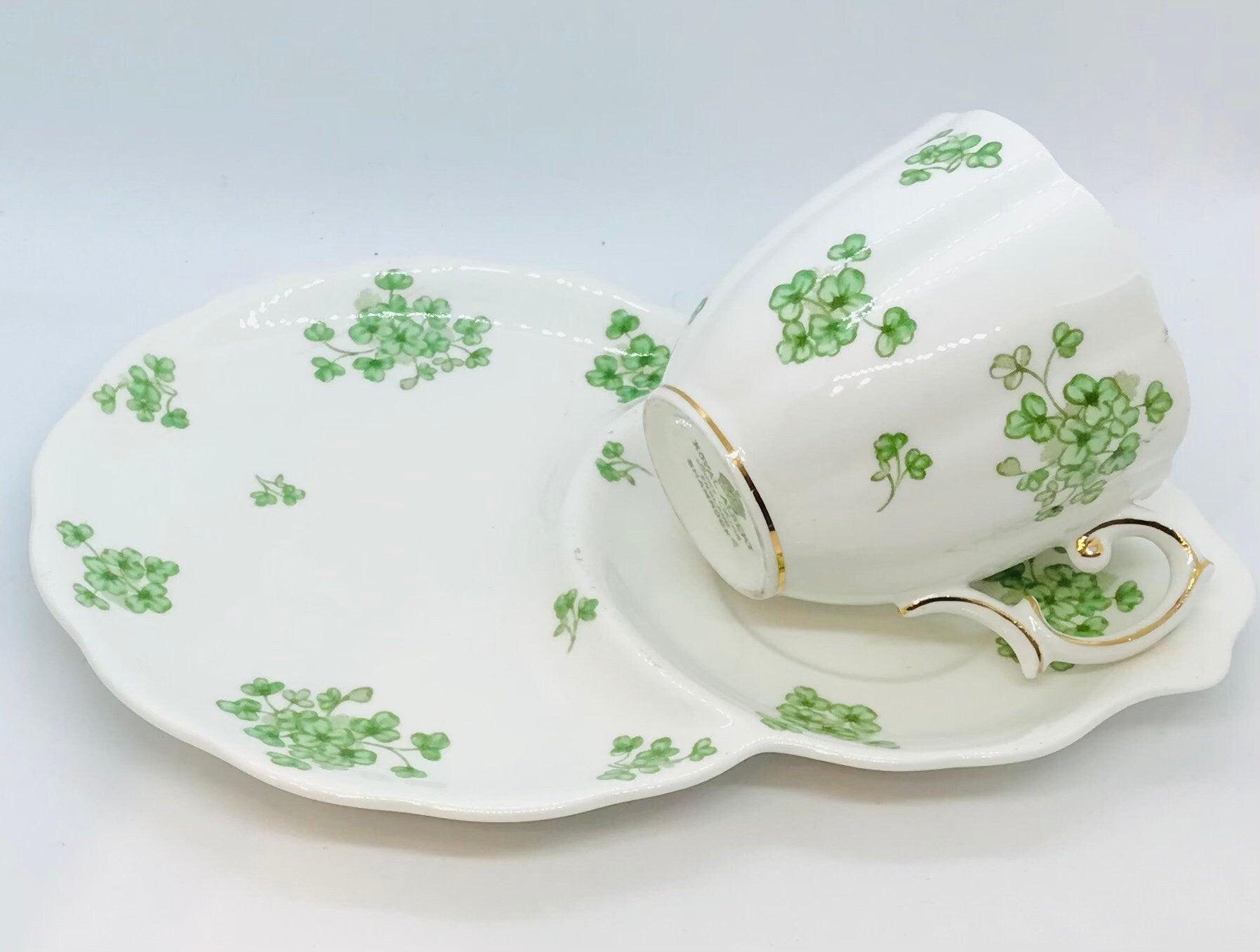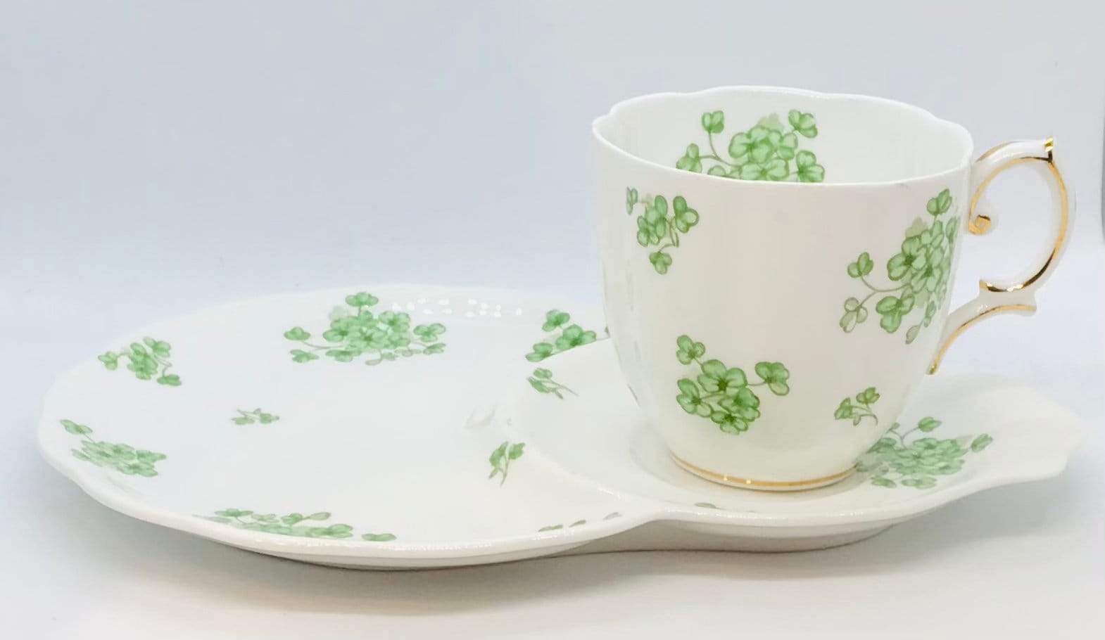 A lovely Royal Albert tennis or snack set. A white background adorned with pretty green shamrocks. The pattern “Shamrocks” is from the 1950s. The Countess shaped teacup measures 2.75 in high x 4 in width (handle to rim). The snack plate measures 8.75 in x 6 in (at the widest point). Gold detailing on the teacup base and handle.