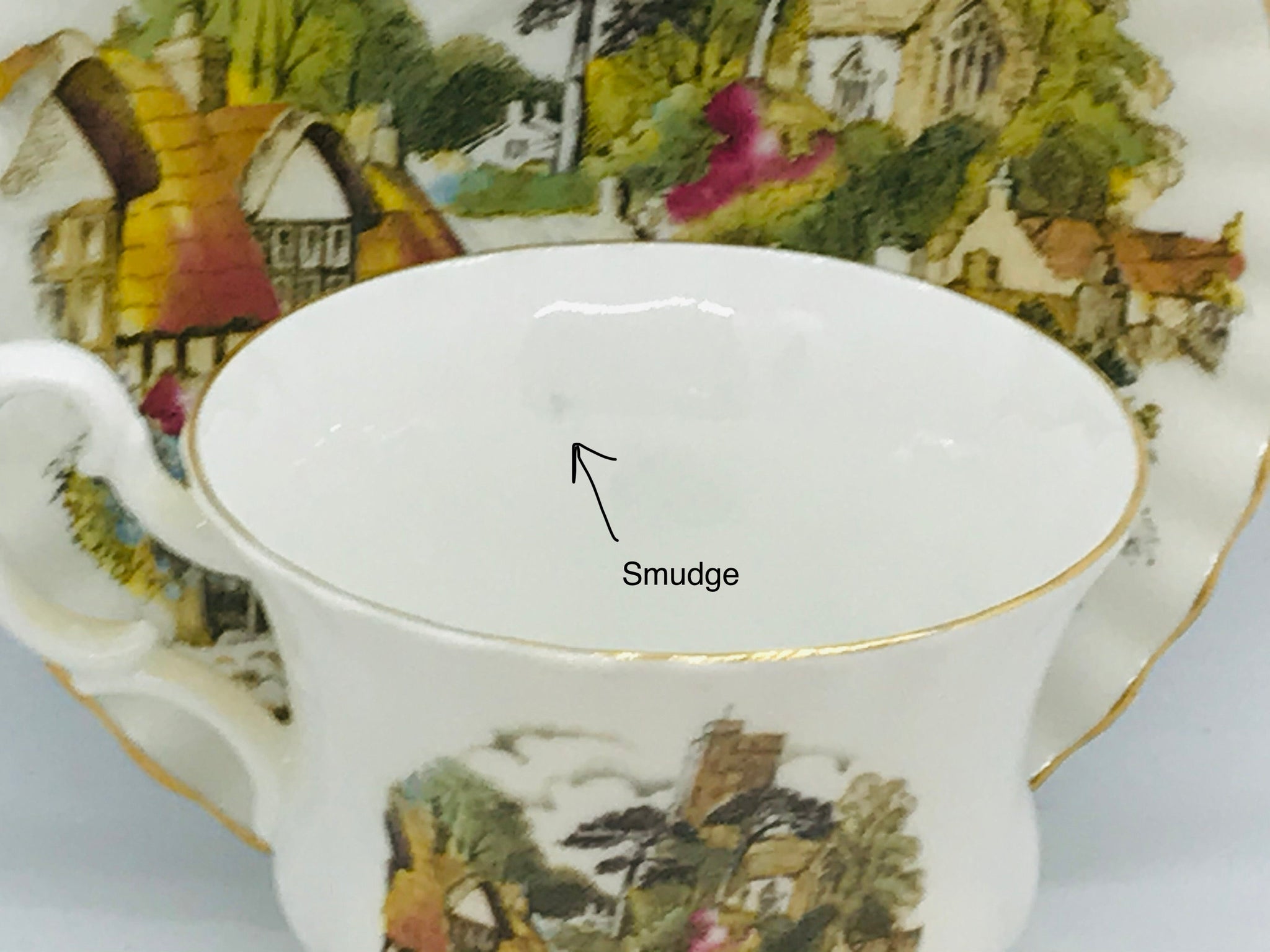There is a lot going on in this lovely Royal Albert duo. The duo has everything you want in an English teacup-castles, quaint cottages and more! A ribbed and scalloped design.