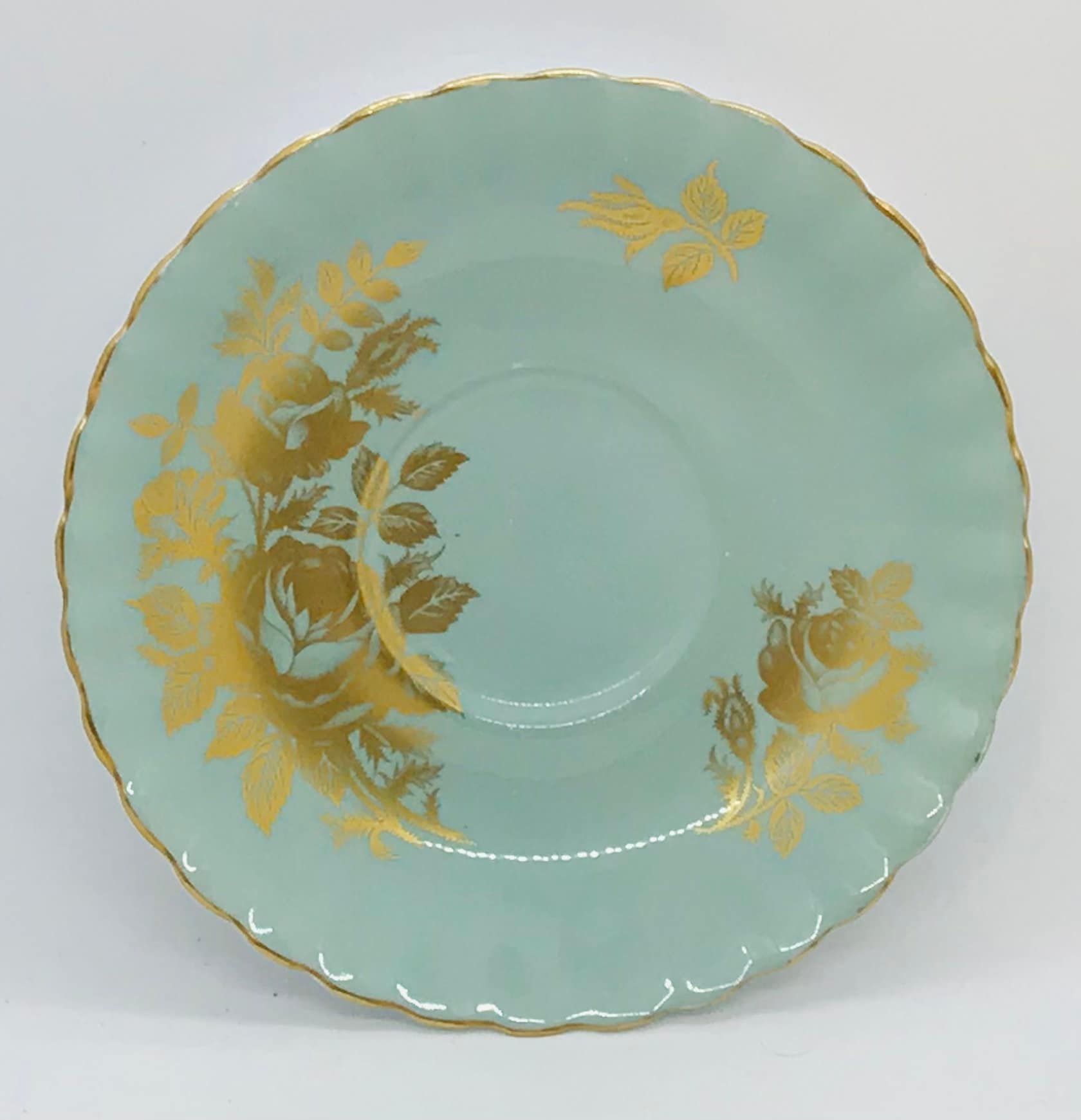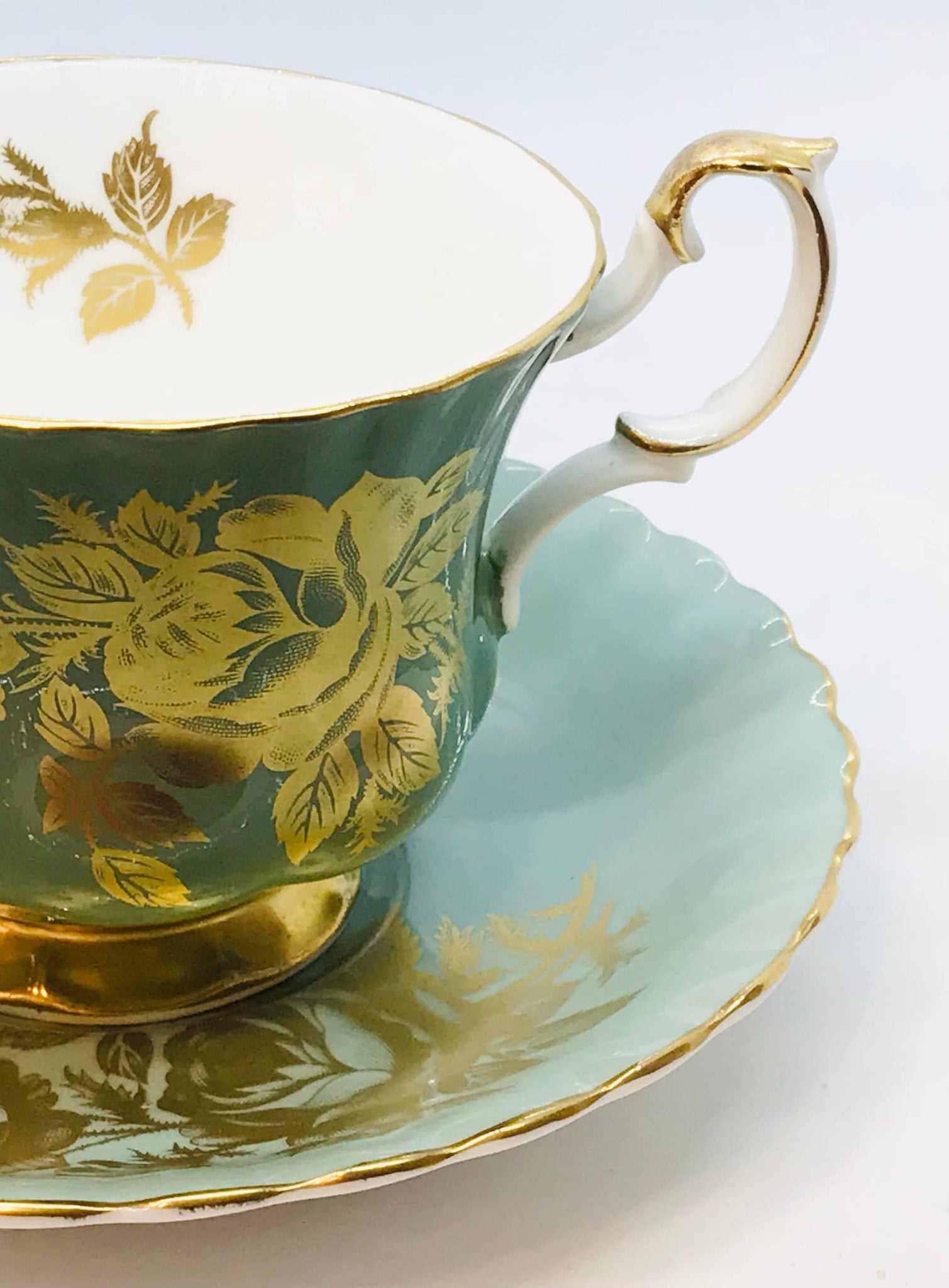 A beautiful Royal Albert duo in a hard to find green background. This is an unnamed pattern with stunning gold rose detailing. Crimped design. Trimmed in gold. Excellent vintage condition with no cracks, crazing, chips or repairs. A couple of white dots on the saucer and a linear white line above the handle. Both pieces ping nicely. Please examine the items with the zoom lens feature and ask for more photos if concerned.