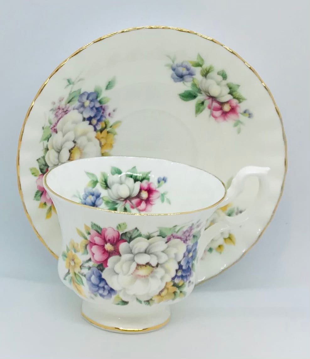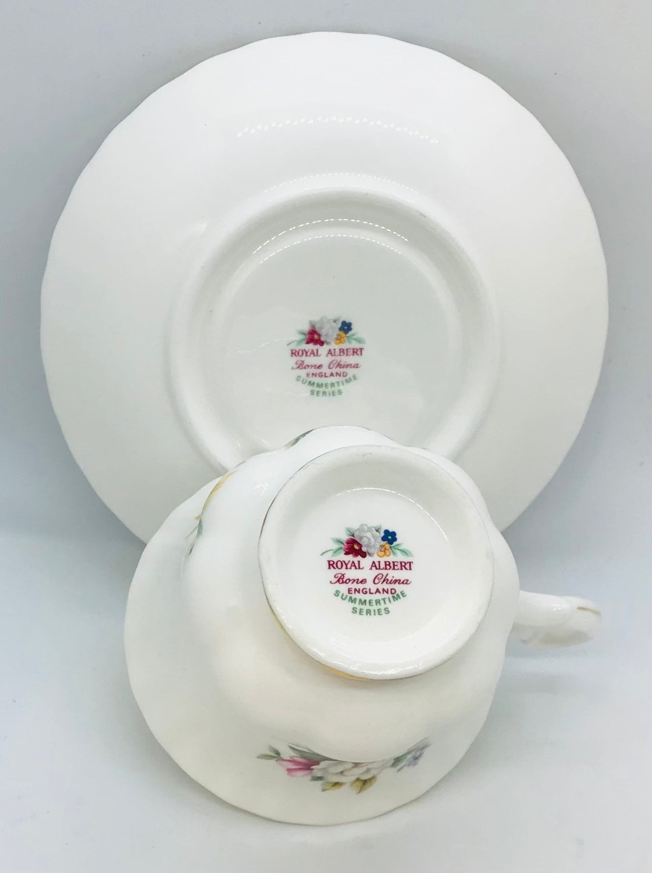 A beautiful Royal Albert duo from the Summertime Series. A crisp white background featuring pink multi coloured flowers . Trimmed in gold. Unnamed on the teacup, but the pattern is Sherborne.