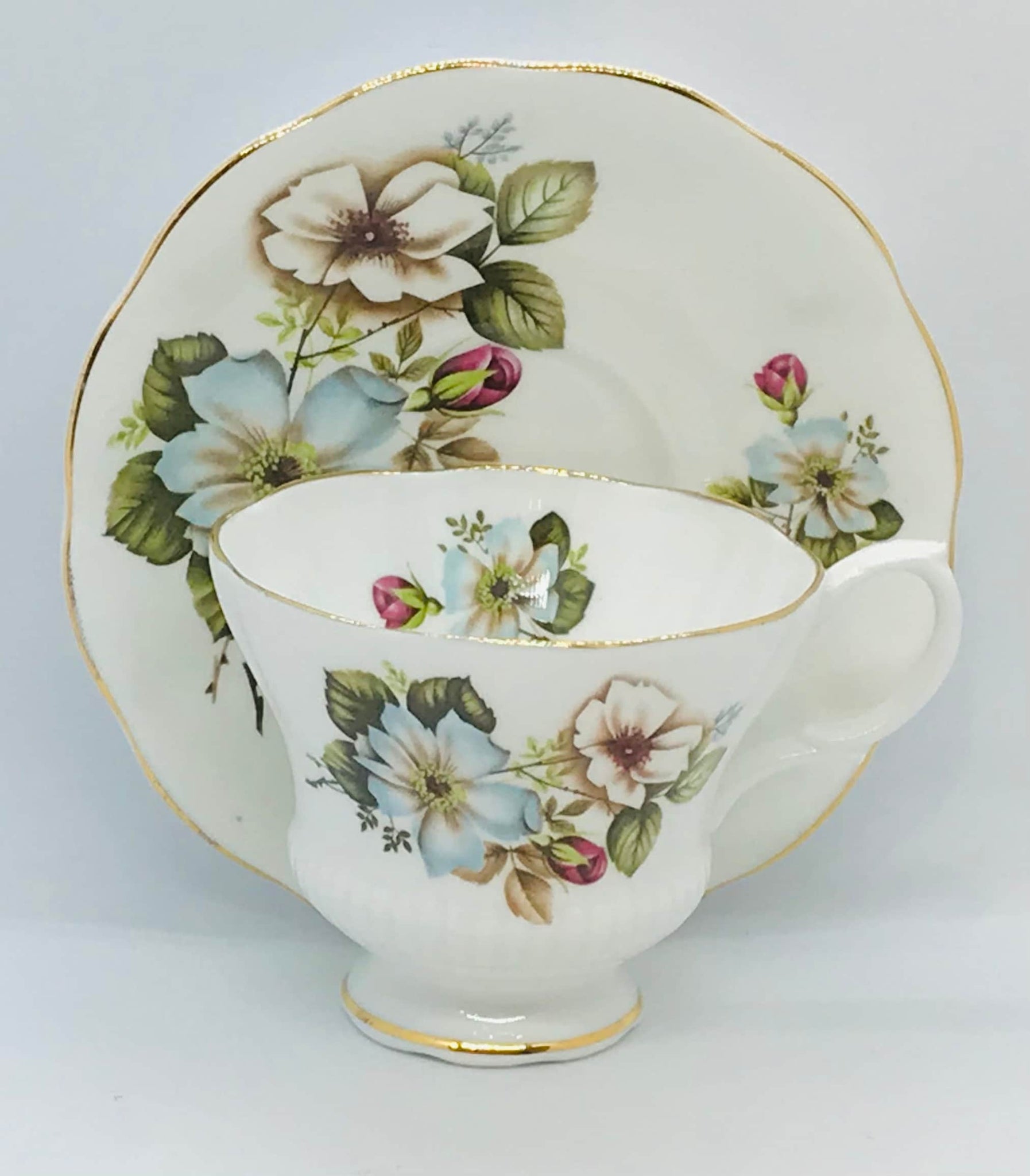 A lovely Royal Albert duo. A crisp white background with white and blue flowers. Trimmed in gold.