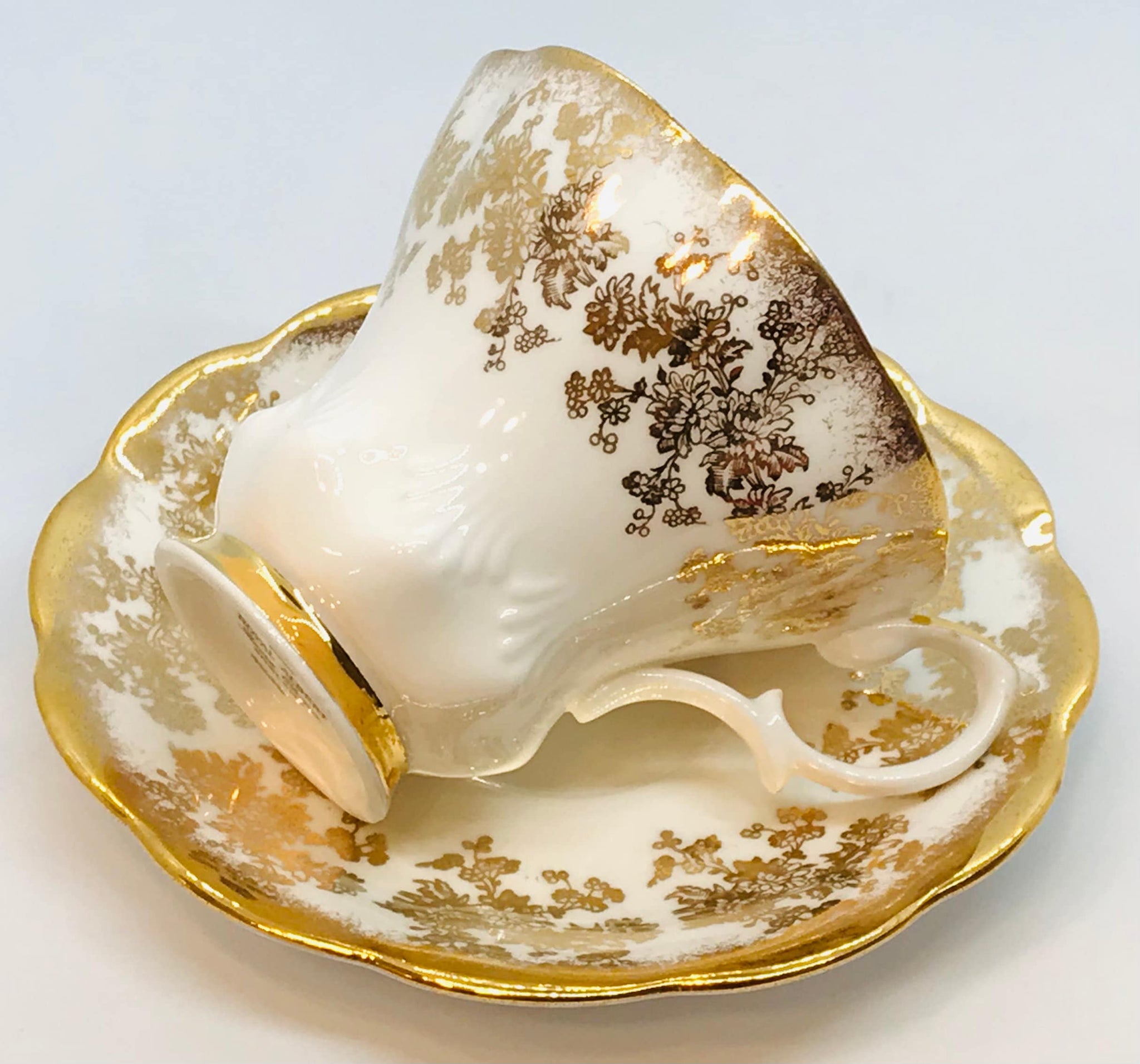 This Royal Albert duo is an unnamed pattern and is simply stunning with its corset shape footed teacup, scalloped edges, raised designs and bountiful gold! The teacup is decorated with golden flowers. Numbered 4234. Excellent vintage condition. No chips, cracks, crazing or repairs. Both pieces ping nicely. I just felt it so want to note it-pointed out in photo. 2 little smudges inside teacup.