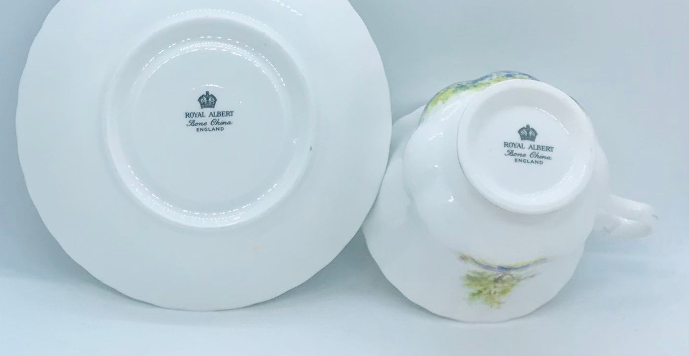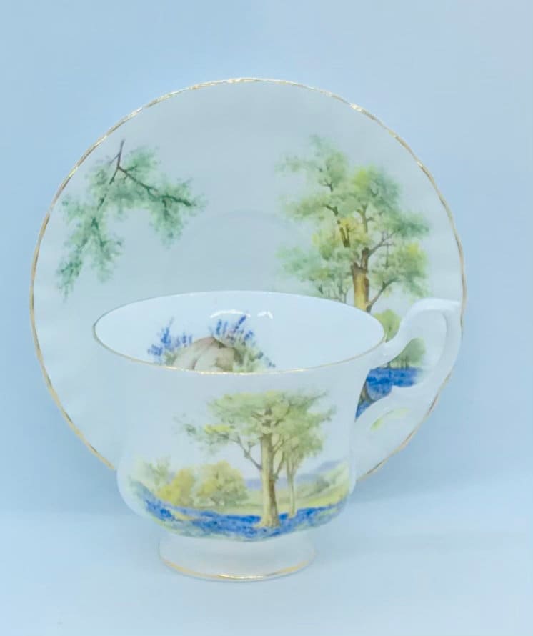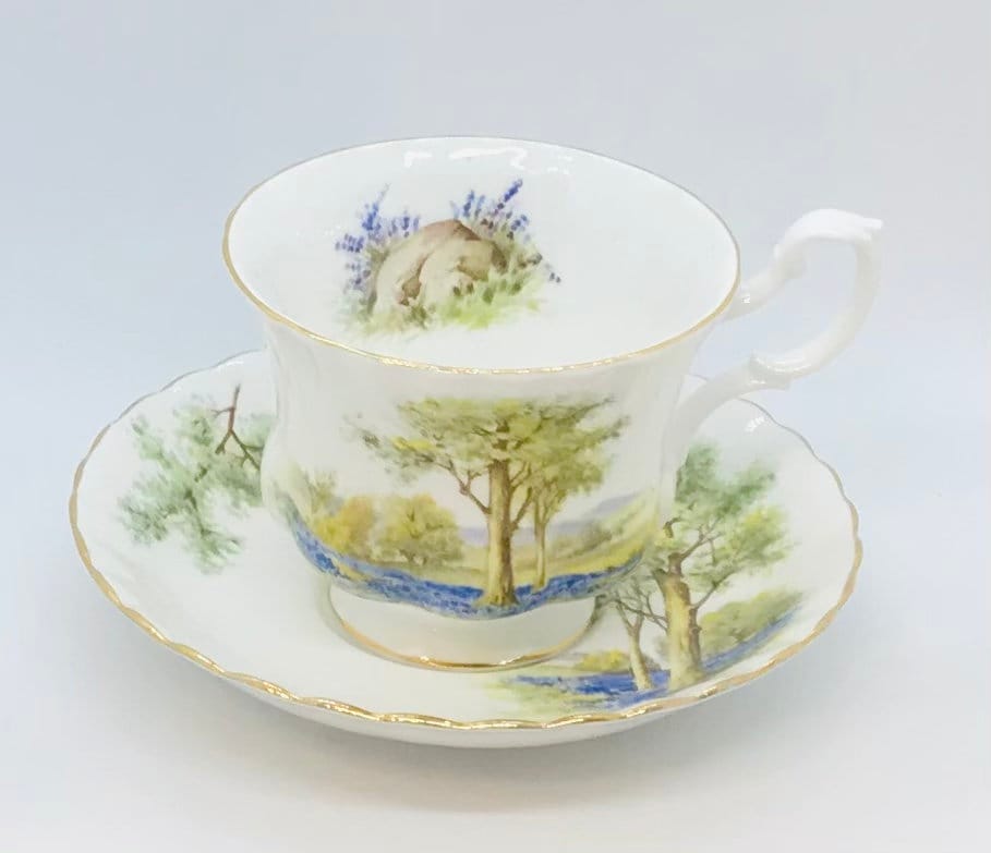 A serene Royal Albert teacup and saucer. A lovely white background with a majestic tree in a purple lavender field. Crimped edges. Gold trim.