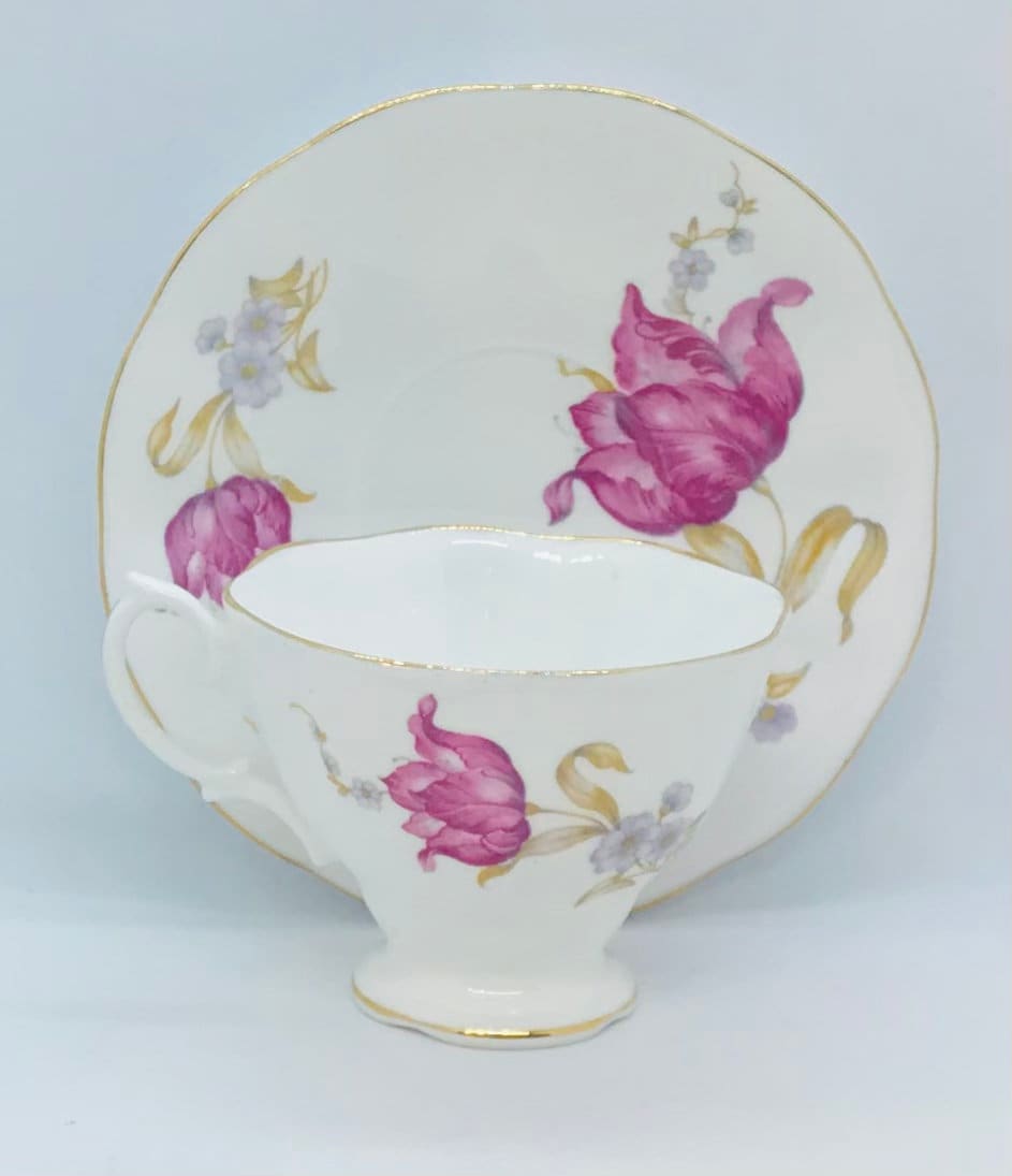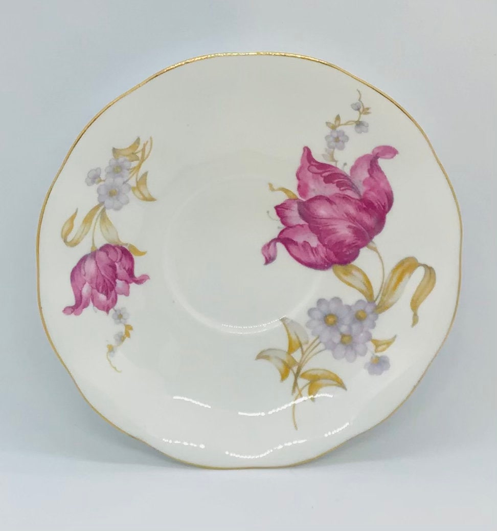 A vibrantly coloured Royal Albert teacup and saucer. A lovely white background with large pink blooms and smaller mauve flowers. Raised detailing at upper outer teacup edge. Scalloped edges. Gold trim.