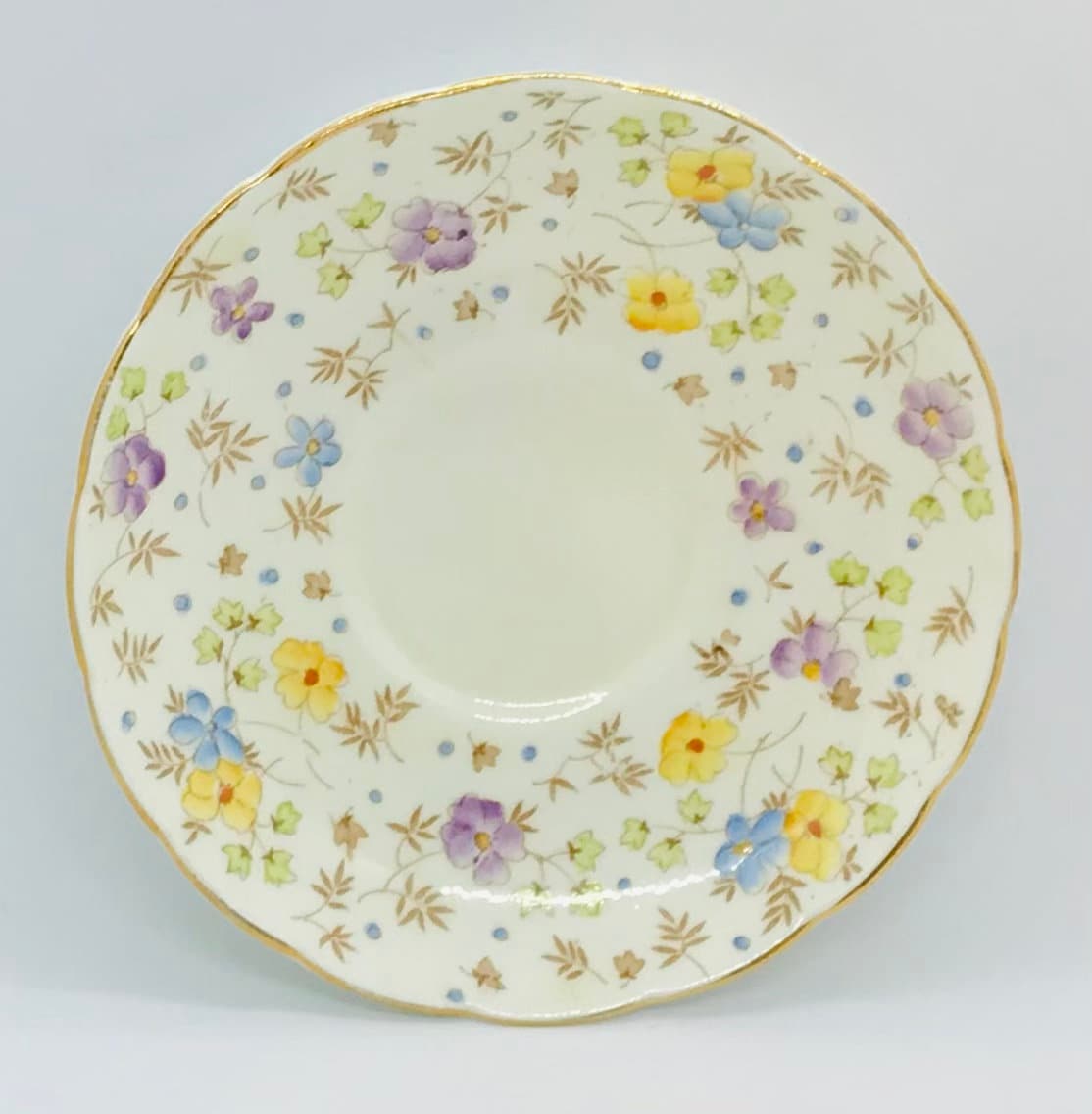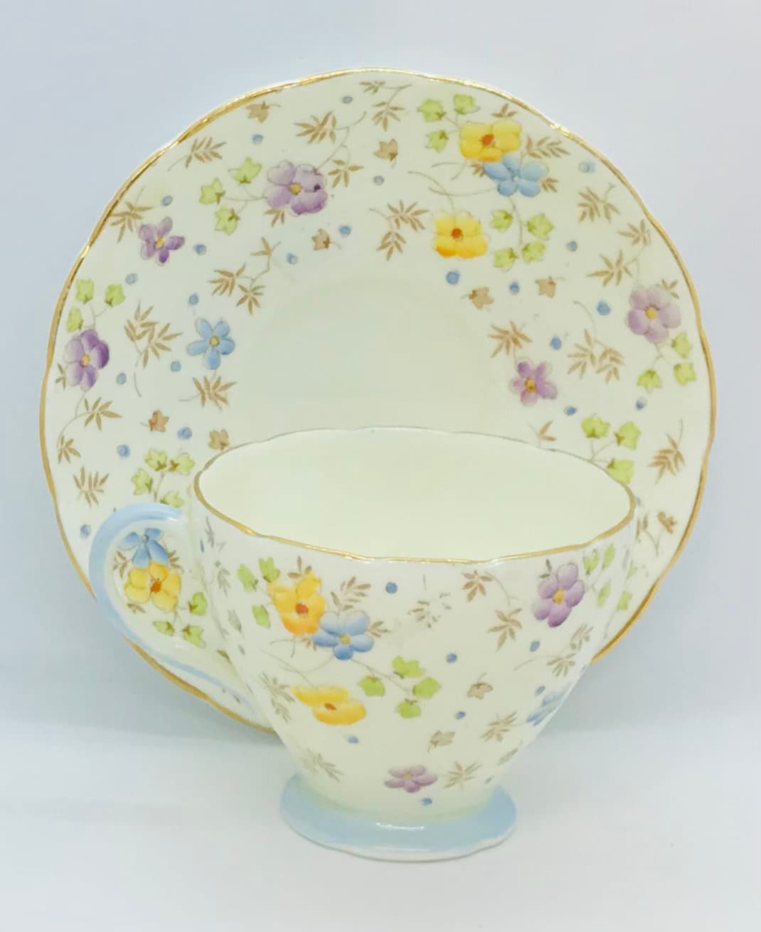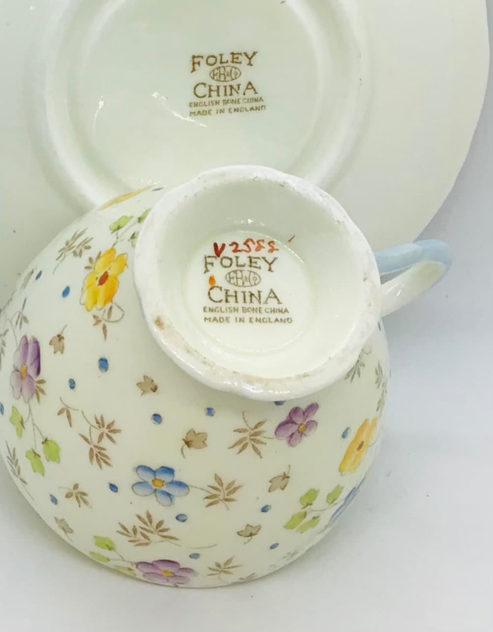 A sweet and whimsical Foley teacup and saucer. A lovely cream coloured background with delicate multi coloured flowers. The handle and base of the teacup are a pale blue, and the teacup rim and saucer edge are gold. Numbered V2588. Marked with Foley China and also EB & Co.