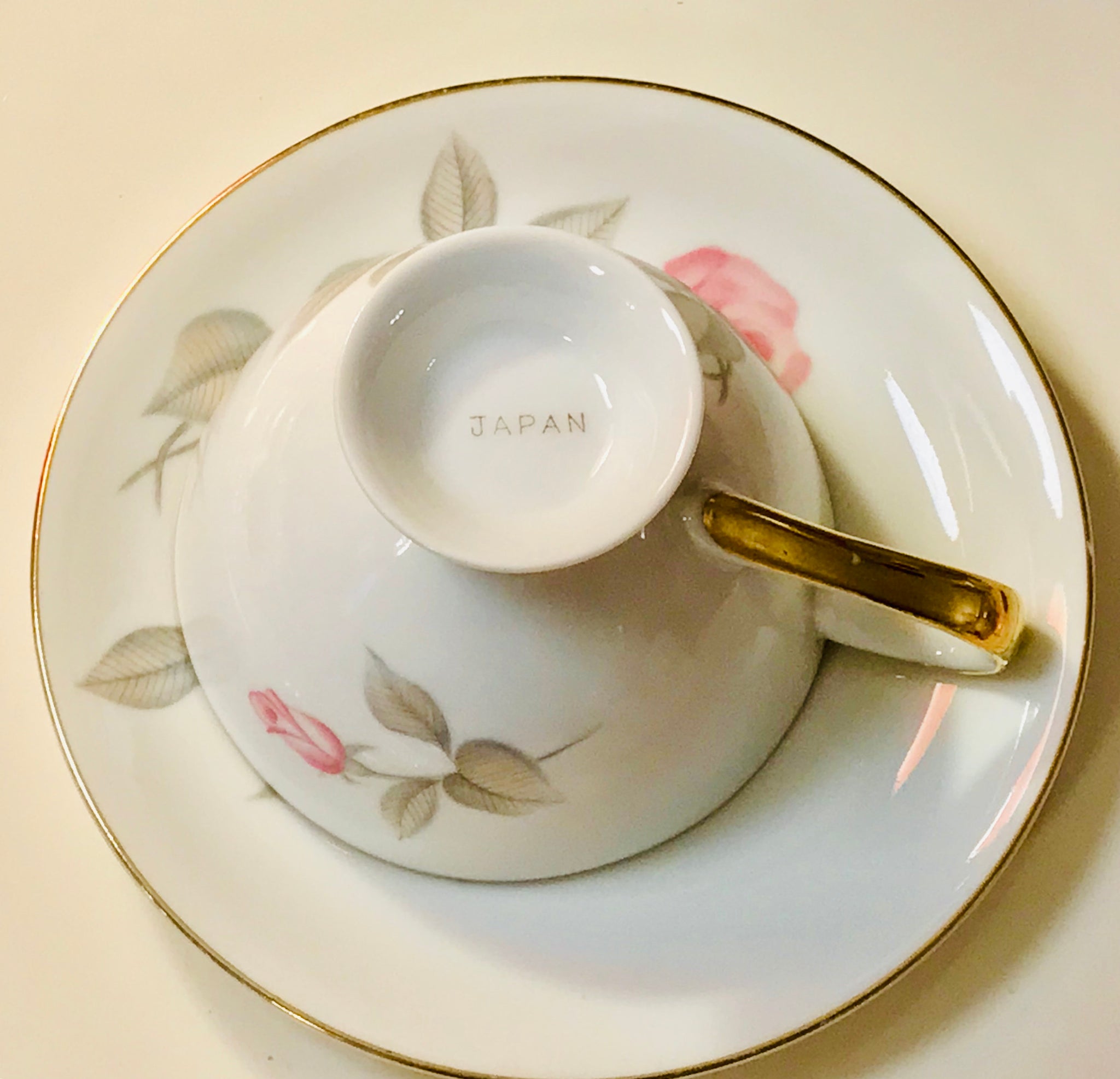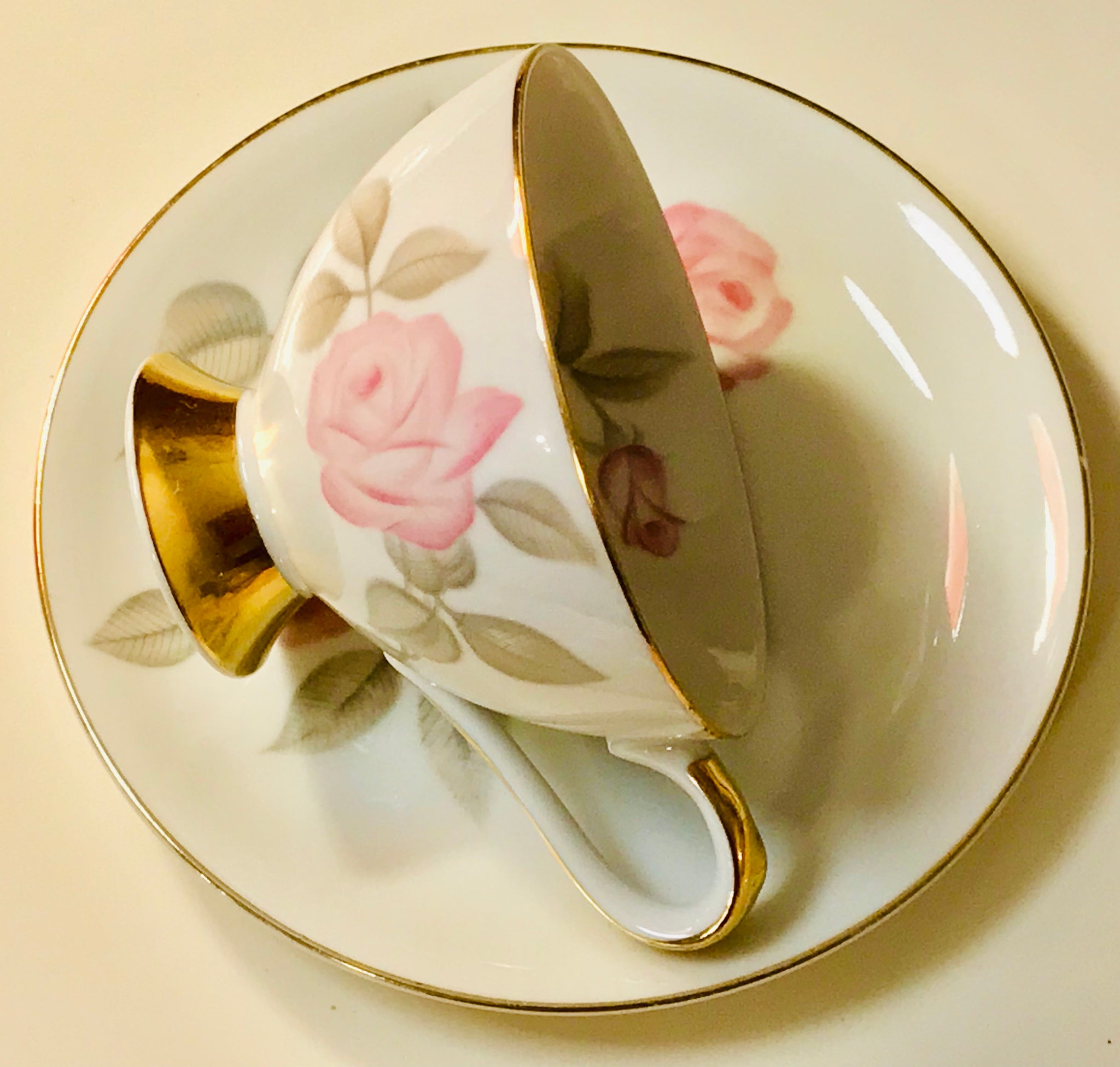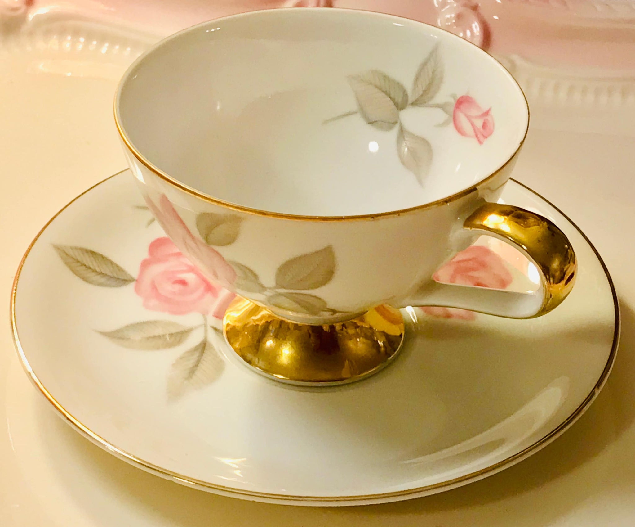 Such a romantic duo, made in Japan. Elegant pedestal teacup with gold base. Gorgeous pink roses on a white background. Gold trim. 2 available.