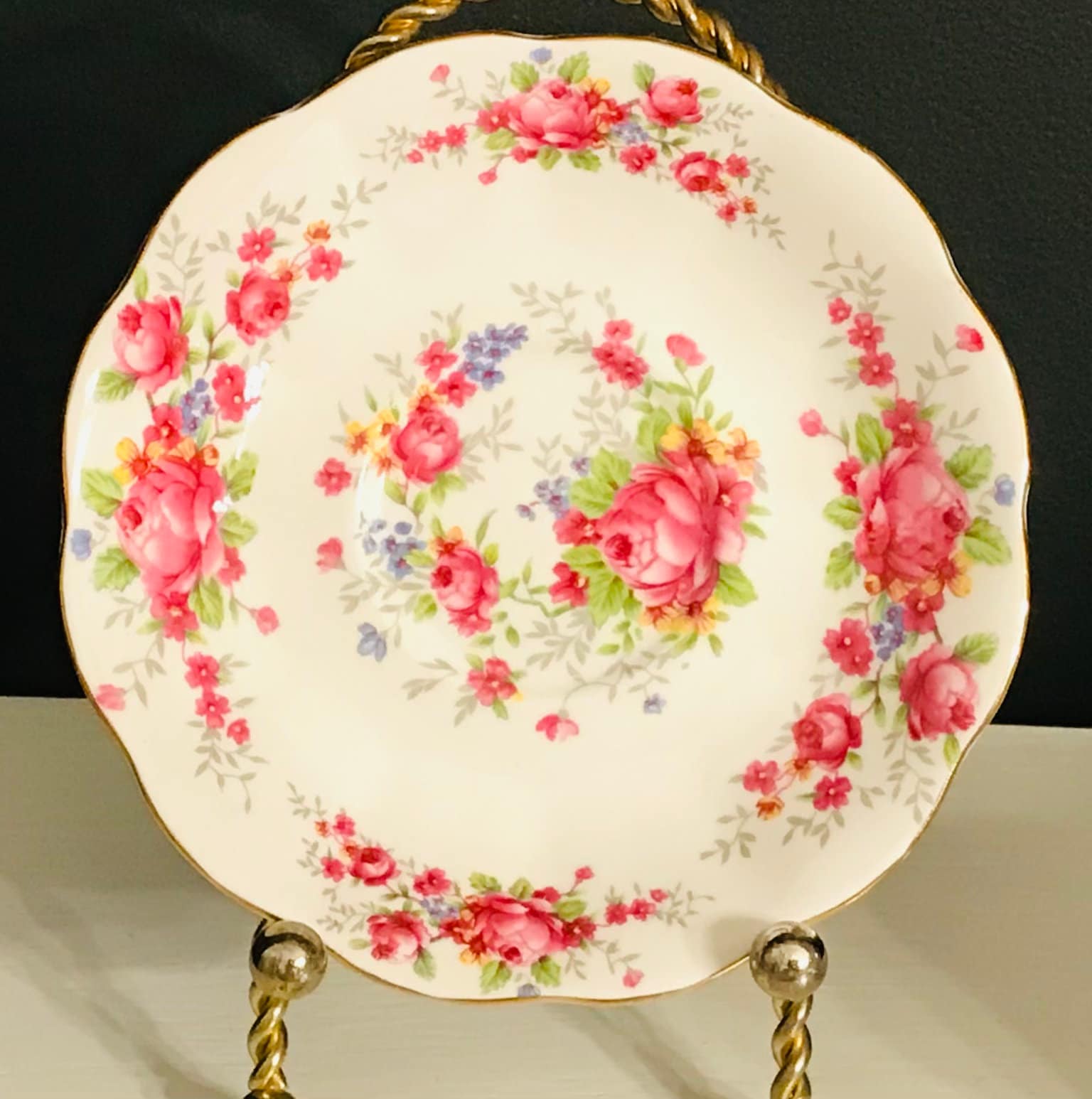 Sweet tulip shaped Royal Albert teacup and saucer. A crisp white background adorned with little pink rose bouquets and greenery. Scalloped edges. Trimmed in gold.
