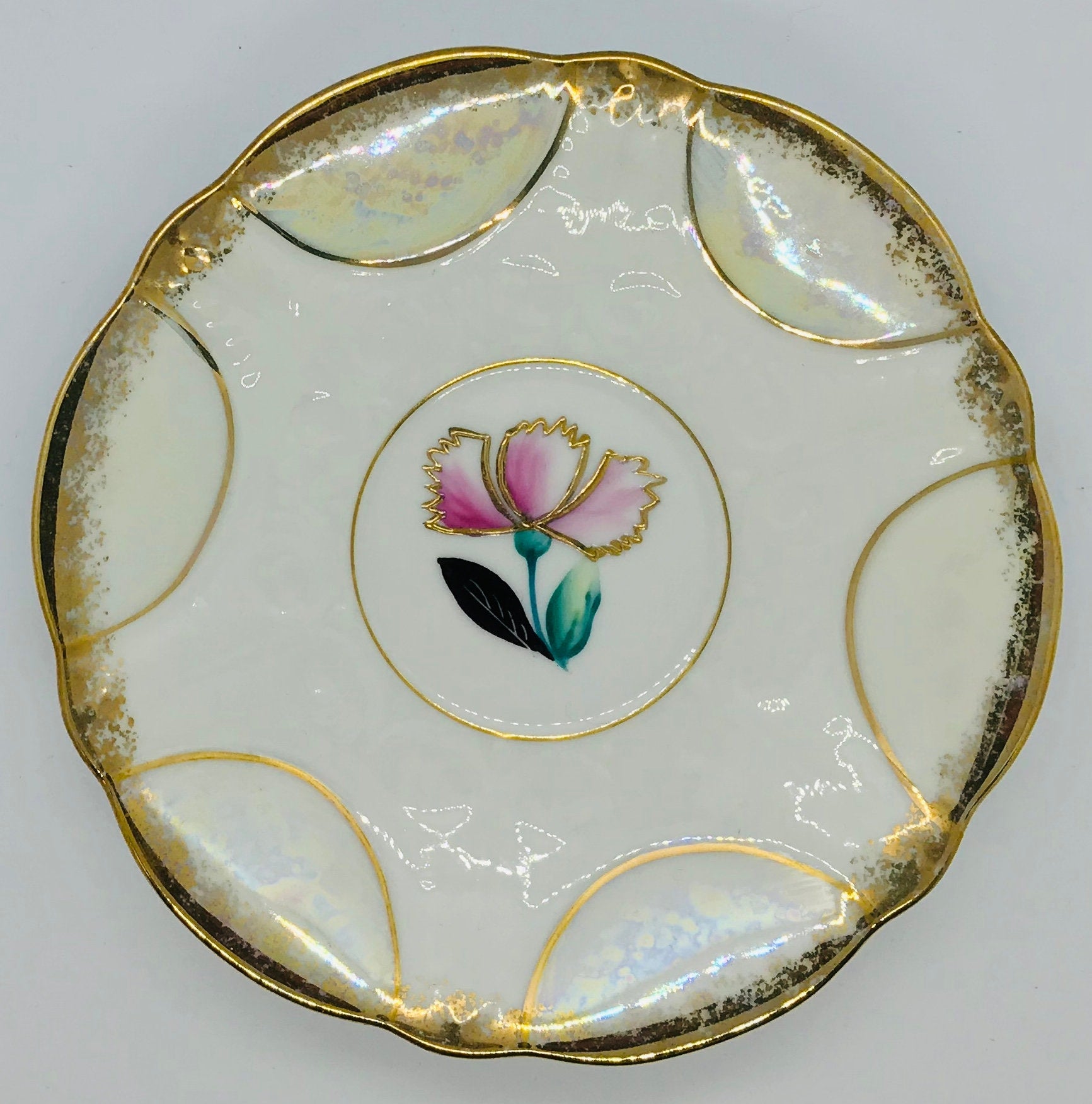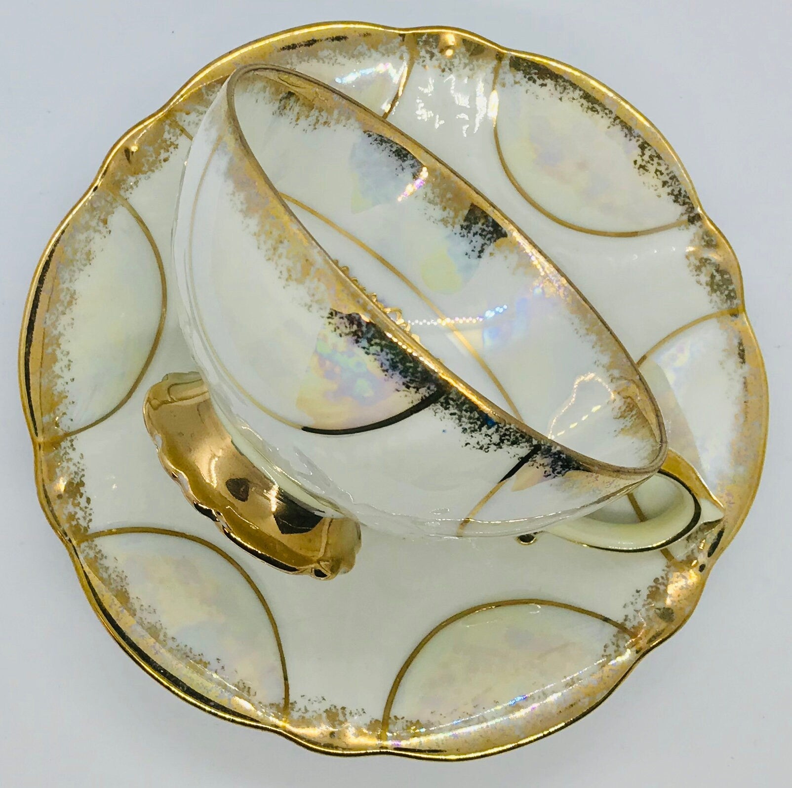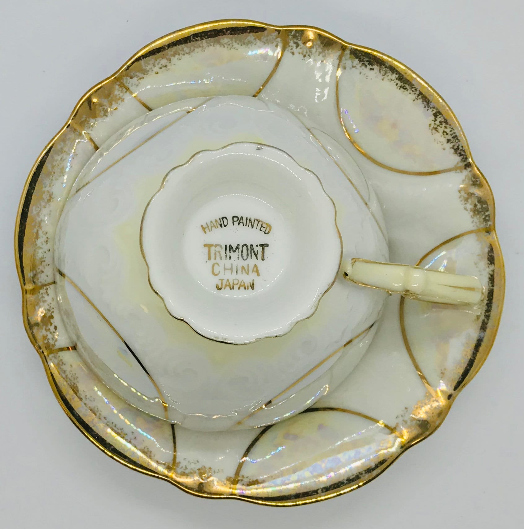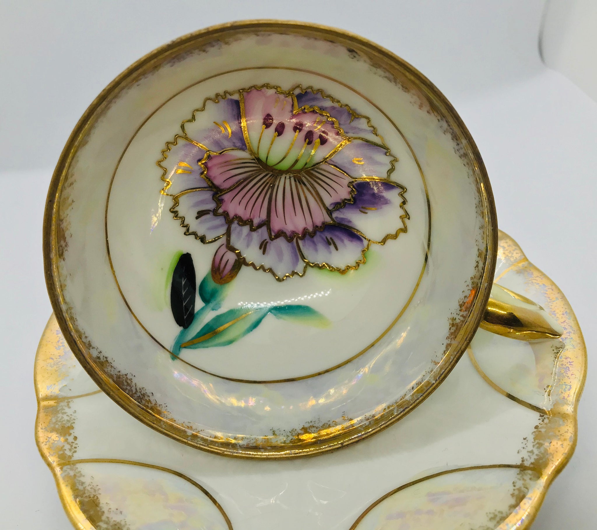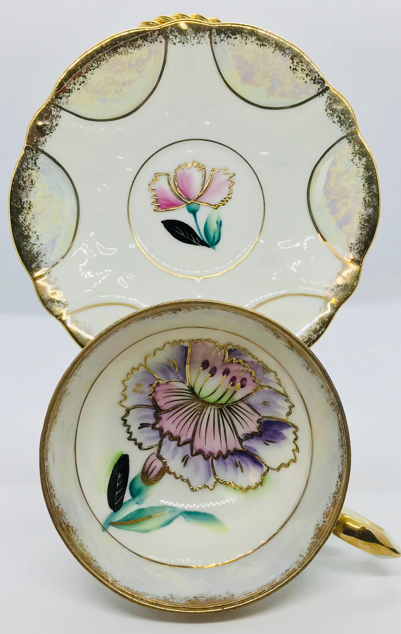 Stunning hand painted Trimont China, made in Japan pedestal teacup and saucer. Gorgeous iridescent duo with a lovely flower, outlined in gold. The teacup has a gold pedestal base, and both pieces have gold detailing, raised embellishments and drizzled gold trim. So special!