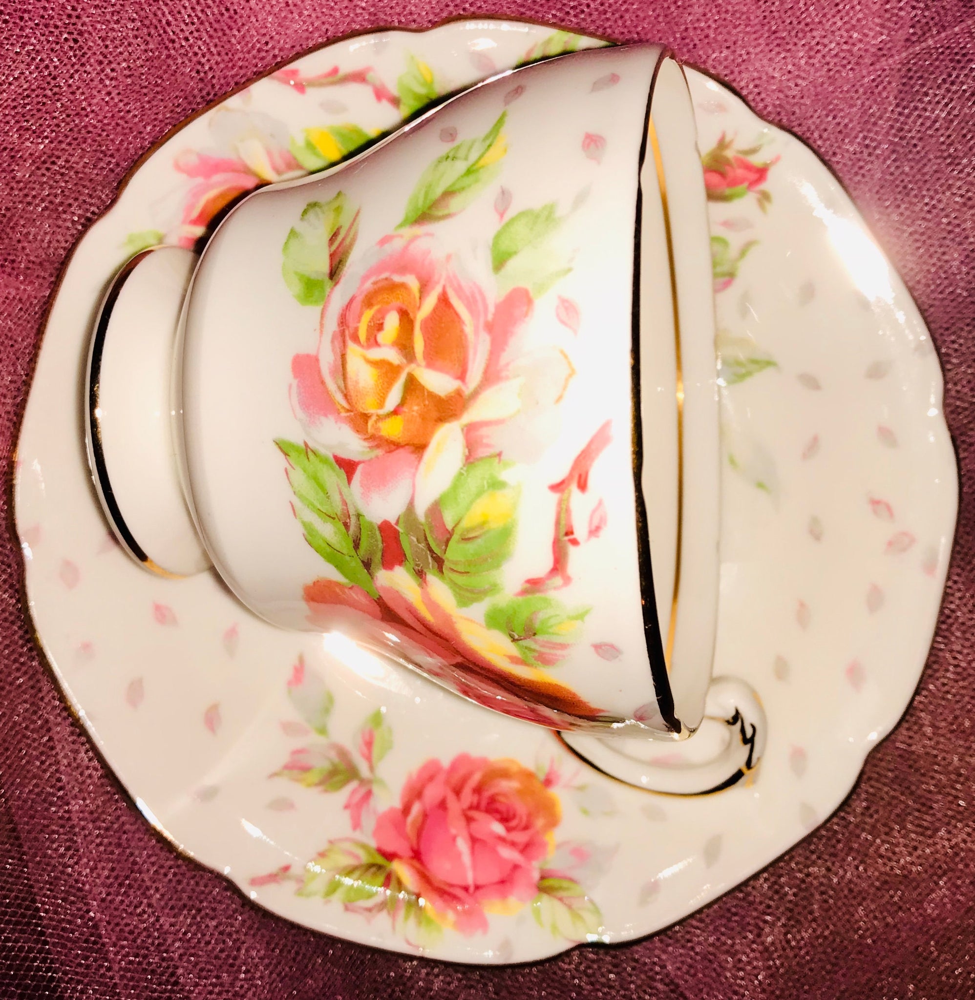 This is an absolutely romantic Paragon Royal Warrant duo. The pedestal teacup and saucer has a crisp white background with fabulous pink and yellow cabbage roses, scalloped edges and gold trim.