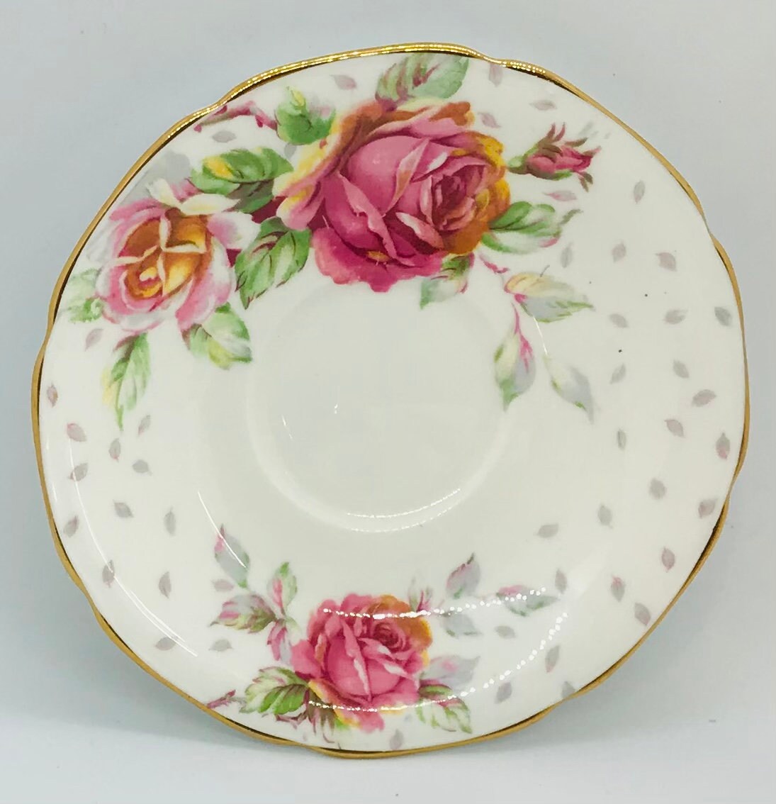 This is an absolutely romantic Paragon Royal Warrant duo. The pedestal teacup and saucer has a crisp white background with fabulous pink and yellow cabbage roses, scalloped edges and gold trim. This set is priced so low due to the gold wear to the teacup rim. Otherwise beautiful condition.