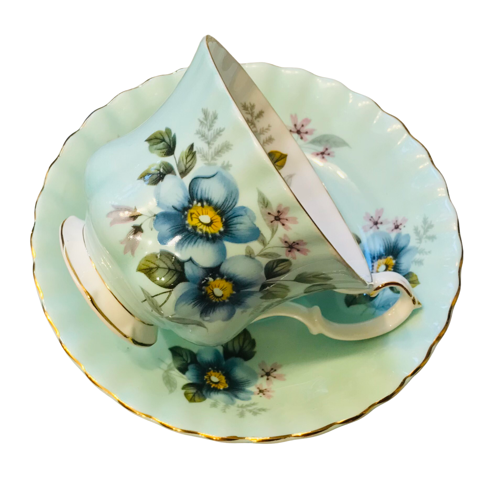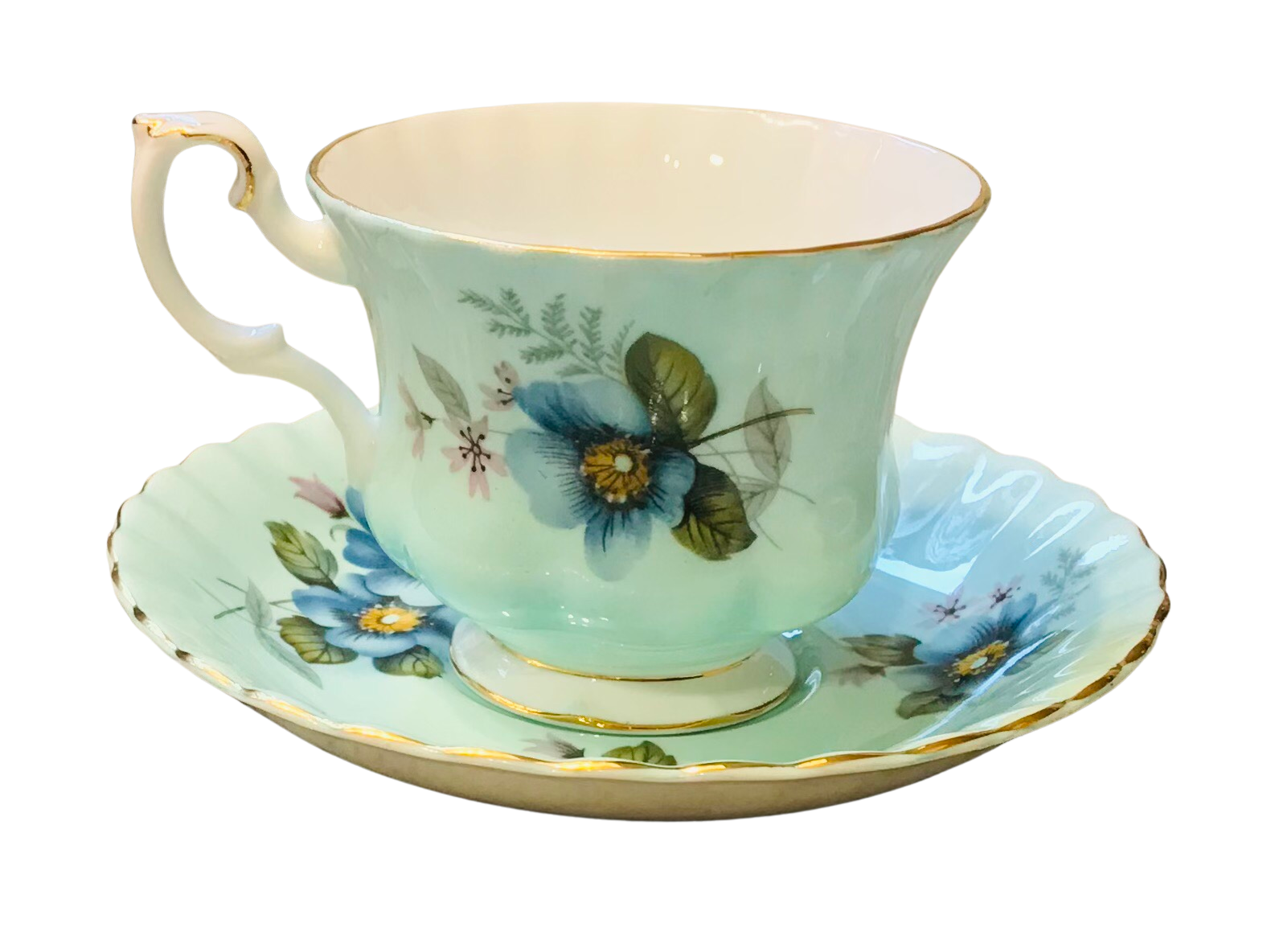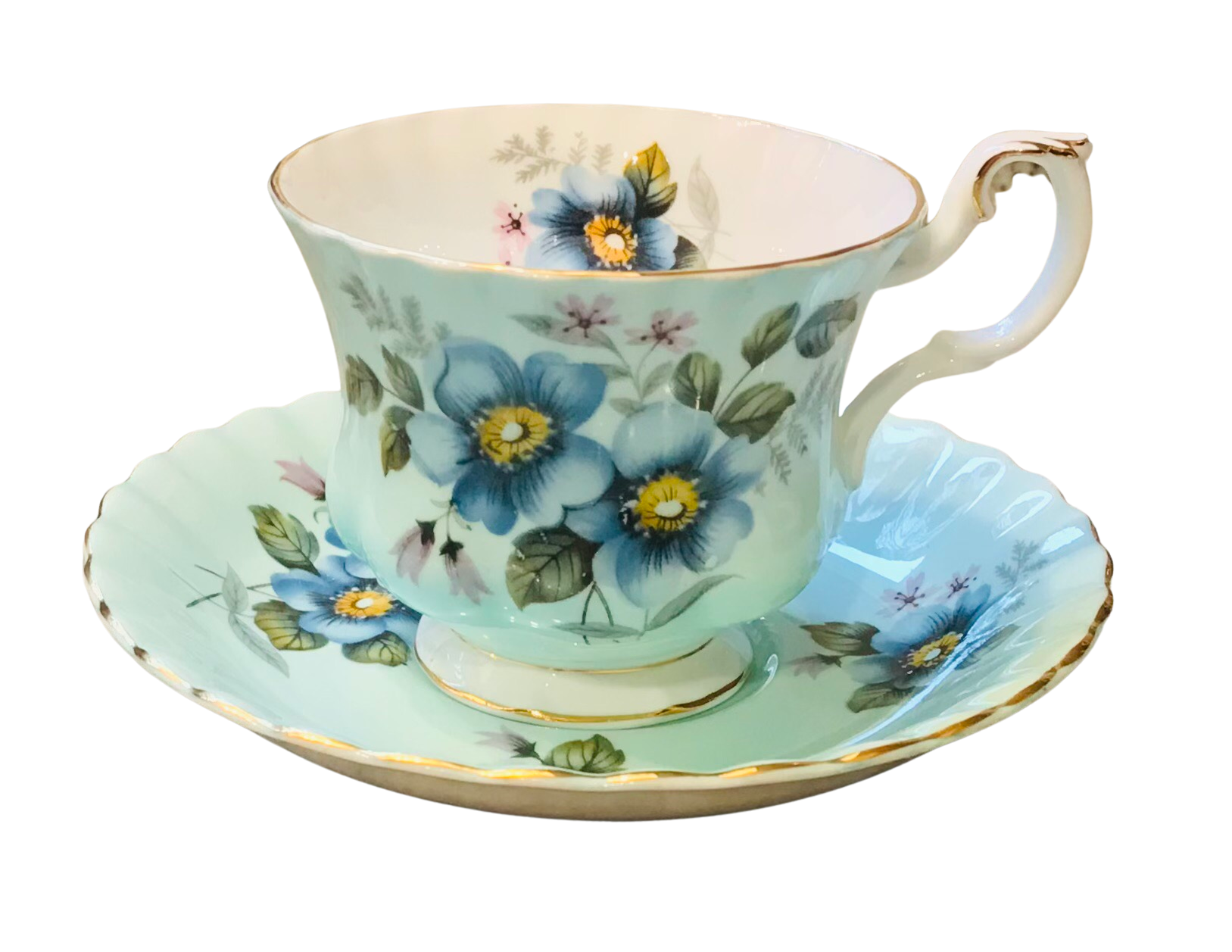 I absolutely love the background colour on this Royal Albert teacup and saucer! A gorgeous blue adorned with lovely blue and yellow flowers and greenery. Numbered 4501. Gold trim.