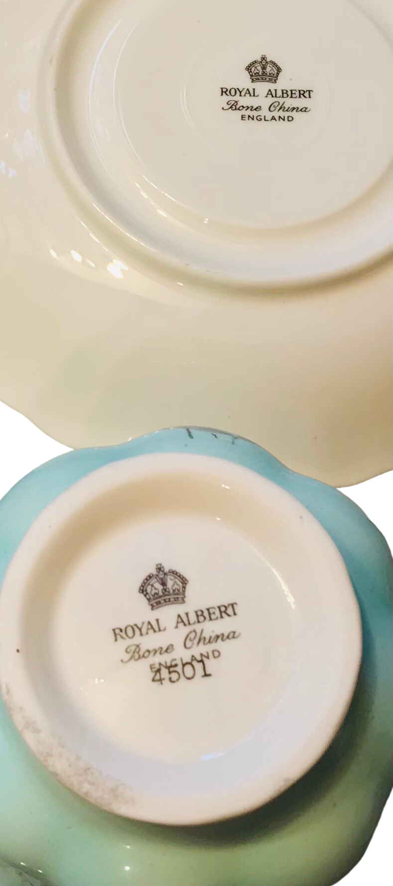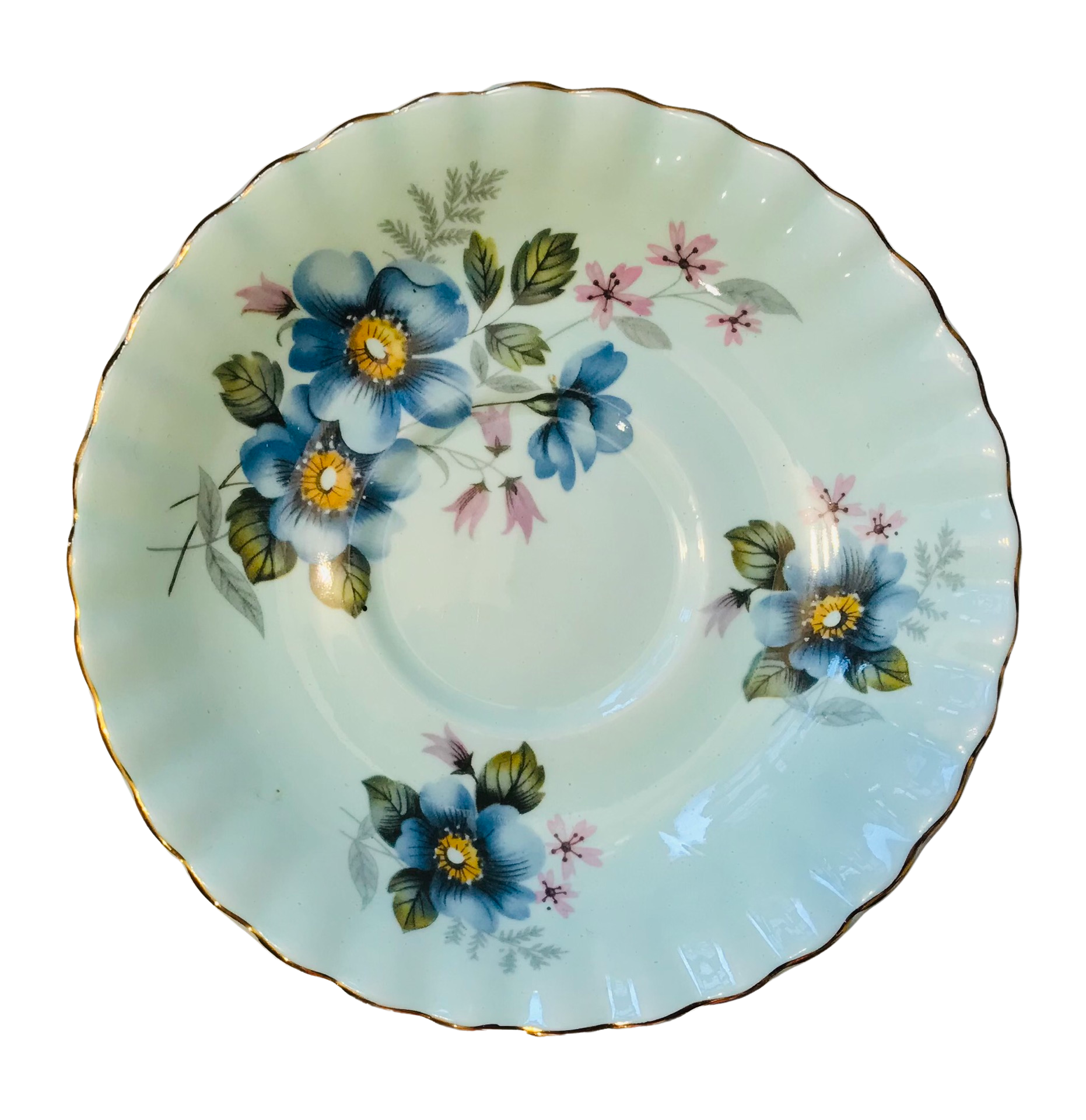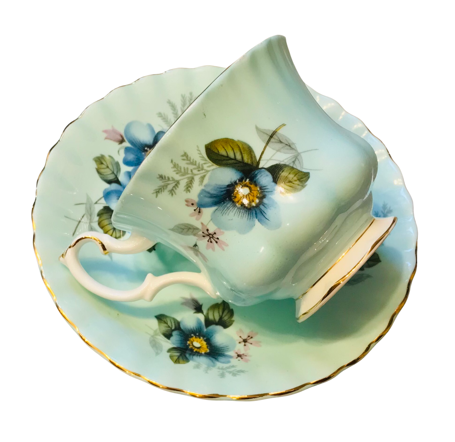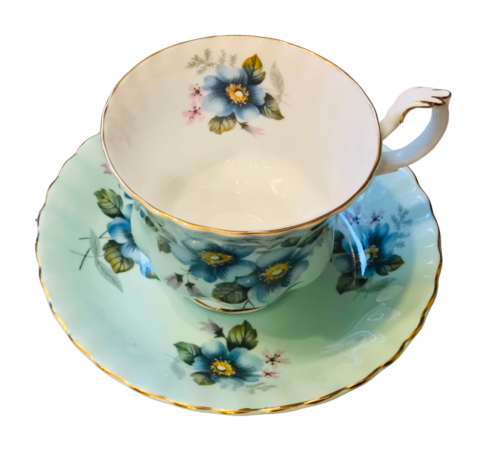 I absolutely love the background colour on this Royal Albert teacup and saucer! A gorgeous blue adorned with lovely blue and yellow flowers and greenery. Numbered 4501. Gold trim.
