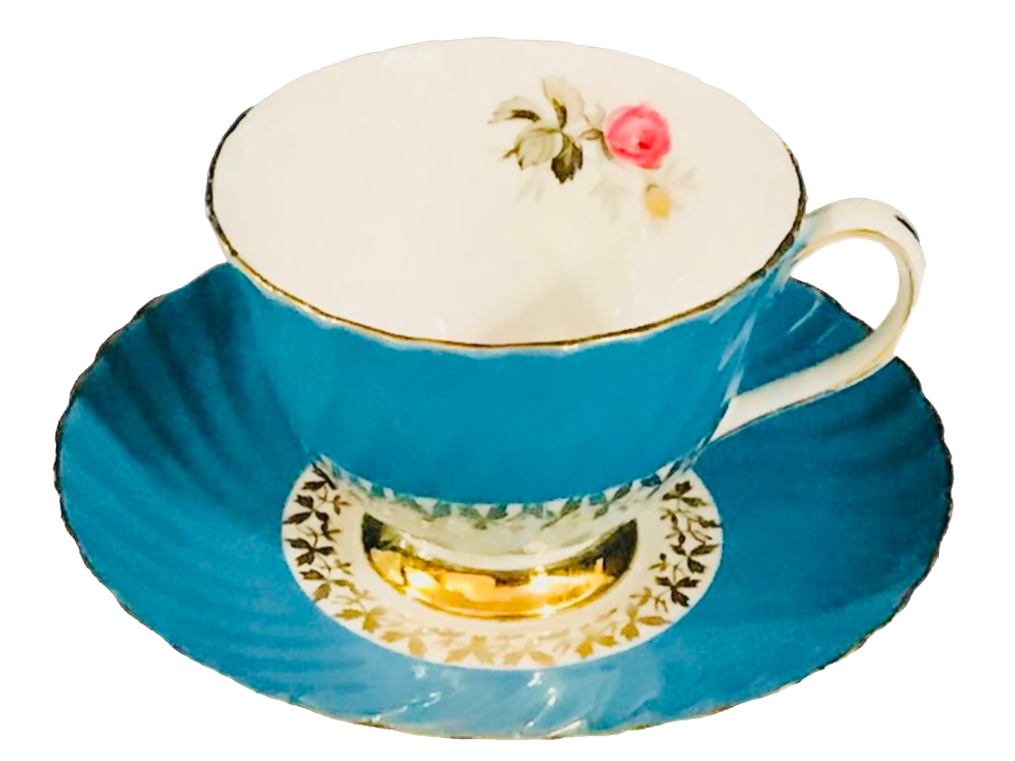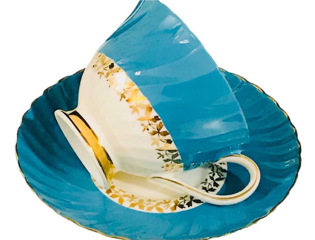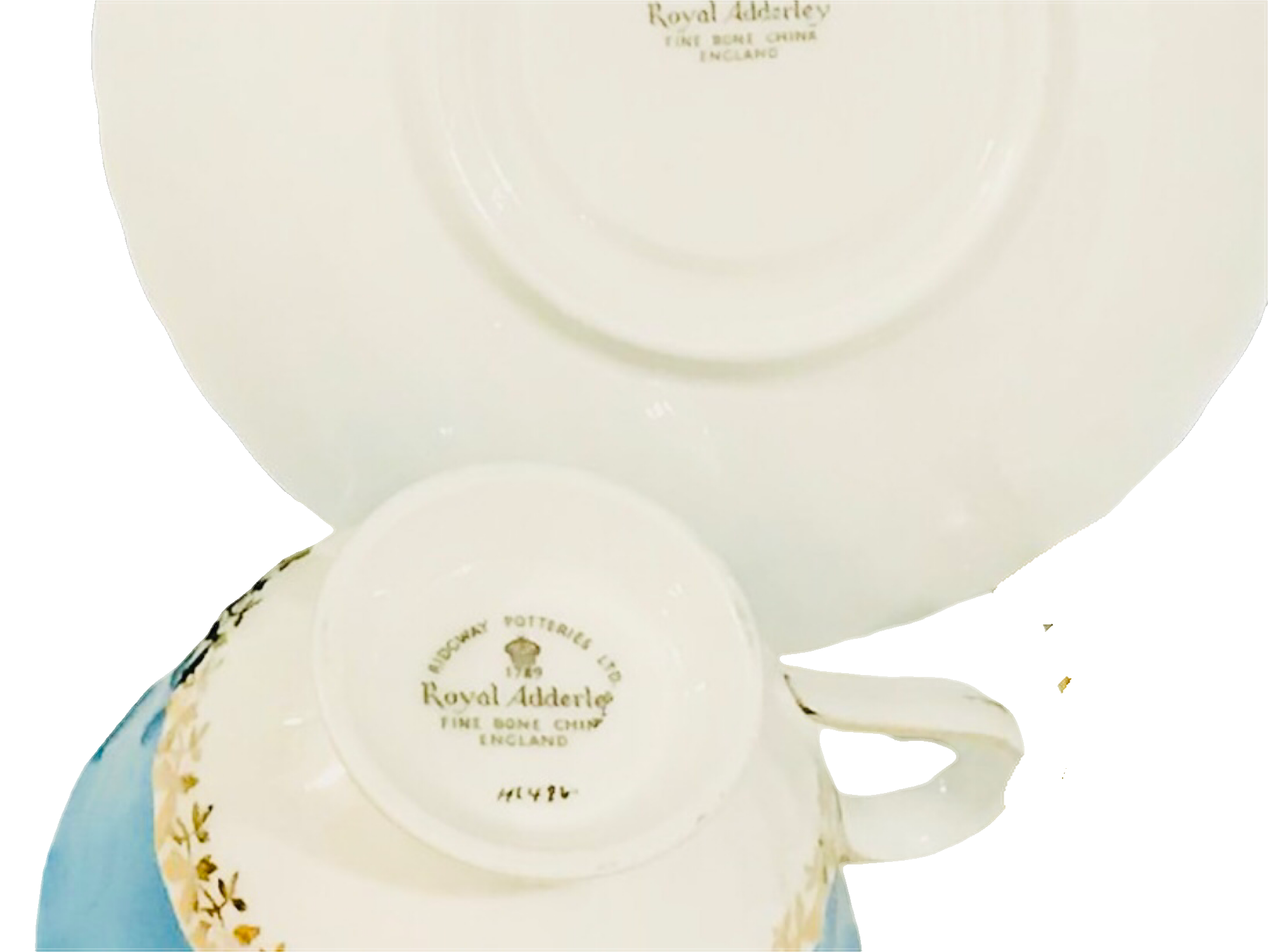 Pretty Royal Adderley duo, made in England. Swirled turquoise blue set with gold detailing, teacup base and gold trim. Numbered what looks like H6486.