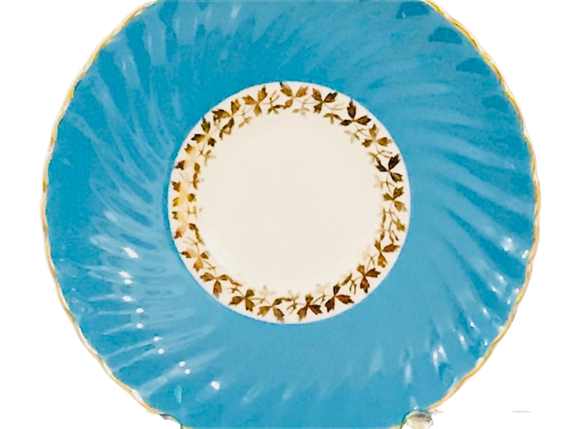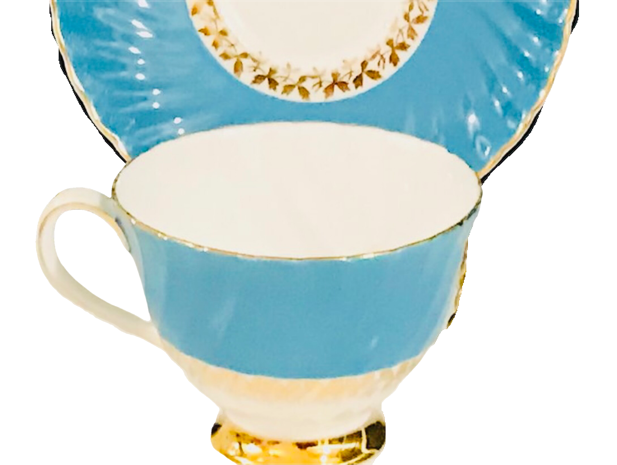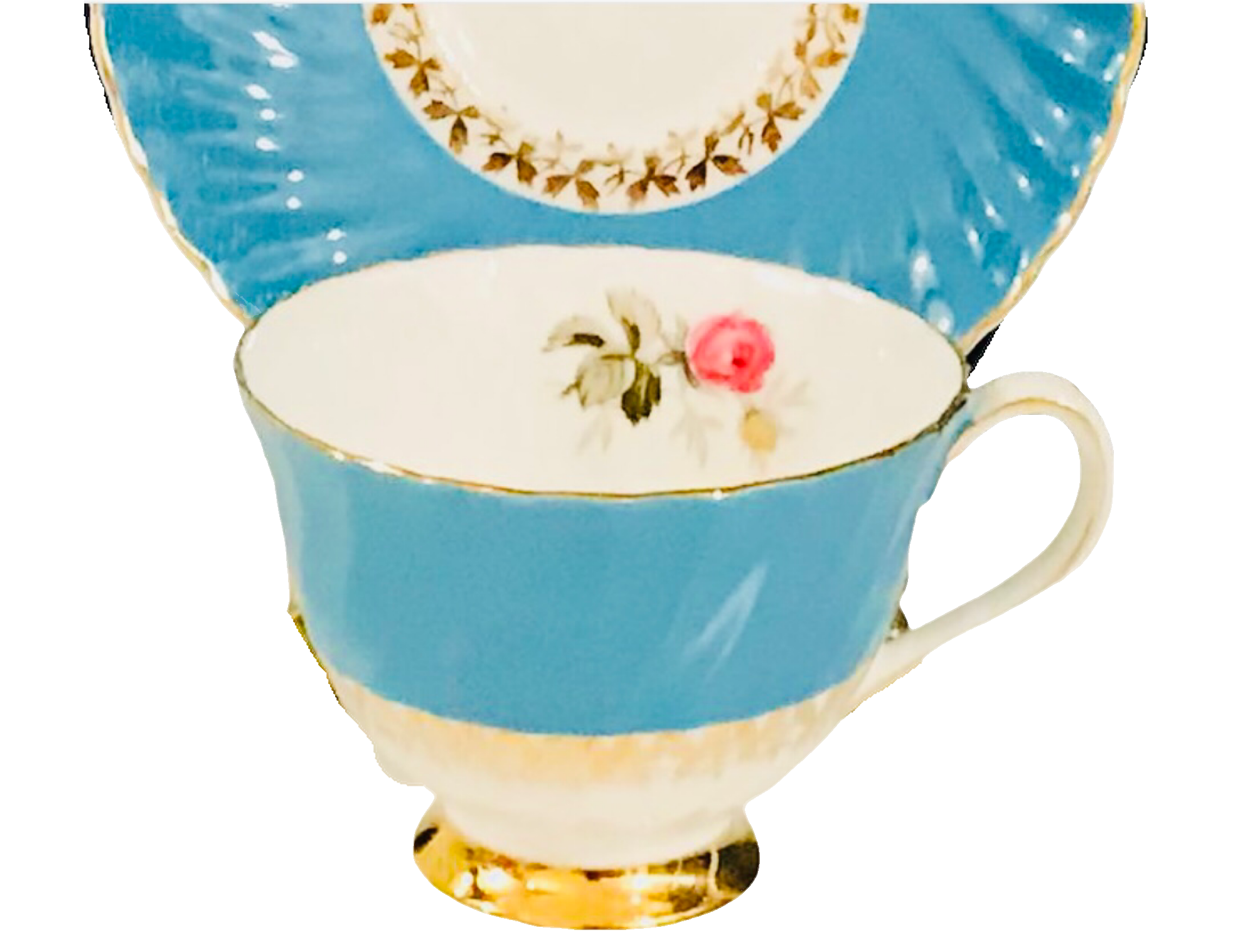 Pretty Royal Adderley duo, made in England. Swirled turquoise blue set with gold detailing, teacup base and gold trim. Numbered what looks like H6486.